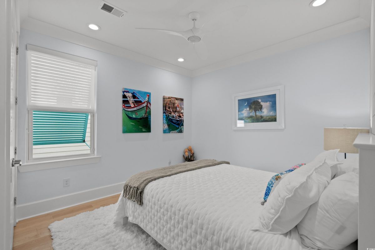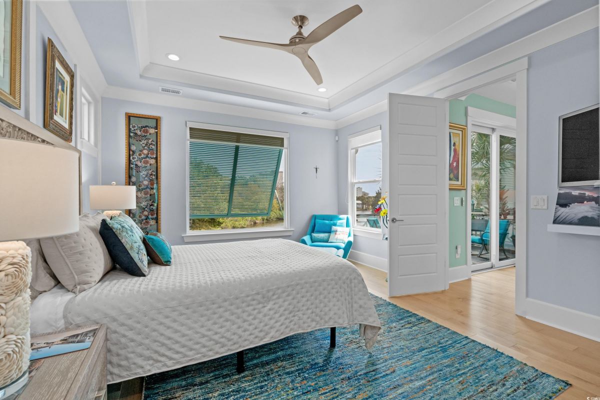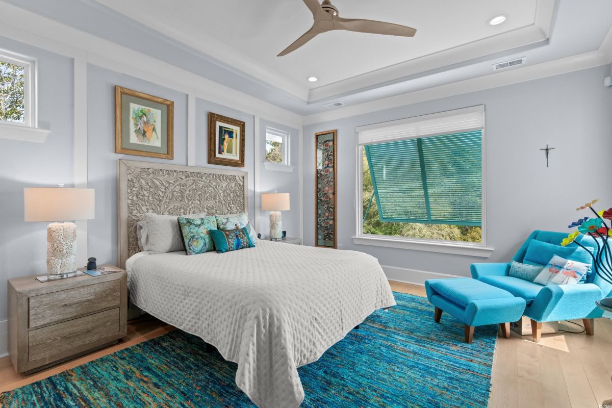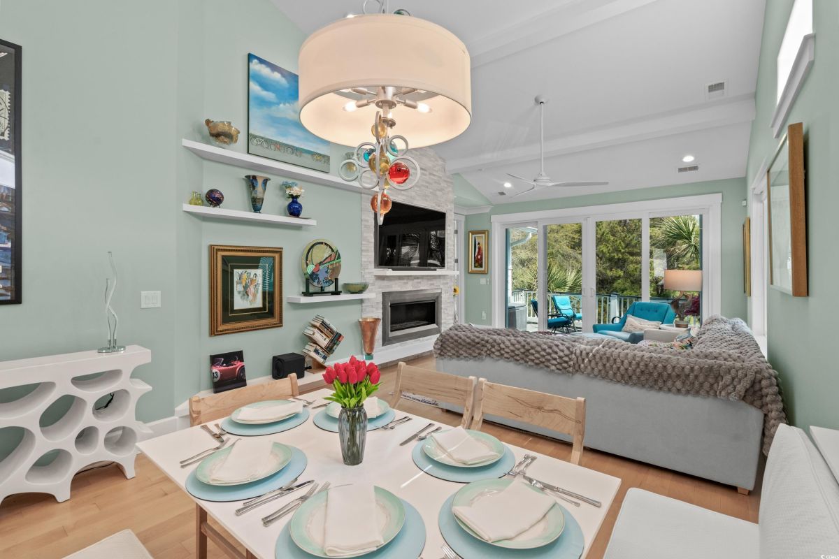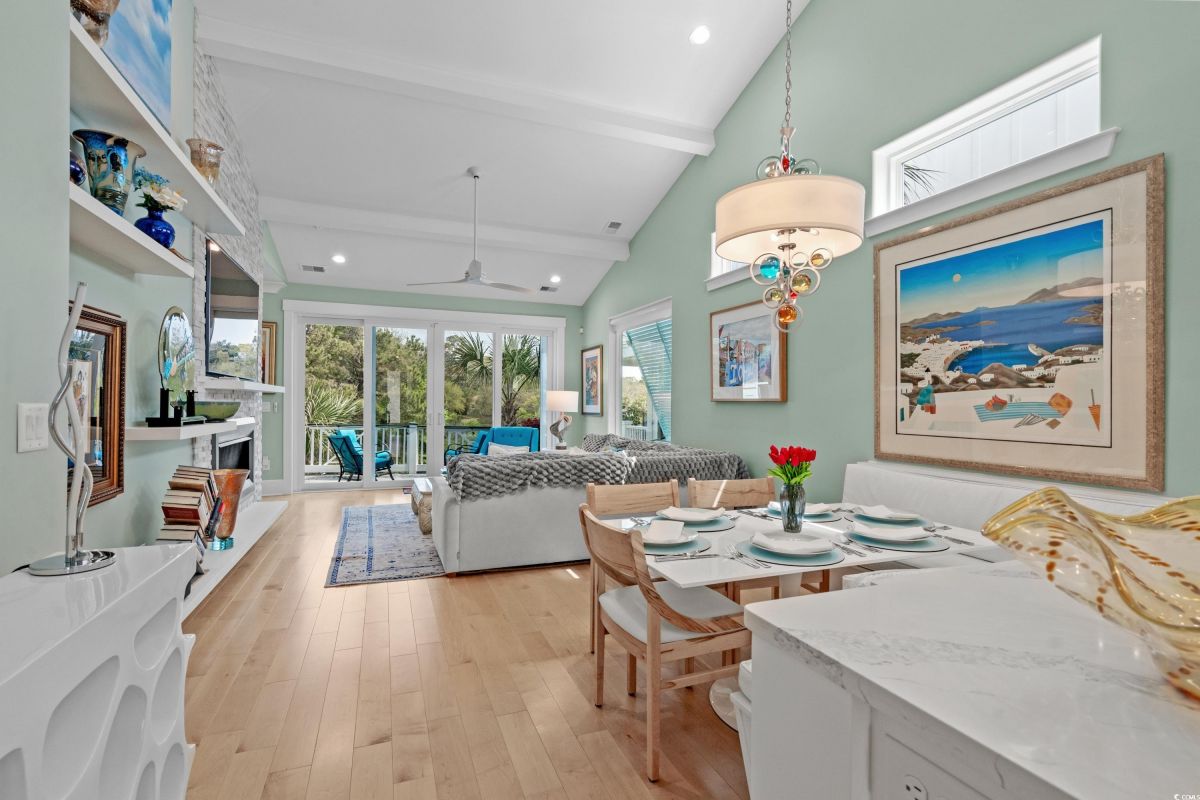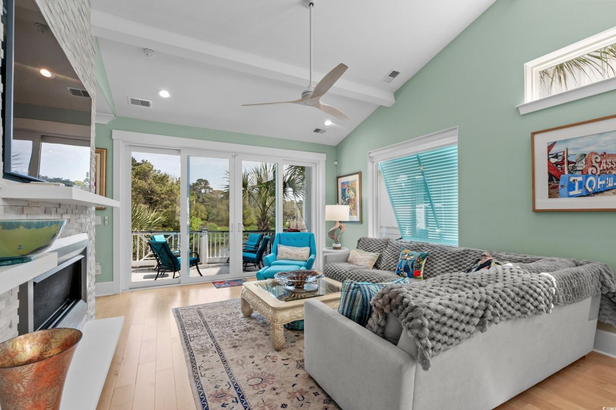 ONLY HOME AVAILABLE!!! Nestled in the exclusive gated community of Ocean Village along the prestigious “Golden Mile” of Myrtle Beach, this stunning 4-bedroom, 3-bath home offers luxury coastal living at its finest. Ocean Village is a collection of 33 cottage homes, at a fabulous location across from the beach. No short term rentals allowed!!! Low HOA!!! A natural gas community, this home boasts an open-concept design and quaint features throughout the home. As you enter through the foyer, the laundry area to the right, and then garage entry to the left makes it nice for access to the kitchen. The layout of the Kitchen is a nice size and has it all; Custom designed backsplash, quartz countertops, custom maple cabinets, work island, stainless steel appliances, a custom pantry and a dining area that has custom built in seating. The living room features a vaulted beam ceiling and cozy linear gas fireplace. The owner's eye to detail shows throughout the interior and exterior of the Home... So many Cool Touches!!! There are Hardwood Floors though out the first floor and all bathrooms. Sliding doors off the living room lead to a spacious rear deck overlooking a serene tidal lake, perfect for relaxing or entertaining. The Natural setting changes daily with a number of different species of WILD LIFE that flock to this Lake... YOU SEE IT ALL!!! The deck brings the outside to the inside with a full coverage awning for shade. Plenty of Space for grilling and for your herb garden. The main-floor master suite is a private retreat with a tray ceiling, wall of glass windows, sitting area overlooking the lake, a spa-like bathroom with dual vanities, a makeup counter, a large walk-in shower, and a custom maple closet system. Also, located on the main level is a guest bedroom, a full bathroom, and a convenient laundry room. Midway up to the second floor to the left over the garage is a third spacious bedroom. On the second floor, you will find a fourth guest suite with full bath and a huge custom designed closet. There is ample space for family and friends. The home also includes a temperature controlled two-car attached garage, and a charming backyard sitting area along with a covered porch with swing, where you can enjoy the coastal breeze and scenic lake views. The lot features mature landscaping and lighting. The back yard has entry gates on both sides plus lots of storage under home. Ocean Village amenities include "Live Oak Park," which features a beautiful outdoor pool, a grill area, hammocks, lounges, showers, and restrooms, plus access to tennis and basketball courts - all with low HOA fees. The iconic Oak Tree embraces the natural setting of the pool and grill area. Centrally located near the best shopping, dining, and attractions of Myrtle Beach, this home is a rare find. This is your chance to live in this remarkable community! A golf cart ride to so MANY wonderful eateries!!!