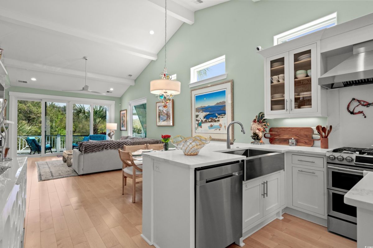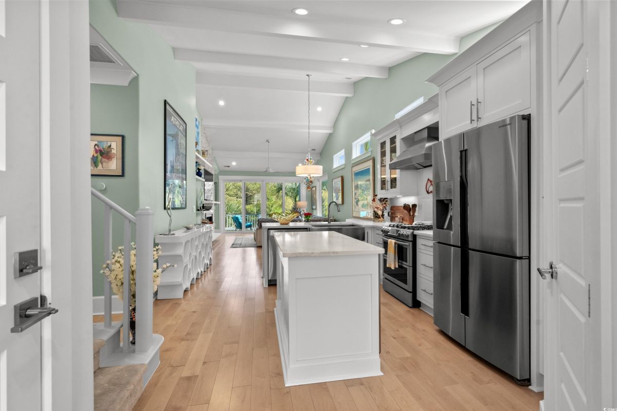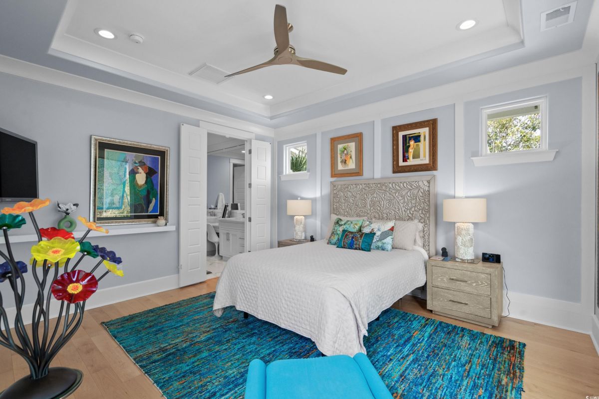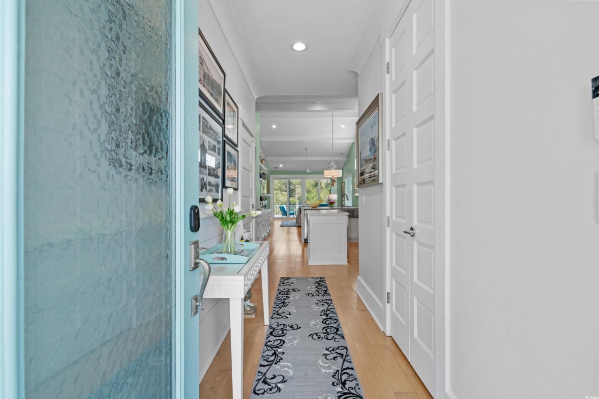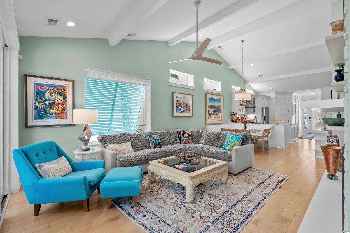 ONLY HOME AVAILABLE!!! Nestled in the exclusive gated community of Ocean Village along the prestigious “Golden Mile” of Myrtle Beach, this stunning 4-bedroom, 3-bath home offers luxury coastal living at its finest. Ocean Village is a collection of 33 cottage homes, at a fabulous location across from the beach. No short term rentals allowed!!! Low HOA!!! A natural gas community, this home boasts an open-concept design and quaint features throughout the home. As you enter through the foyer, the laundry area to the right, and then garage entry to the left makes it nice for access to the kitchen. The layout of the Kitchen is a nice size and has it all; Custom designed backsplash, quartz countertops, custom maple cabinets, work island, stainless steel appliances, a custom pantry and a dining area that has custom built in seating. The living room features a vaulted beam ceiling and cozy linear gas fireplace. The owner's eye to detail shows throughout the interior and exterior of the Home... So many Cool Touches!!! There are Hardwood Floors though out the first floor and all bathrooms. Sliding doors off the living room lead to a spacious rear deck overlooking a serene tidal lake, perfect for relaxing or entertaining. The Natural setting changes daily with a number of different species of WILD LIFE that flock to this Lake... YOU SEE IT ALL!!! The deck brings the outside to the inside with a full coverage awning for shade. Plenty of Space for grilling and for your herb garden. The main-floor master suite is a private retreat with a tray ceiling, wall of glass windows, sitting area overlooking the lake, a spa-like bathroom with dual vanities, a makeup counter, a large walk-in shower, and a custom maple closet system. Also, located on the main level is a guest bedroom, a full bathroom, and a convenient laundry room. Midway up to the second floor to the left over the garage is a third spacious bedroom. On the second floor, you will find a fourth guest suite with full bath and a huge custom designed closet. There is ample space for family and friends. The home also includes a temperature controlled two-car attached garage, and a charming backyard sitting area along with a covered porch with swing, where you can enjoy the coastal breeze and scenic lake views. The lot features mature landscaping and lighting. The back yard has entry gates on both sides plus lots of storage under home. Ocean Village amenities include "Live Oak Park," which features a beautiful outdoor pool, a grill area, hammocks, lounges, showers, and restrooms, plus access to tennis and basketball courts - all with low HOA fees. The iconic Oak Tree embraces the natural setting of the pool and grill area. Centrally located near the best shopping, dining, and attractions of Myrtle Beach, this home is a rare find. This is your chance to live in this remarkable community! A golf cart ride to so MANY wonderful eateries!!!