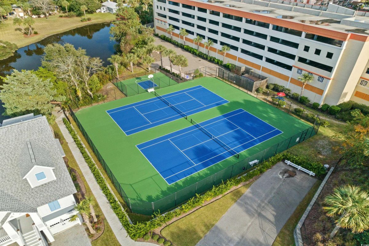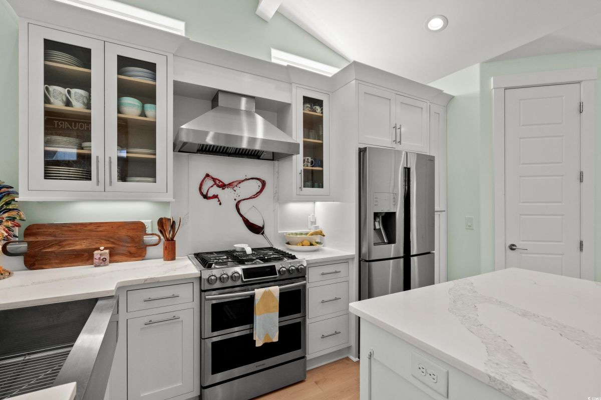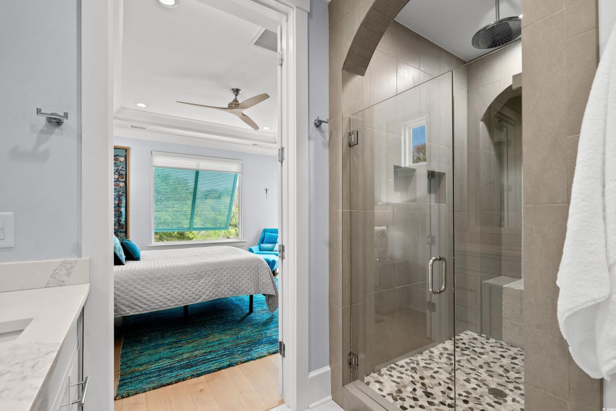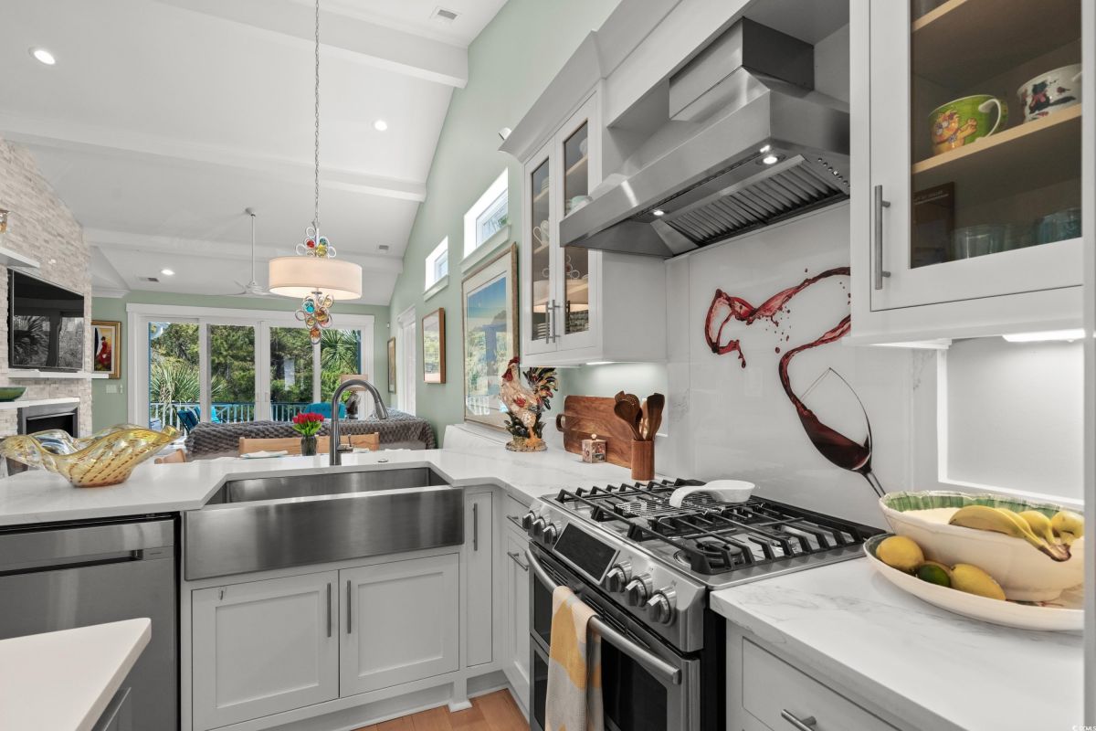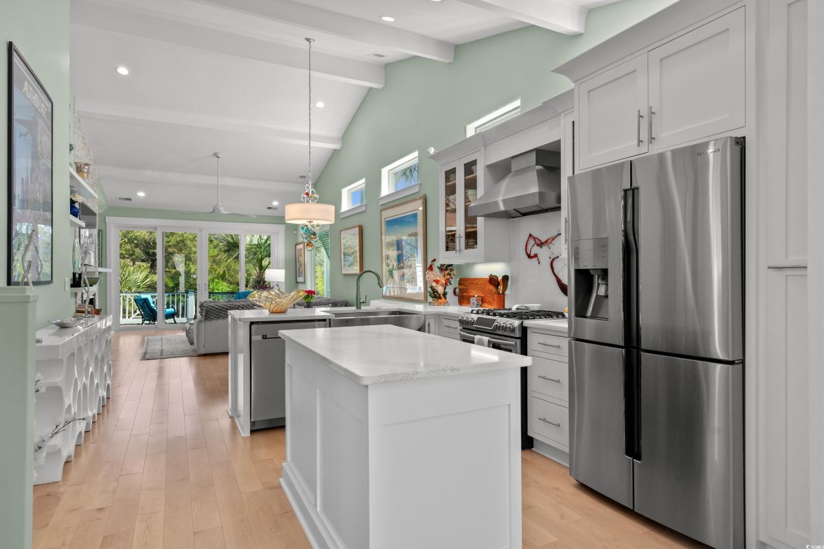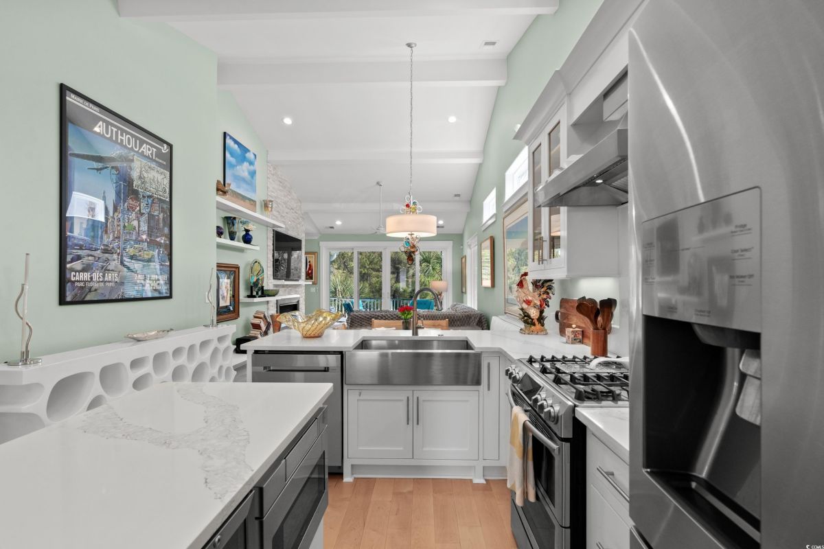 ONLY HOME AVAILABLE!!! Nestled in the exclusive gated community of Ocean Village along the prestigious “Golden Mile” of Myrtle Beach, this stunning 4-bedroom, 3-bath home offers luxury coastal living at its finest. Ocean Village is a collection of 33 cottage homes, at a fabulous location across from the beach. No short term rentals allowed!!! Low HOA!!! A natural gas community, this home boasts an open-concept design and quaint features throughout the home. As you enter through the foyer, the laundry area to the right, and then garage entry to the left makes it nice for access to the kitchen. The layout of the Kitchen is a nice size and has it all; Custom designed backsplash, quartz countertops, custom maple cabinets, work island, stainless steel appliances, a custom pantry and a dining area that has custom built in seating. The living room features a vaulted beam ceiling and cozy linear gas fireplace. The owner's eye to detail shows throughout the interior and exterior of the Home... So many Cool Touches!!! There are Hardwood Floors though out the first floor and all bathrooms. Sliding doors off the living room lead to a spacious rear deck overlooking a serene tidal lake, perfect for relaxing or entertaining. The Natural setting changes daily with a number of different species of WILD LIFE that flock to this Lake... YOU SEE IT ALL!!! The deck brings the outside to the inside with a full coverage awning for shade. Plenty of Space for grilling and for your herb garden. The main-floor master suite is a private retreat with a tray ceiling, wall of glass windows, sitting area overlooking the lake, a spa-like bathroom with dual vanities, a makeup counter, a large walk-in shower, and a custom maple closet system. Also, located on the main level is a guest bedroom, a full bathroom, and a convenient laundry room. Midway up to the second floor to the left over the garage is a third spacious bedroom. On the second floor, you will find a fourth guest suite with full bath and a huge custom designed closet. There is ample space for family and friends. The home also includes a temperature controlled two-car attached garage, and a charming backyard sitting area along with a covered porch with swing, where you can enjoy the coastal breeze and scenic lake views. The lot features mature landscaping and lighting. The back yard has entry gates on both sides plus lots of storage under home. Ocean Village amenities include "Live Oak Park," which features a beautiful outdoor pool, a grill area, hammocks, lounges, showers, and restrooms, plus access to tennis and basketball courts - all with low HOA fees. The iconic Oak Tree embraces the natural setting of the pool and grill area. Centrally located near the best shopping, dining, and attractions of Myrtle Beach, this home is a rare find. This is your chance to live in this remarkable community! A golf cart ride to so MANY wonderful eateries!!!
