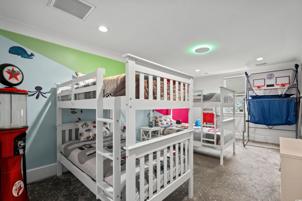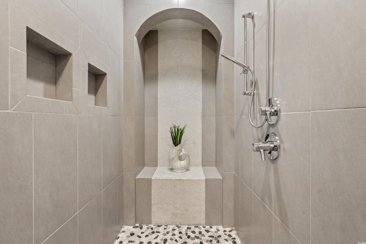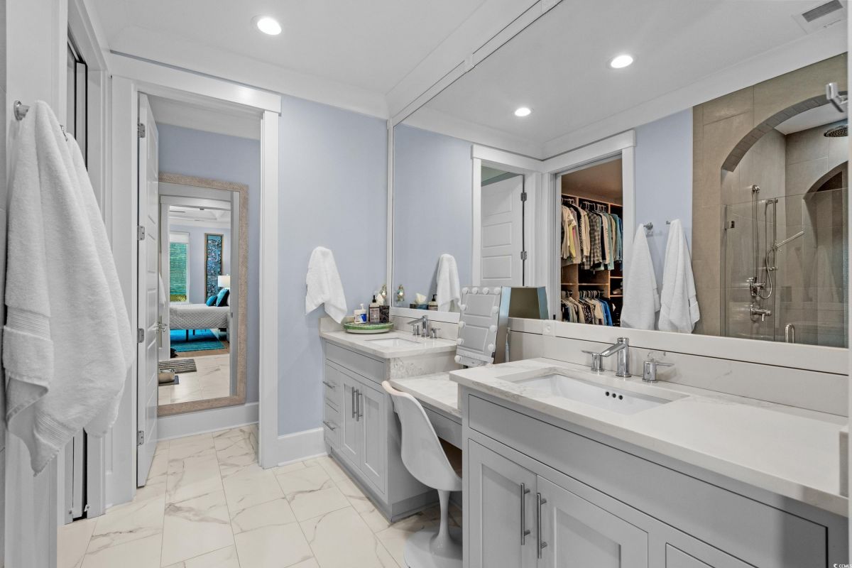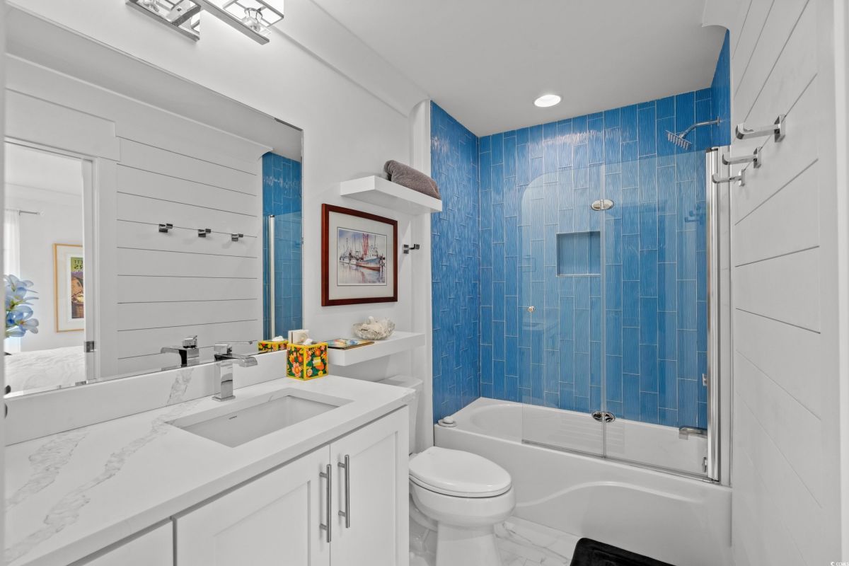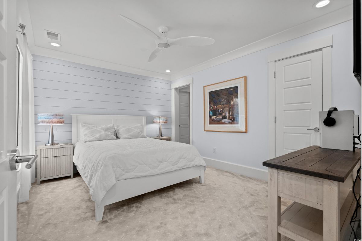 ONLY HOME AVAILABLE!!! Nestled in the exclusive gated community of Ocean Village along the prestigious “Golden Mile” of Myrtle Beach, this stunning 4-bedroom, 3-bath home offers luxury coastal living at its finest. Ocean Village is a collection of 33 cottage homes, at a fabulous location across from the beach. No short term rentals allowed!!! Low HOA!!! A natural gas community, this home boasts an open-concept design and quaint features throughout the home. As you enter through the foyer, the laundry area to the right, and then garage entry to the left makes it nice for access to the kitchen. The layout of the Kitchen is a nice size and has it all; Custom designed backsplash, quartz countertops, custom maple cabinets, work island, stainless steel appliances, a custom pantry and a dining area that has custom built in seating. The living room features a vaulted beam ceiling and cozy linear gas fireplace. The owner's eye to detail shows throughout the interior and exterior of the Home... So many Cool Touches!!! There are Hardwood Floors though out the first floor and all bathrooms. Sliding doors off the living room lead to a spacious rear deck overlooking a serene tidal lake, perfect for relaxing or entertaining. The Natural setting changes daily with a number of different species of WILD LIFE that flock to this Lake... YOU SEE IT ALL!!! The deck brings the outside to the inside with a full coverage awning for shade. Plenty of Space for grilling and for your herb garden. The main-floor master suite is a private retreat with a tray ceiling, wall of glass windows, sitting area overlooking the lake, a spa-like bathroom with dual vanities, a makeup counter, a large walk-in shower, and a custom maple closet system. Also, located on the main level is a guest bedroom, a full bathroom, and a convenient laundry room. Midway up to the second floor to the left over the garage is a third spacious bedroom. On the second floor, you will find a fourth guest suite with full bath and a huge custom designed closet. There is ample space for family and friends. The home also includes a temperature controlled two-car attached garage, and a charming backyard sitting area along with a covered porch with swing, where you can enjoy the coastal breeze and scenic lake views. The lot features mature landscaping and lighting. The back yard has entry gates on both sides plus lots of storage under home. Ocean Village amenities include "Live Oak Park," which features a beautiful outdoor pool, a grill area, hammocks, lounges, showers, and restrooms, plus access to tennis and basketball courts - all with low HOA fees. The iconic Oak Tree embraces the natural setting of the pool and grill area. Centrally located near the best shopping, dining, and attractions of Myrtle Beach, this home is a rare find. This is your chance to live in this remarkable community! A golf cart ride to so MANY wonderful eateries!!!
