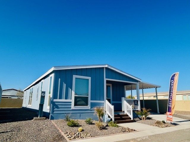 This 1508 square feet, 2.0 Master bedroom 2.5 bath Manufactured Home in the Coppersun community in El Mirage, AZ was built in 2023 by Cavco. The home features a spacious Master Bedroom with a Walk-In Closet, a cozy Breakfast Nook, a spacious Living Room, a modern Kitchen with stainless steel appliances, and a convenient Laundry Room. The exterior of the home boasts a Carport for parking, a Covered Porch for outdoor relaxation. Interior features include an Oven, Dishwasher, Garbage Disposal, Central A/C, Electric heating, Stainless Steel Appliances, Fridge, Microwave, Hot Water Heater, and Washer/Dryer Hook Up. Coppersun is a charming community located in El Mirage, AZ, offering residents a peaceful and welcoming environment to call home. The community features various amenities such as a clubhouse, swimming pool, fitness center, and walking trails for residents to enjoy. With friendly neighbors and beautifully landscaped grounds, Coppersun provides a sense of community and a high quality of life for its residents. Close to shopping, dining, and entertainment options, this community offers convenience and comfort for those looking for a relaxing lifestyle in El Mirage.