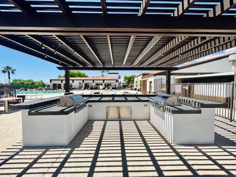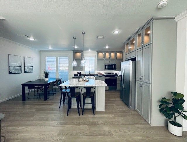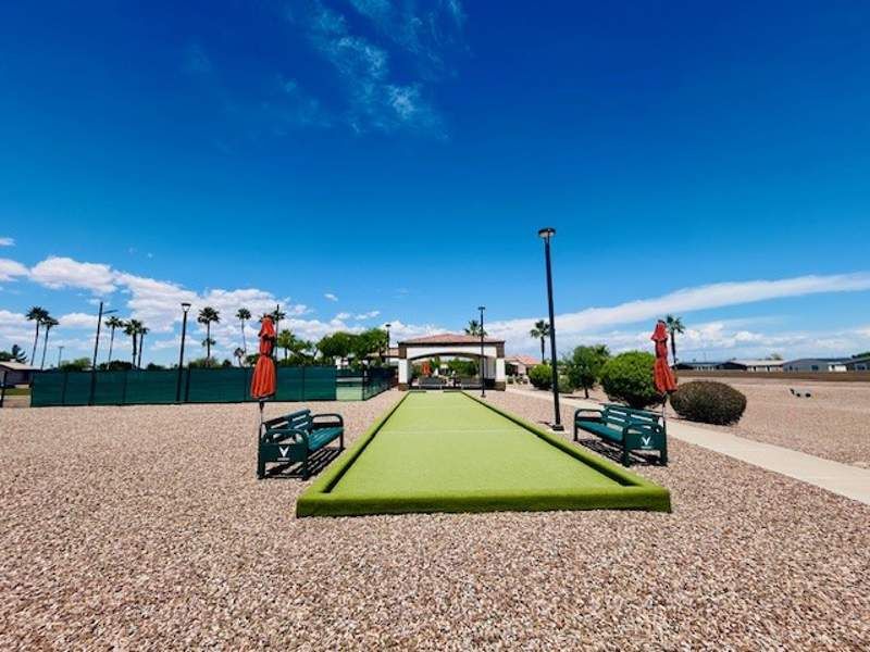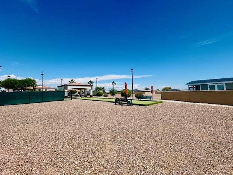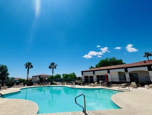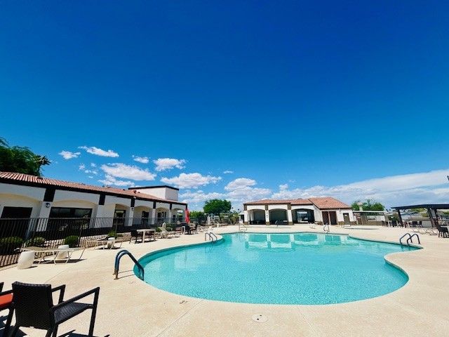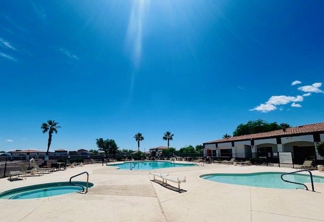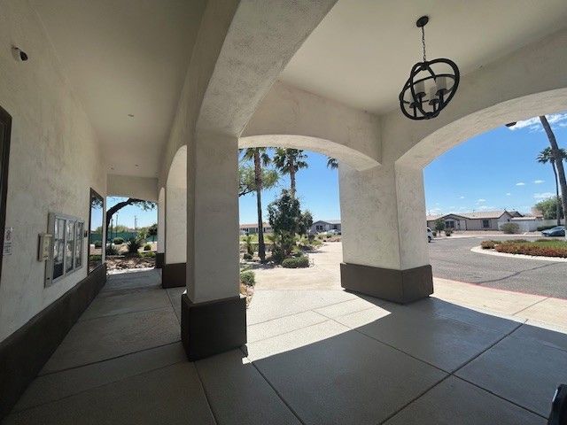 This beautiful home nestled on a corner directly across from the Community Center located in the Coppersun community in El Mirage, AZ offers 3 spacious bedrooms and 2 full bathrooms. Built in 2023 by Cavco, this home features an open floor plan 10Ft ceiling, 8 ft doors, crown molding, a cozy living room, separate dining room for entertaining, a master bedroom with an en-suite bathroom with a large tub and shower, a modern kitchen with all appliances included, and a convenient laundry room. The exterior boasts a carport for parking and a patio for outdoor enjoyment. Coppersun is a vibrant community in El Mirage, AZ offering residents a variety of amenities and activities. Residents can enjoy a clubhouse for social gatherings, a swimming pool for hot days, and a fitness center for staying active. The community also features walking paths, picnic areas, and organized events to bring neighbors together. Located near shopping, dining, and entertainment options, Coppersun provides a comfortable and convenient place to call home in the heart of Arizona.