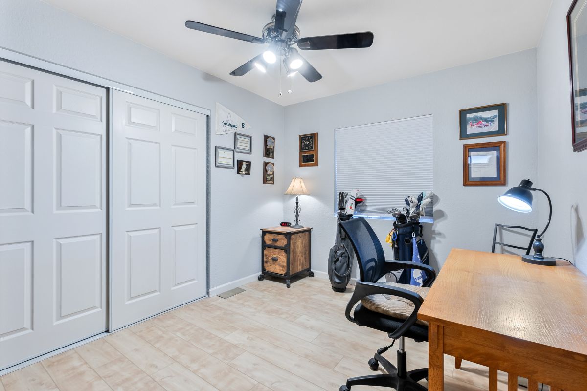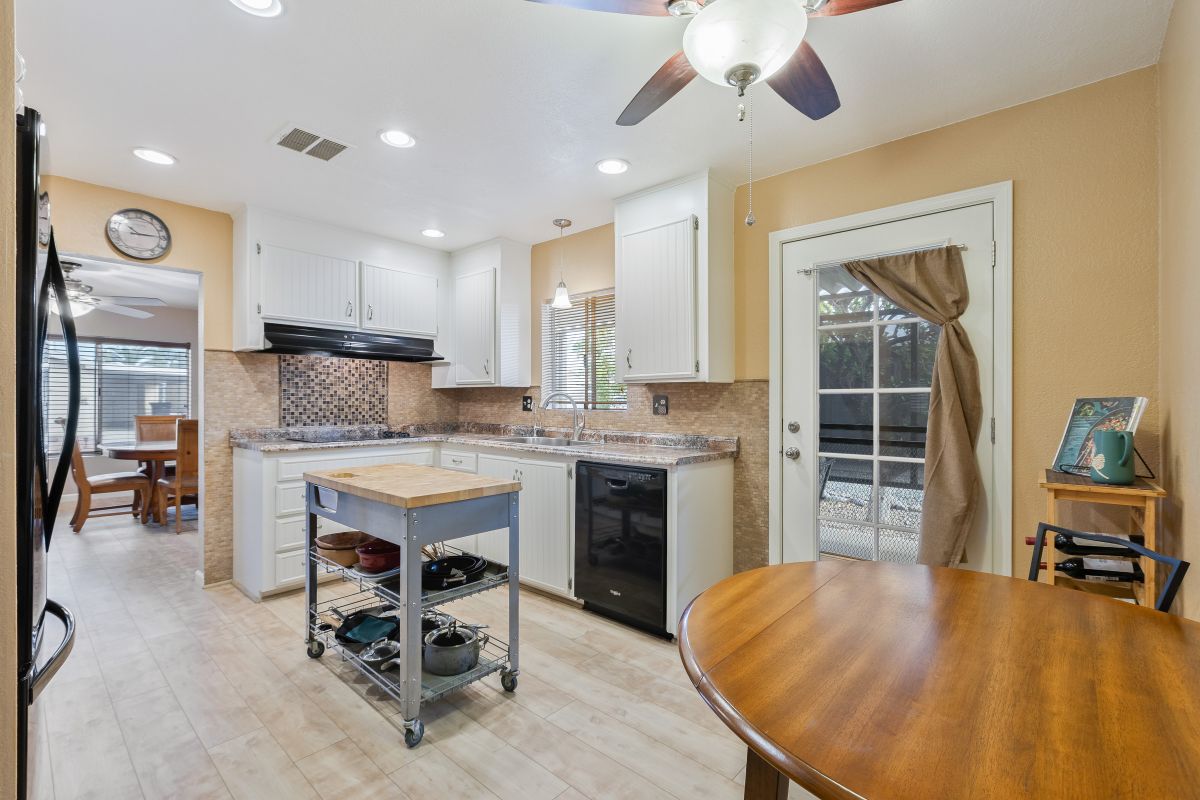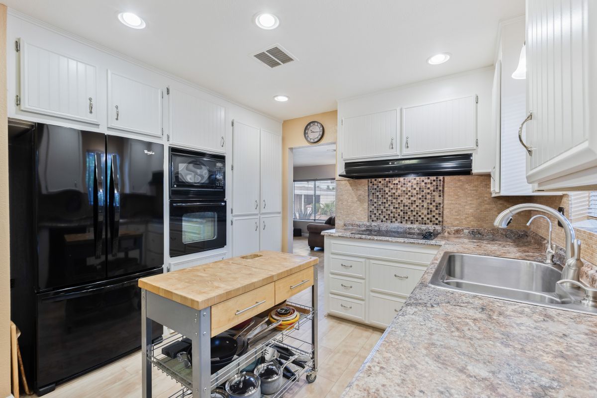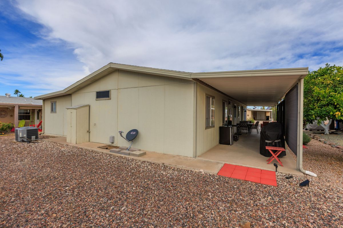 Beautifully Remodeled! This updated 1,344 sq ft home offers modern comfort with a newer roof (2022/2023), newer A/C, fresh texture and paint, and newer vinyl flooring. The kitchen includes white cabinetry, mosaic backsplash, built-in oven and microwave, cooktop with range hood, dishwasher, French door refrigerator, stainless sink with pull-out faucet, and a new soft water and R/O system. The laundry room adds a washer/dryer, built-in desk, and extra cabinetry. The primary suite features a dual-sink vanity, double medicine cabinets, walk-in closet, and step-in shower, while the guest bath also offers a modern vanity and step-in shower. New lighting, ceiling fans, and sunshades enhance comfort throughout, plus a large storage shed, irrigations system and golf cart pad complete the home. Furniture is negotiable. Call to schedule your personal tour today! (480) 325-1161