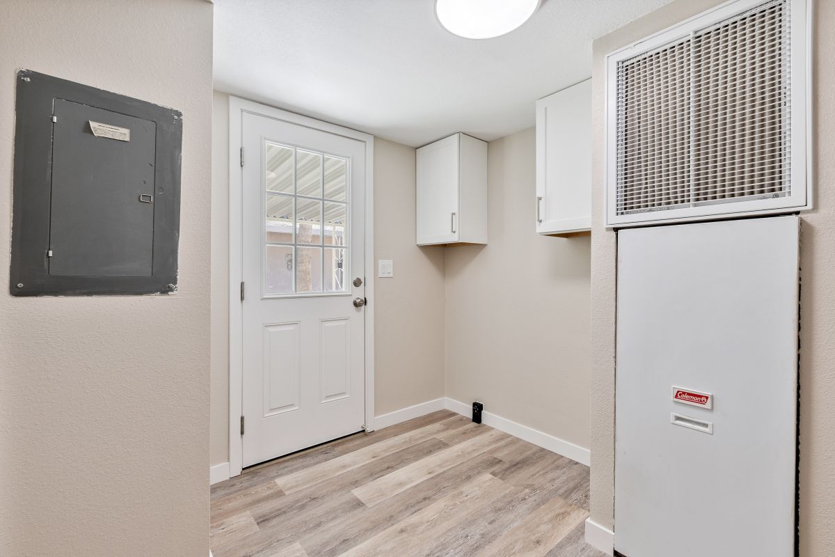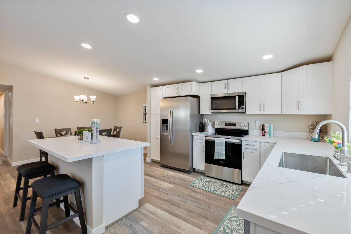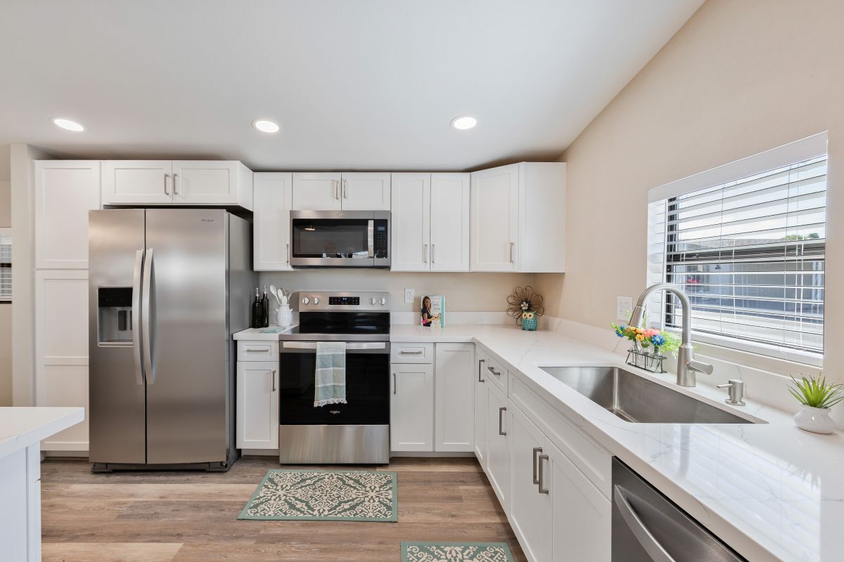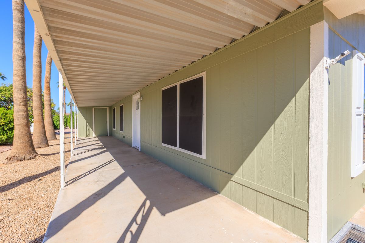 This immaculately remodeled 1352 sq ft home features an open floor plan that seamlessly blends modern elegance with cozy comfort. Step inside to find yourself greeted by freshly painted interiors and new vinyl plank flooring that stretches throughout the entirety of this move-in-ready sanctuary. The kitchen is a culinary enthusiast’s haven, boasting quartz countertops, a large island, all-new stainless-steel appliances, and sleek new cabinets, complete with a convenient lazy Susan. The primary bedroom features a vanity with dual sinks and a stunning walk-in shower. The guest bathroom is equally inviting with its new vanity and shower/tub combo. Every corner of this home is adorned with new light fixtures and ceiling fans, ensuring both style and comfort. Outside, revel in the beauty of fresh exterior paint, and a serene desert landscape with many palm trees. Enjoy the two storage sheds for all your organizational needs. Call to schedule your personal tour today! (480) 325-1161