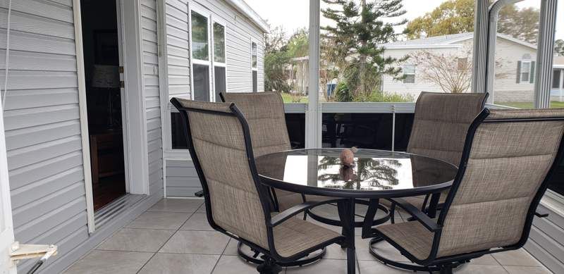 This 1232 square feet, 3.0 bed 2.0 bath manufactured home in Blue Heron Bay offers a spacious and inviting layout. The living room, dining room, and Florida room provide ample space for relaxation and entertaining. The master bedroom includes a walk-in closet and ensuite bathroom. The kitchen comes equipped with appliances such as an oven, fridge, microwave, dishwasher and a water filter attached to the sink for drinking. Exterior features include a carport, shed, patio, sprinkler system, and vinyl siding, adding to the functionality and curb appeal of the home. With a convenient laundry room and central A/C (2019), this home provides comfort and convenience for its residents. a NEW ROOF was installed in 2024 as well as New Aluminum Roofing over carport, shed and lanai in 2025. New windows were installed in 2023. The home has an accessible water valve shut off as well as 2 water meters to save money on irrigation. Additional parking available with second driveway . This home is wheelchair accessible, FULLY FURNISHED, and MOVE IN READY. Located in Haines City, FL, Blue Heron Bay is a vibrant community that offers a range of amenities for its residents. Residents can enjoy access to a clubhouse, swimming pool, spa, shuffleboard, bocce ball and a fitness center, perfect for staying active and socializing with neighbors. The community also features lighted , paved streets, a fishing pier providing opportunities for outdoor recreation and relaxation. With a convenient location near shopping, dining, and local attractions, Blue Heron Bay offers a peaceful and welcoming environment for residents to call home.
