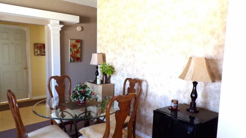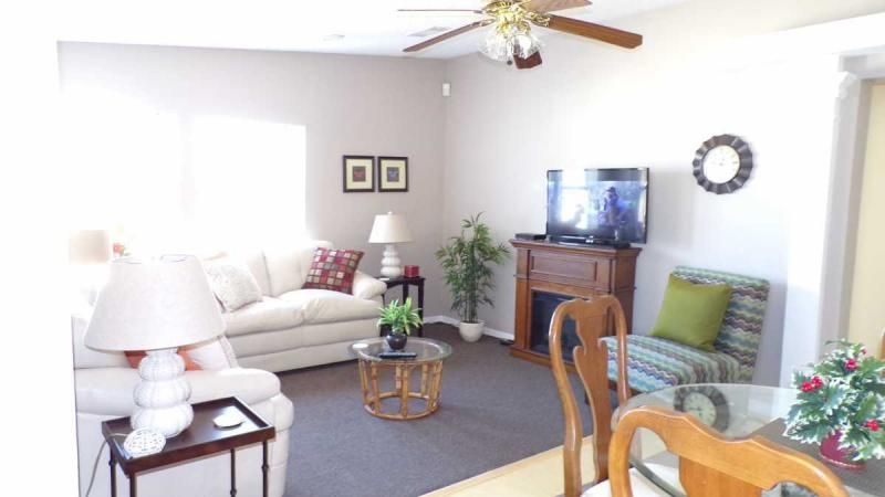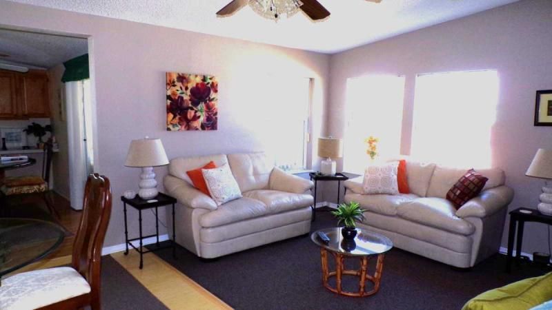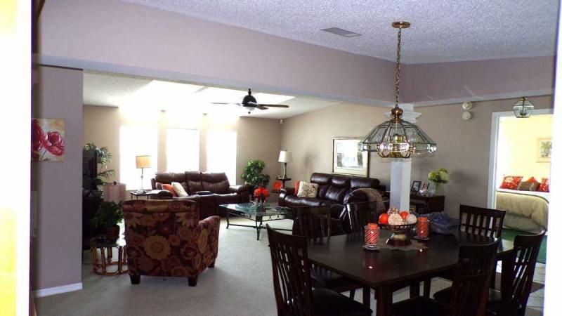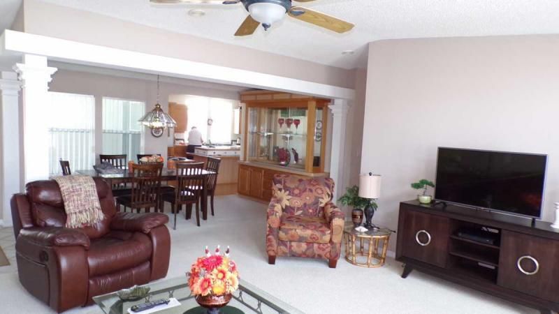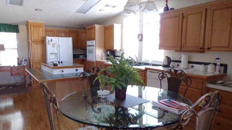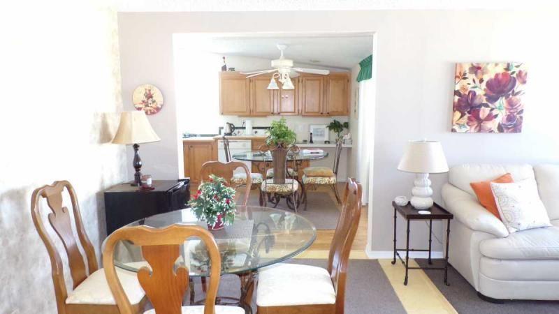 Spacious & Stylish: Fully Furnished 3-Bedroom Home with Den! Step into comfort and style with this generously sized 3-bedroom home, perfect for those seeking ample space and modern living. A professionally painted and design-printed double carport and shed provide convenient parking and storage. Furnished Elegance & Open Concept Living Enter into a spacious living room bathed in natural light from upper windows. The open-concept design seamlessly flows into a dining area defined by elegant pillars, featuring a built-in hutch for displaying cherished items. This home comes fully furnished with quality furniture, with a few exceptions, making it move-in ready. Split Bedroom Plan & Den for Versatility The split bedroom plan ensures privacy for guests, while the large primary bedroom offers a walk-in closet and an adjoining bathroom with double sinks, a tub, and a separate shower. A unique feature of this home is the den, accessible from the kitchen, which also serves as a separate hallway to the two additional bedrooms. This versatile space can be used as a home office, media room, or guest retreat. Chef's Kitchen & Cozy Breakfast Nook The pass-through kitchen is a chef's delight, boasting abundant cupboard and counter space, matching appliances, and an island with extra seating. A private laundry room with a door adds convenience to daily chores. The breakfast nook, adjacent to the kitchen, offers a cozy spot to enjoy meals while overlooking the glassed-in lanai. Comfort & Style Throughout Enjoy the comfort of carpet in select areas, complemented by tile and luxury vinyl plank flooring throughout the rest of the home. Key Features: Fully furnished (with a few exceptions) Professionally painted and designed double carport and shed Spacious living room with upper windows Dining area with pillars and built-in hutch Split bedroom plan Large primary bedroom with walk-in closet and ensuite bathroom Den/separate hallway to additional bedrooms Large pass-through kitchen with island seating Private laundry room with door Breakfast nook with glassed-in lanai views Carpet, tile, and luxury vinyl plank flooring Experience Community Living! Schedule a FaceTime video tour or visit us in this wonderful community to experience the comfort and convenience this home has to offer. La