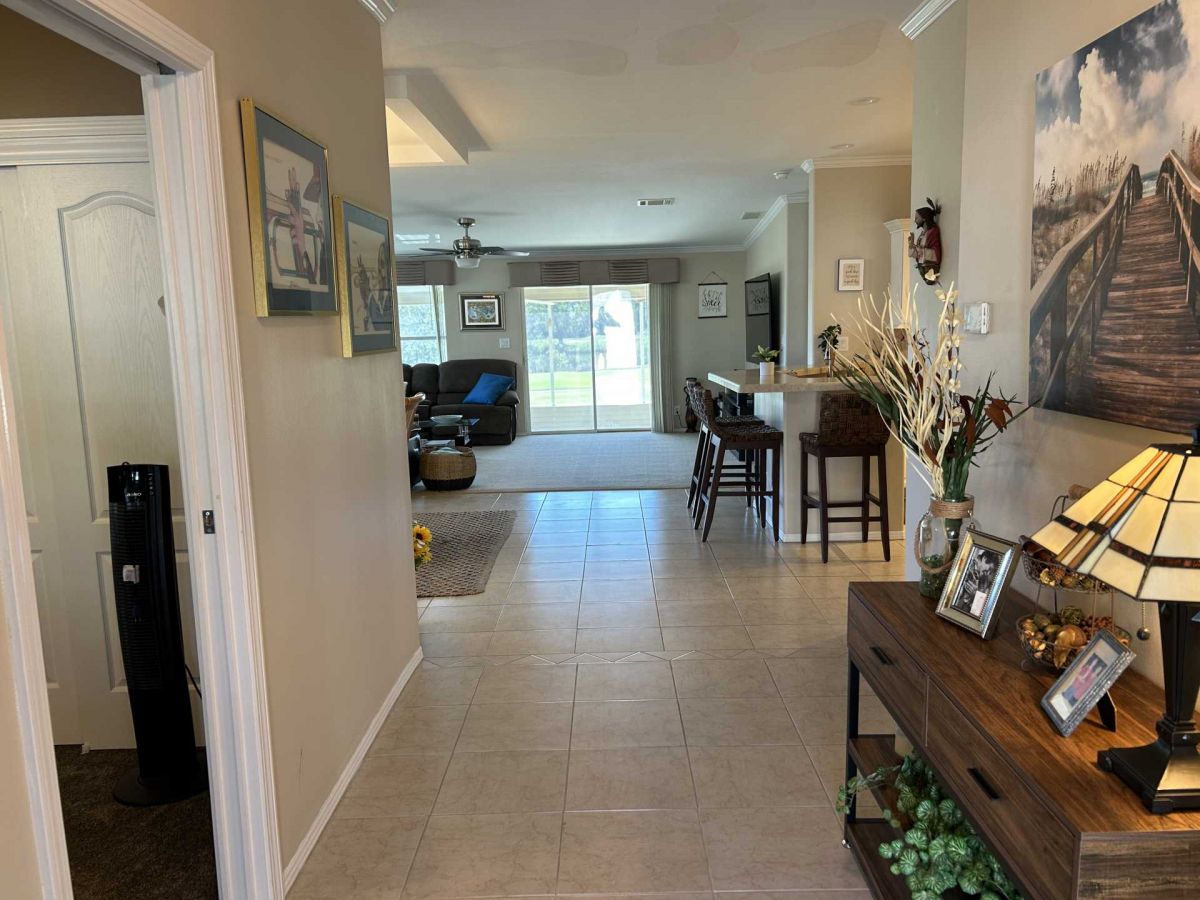 3 BEDROOM – 2 BATHROOM – GOLF COURSE This Triple-wide Palm Harbor home overlooks the peaceful Scotland Yard’s Golf Course. This furnished Smoke and Pet Free home, among other furnishings, includes a California King bed and Living Room Sectional with multiple recliners. The open floor plan welcomes you to a spacious entry with designer Tray ceilings along with Medallion lighting. The neutral tones of the home offer a color palette that will accommodate any décor.  The tinted windows also keep the home cool on those hot summer days. There’s plenty of counter space and a Center-Kitchen Island for cooking and entertaining. The kitchen and bathrooms have tile flooring, while the living room and both bedrooms have extra-padding carpet for comfort. The garage features Loft Storage, an Exhaust Fan, and a Belt Opener for quiet arrivals and departures. It’s nice and cool with the remote fans on the screened back patio.  Enjoy your time there while taking in the serene golf course. A new roof will be installed in 2024. This is both a majestic and striking home.