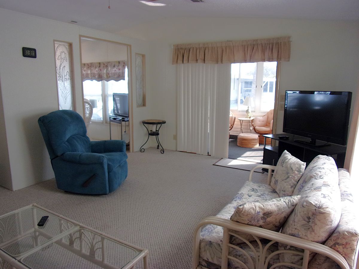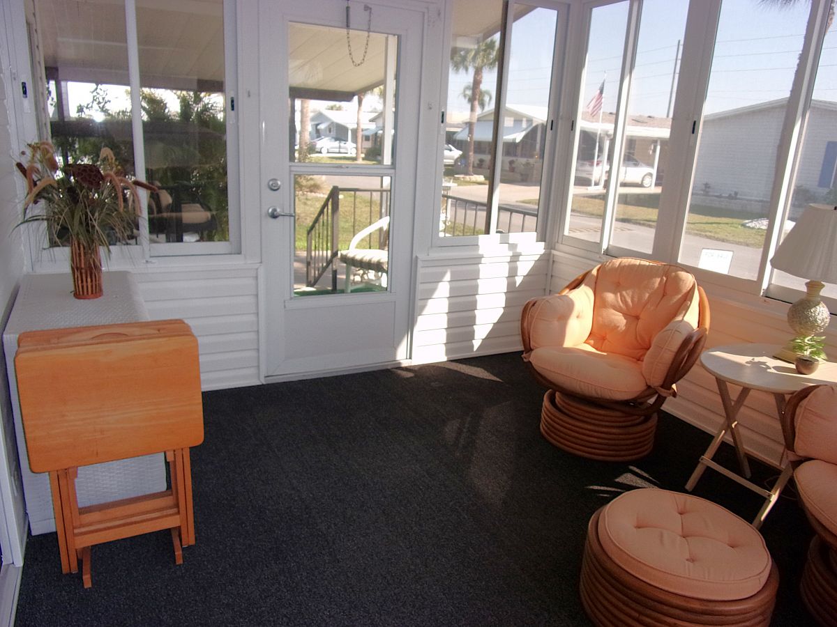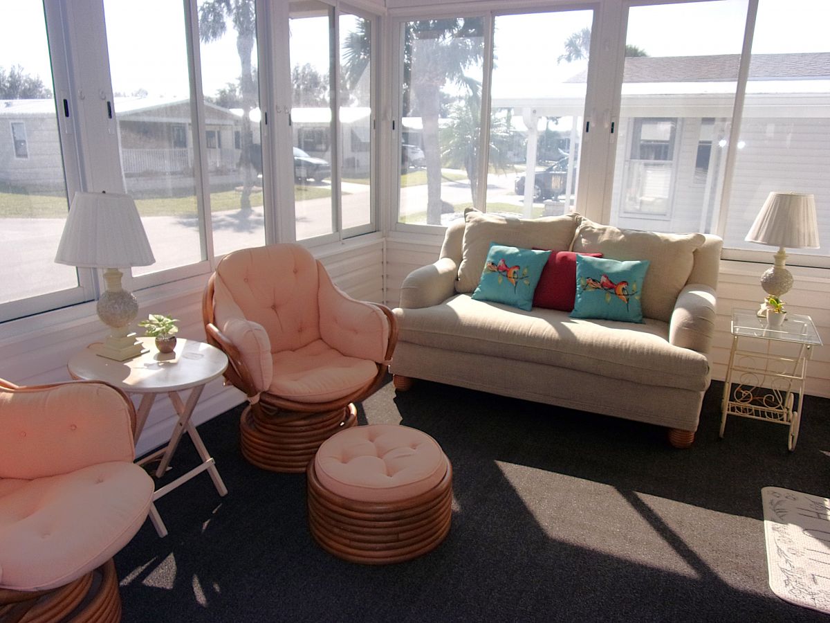 Adorable 2 BR 2 Bath, furnished, very clean home. East facing, front lanai enclosed with glass windows and screens adds another few hundred sq ft to this home. Large master suite with a huge walk-in closet, nice sized second bedroom and bath. Berber carpet, vinyl flooring and ceiling fans. Home re-plumbed 2/24. Rubber slate roof. Central AC. Washer and dryer inside. Free golf for the rest of 2025 with the purchase of this home!