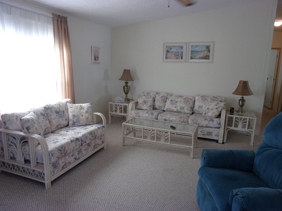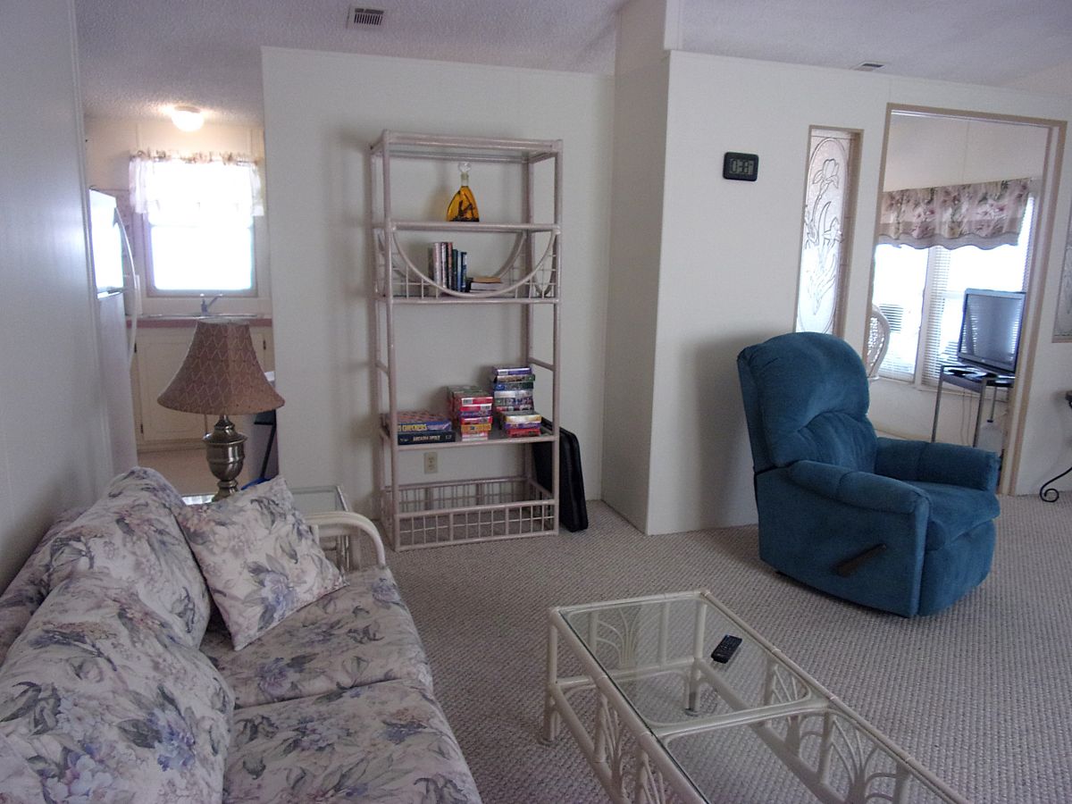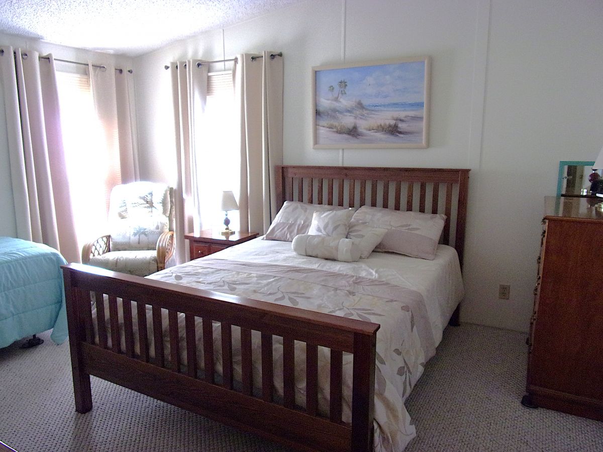 Adorable 2 BR 2 Bath, furnished, very clean home. East facing, front lanai enclosed with glass windows and screens adds another few hundred sq ft to this home. Large master suite with a huge walk-in closet, nice sized second bedroom and bath. Berber carpet, vinyl flooring and ceiling fans. Home re-plumbed 2/24. Rubber slate roof. Central AC. Washer and dryer inside. Free golf for the rest of 2025 with the purchase of this home!