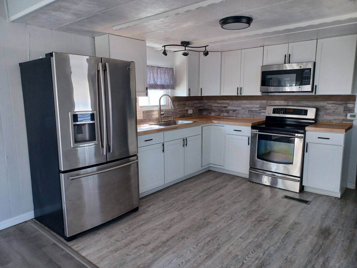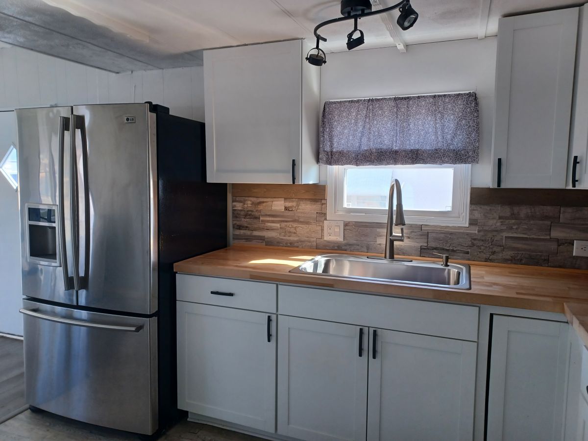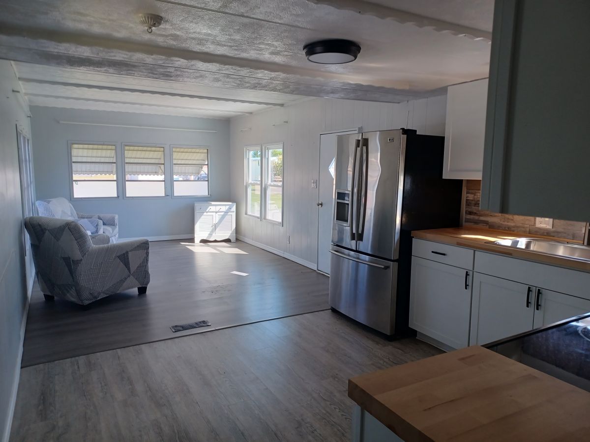 This home is eligible for PICK-TWO! Now through August 31, 2025, choose TWO valuable savings that include options like: 20% off Lot Rent for first 12 months; 20% OFF the listed price; 0% interest Owner Financing on both New and Used homes (conditions apply- call for information). Charming 1 bed/1 bath offers comfortable and functional living space. The bedroom is a true retreat, featuring a cozy reading nook. The bathroom boasts a convenient double sink, ideal for shared routines and added convenience. The kitchen is a blend of classic and modern with shaker-style cabinetry, butcher block countertops, stainless steel appliances and tile backsplash. Though the roof is currently not leaking, the roof has sustained damage that warrants attention.