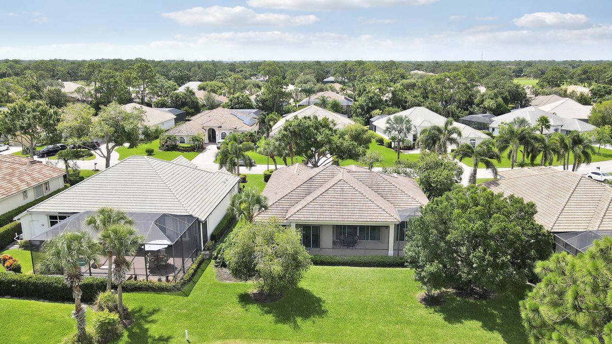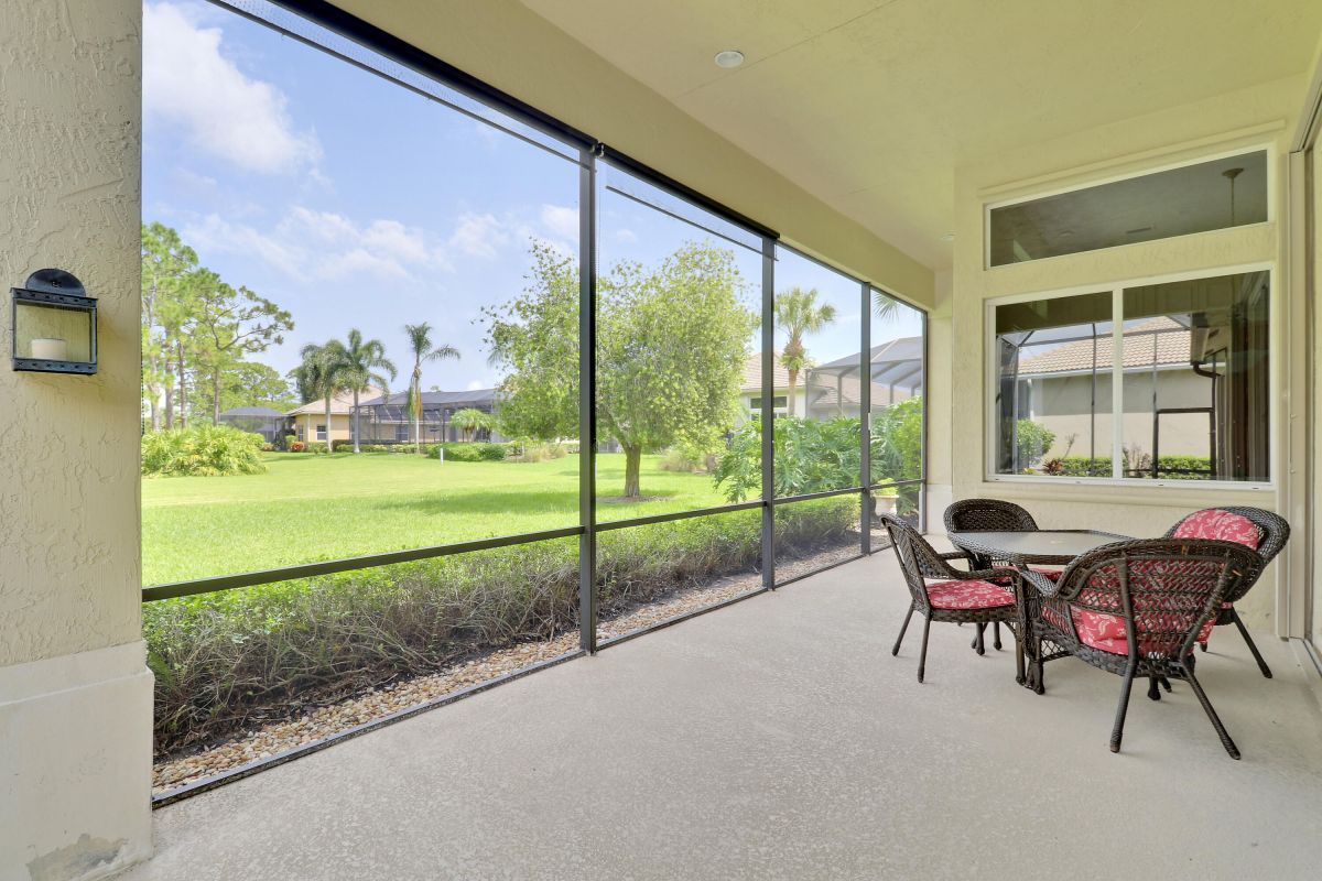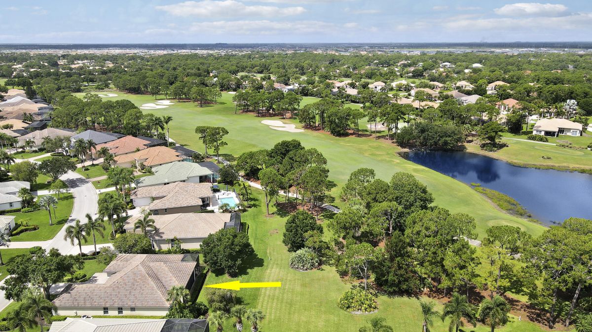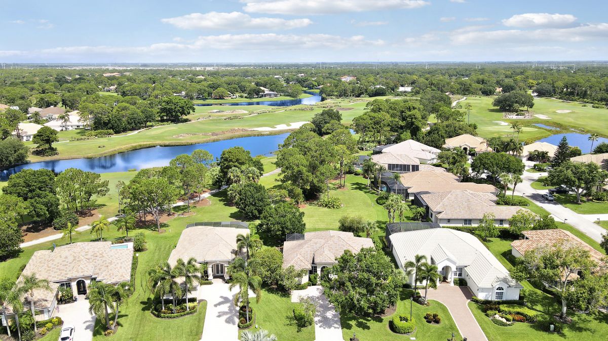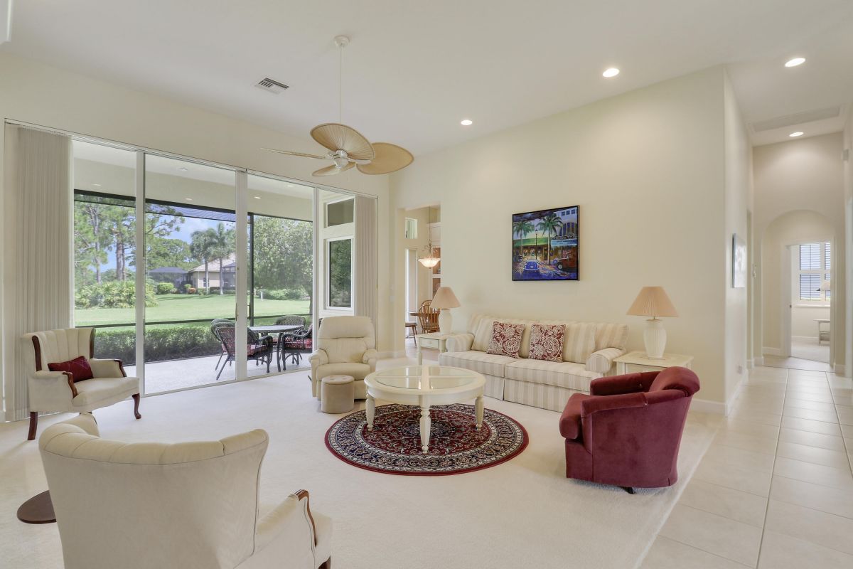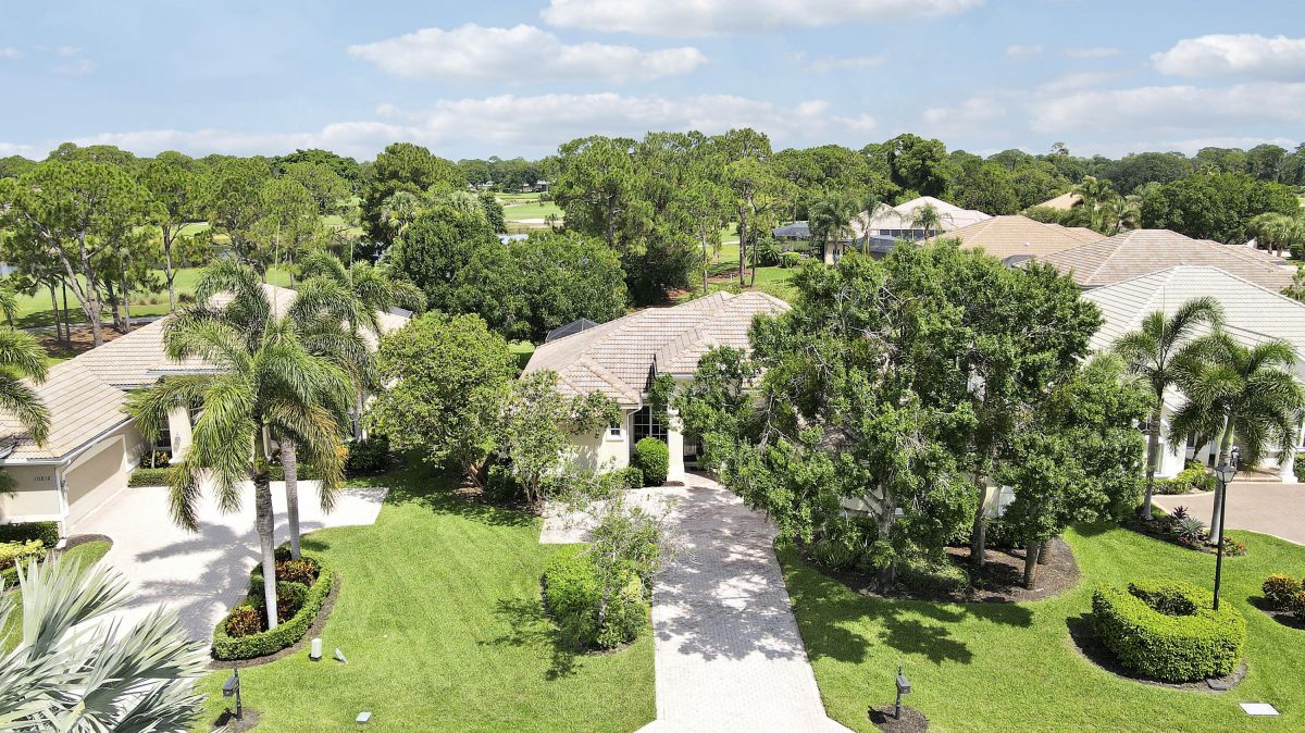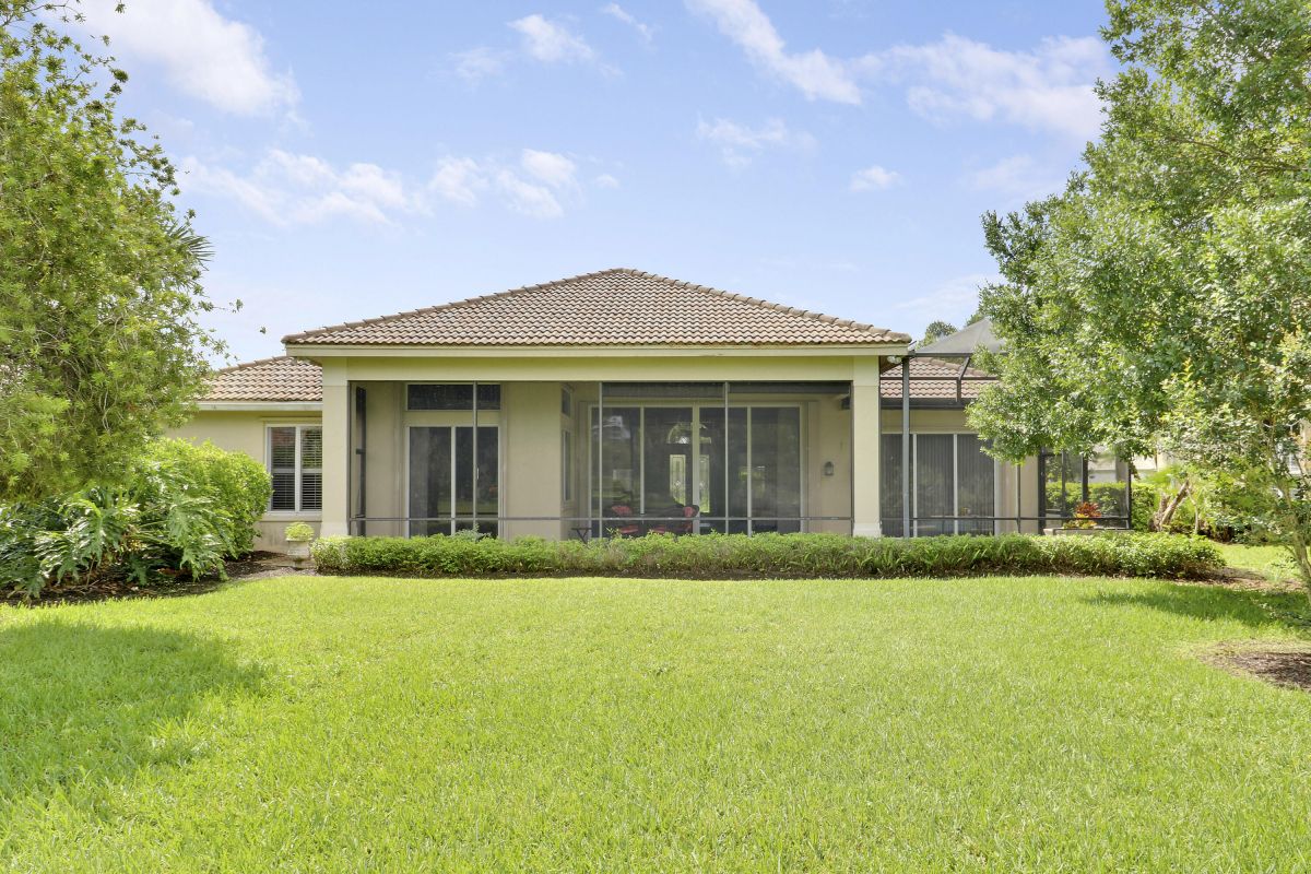FANTASTIC VALUE IN PGA VILLAGE! Nestled on the 17th tee of the Ryder Course with a park-like setting and golf views! This 3BR+Den/2BA/2.5CG home has been lovingly enjoyed and has many charming features including built in shelving, a breakfast room, tall ceilings, dual glass entry front doors, a split bedroom plan, multiple doors leading out to the lanai, oversized garage w/ room for a golf cart and newer AC (2021). The spacious living area is brimming with light and overlooks the back yard. Kitchen opens to the breakfast room, has newer SS appliances, solid surface counters and a breakfast bar. The master suite has a large walk-in closet, access to the patio as well as an ensuite with dual vanities, walk-in shower and soaking tub. Two additional bedrooms share a hall bath.