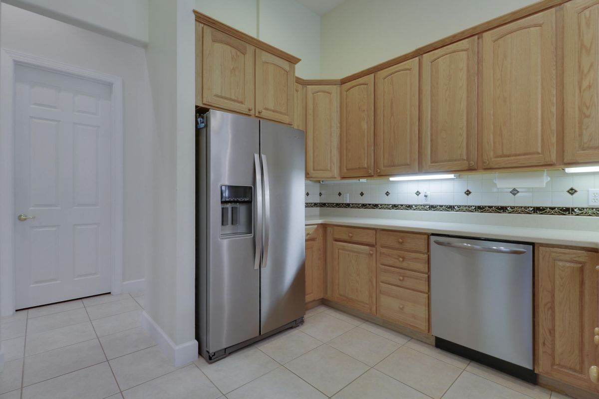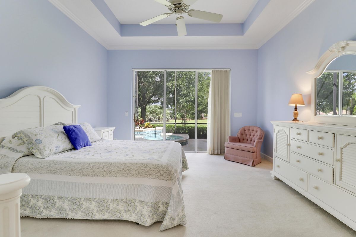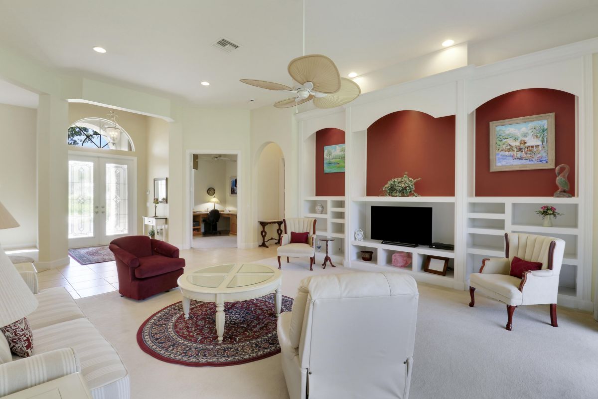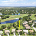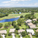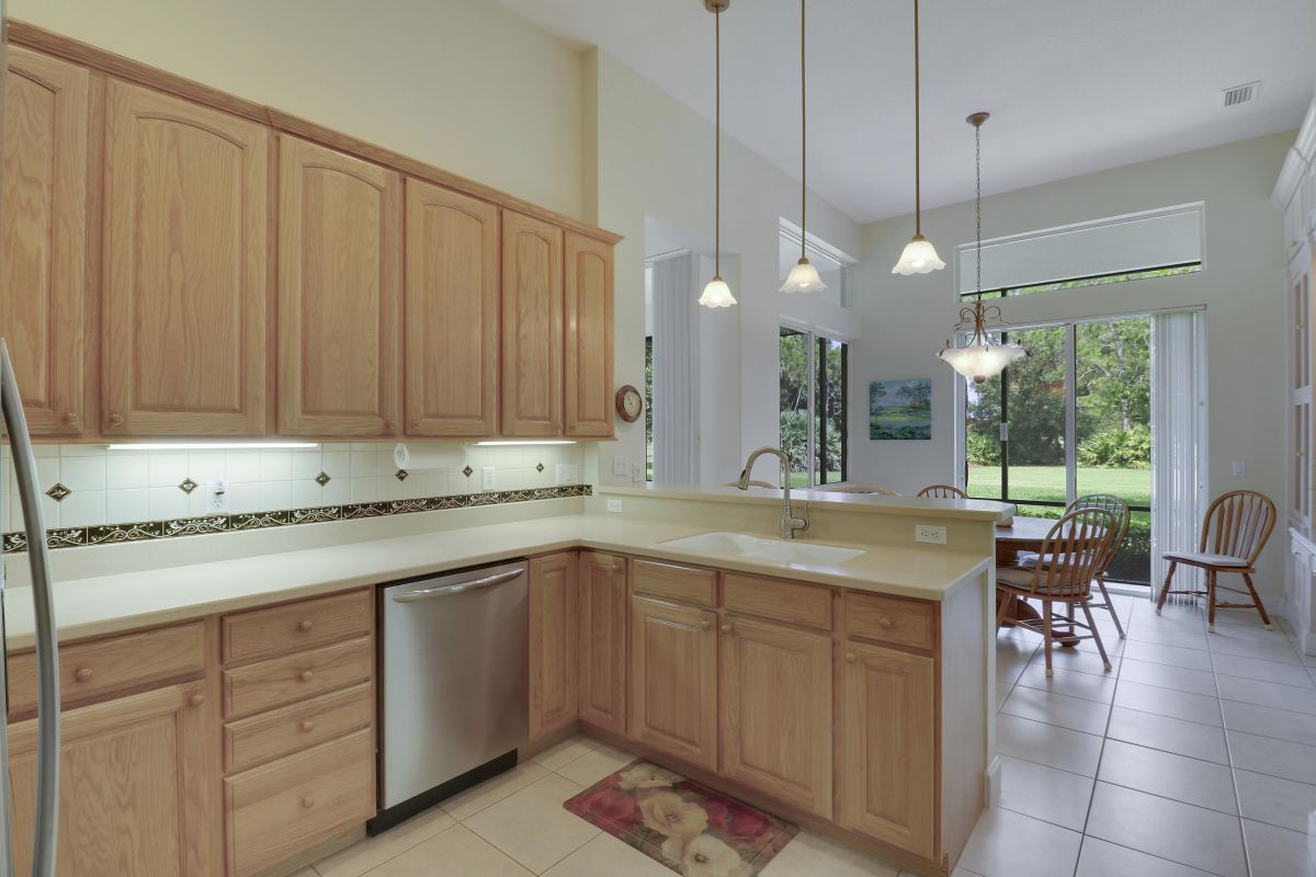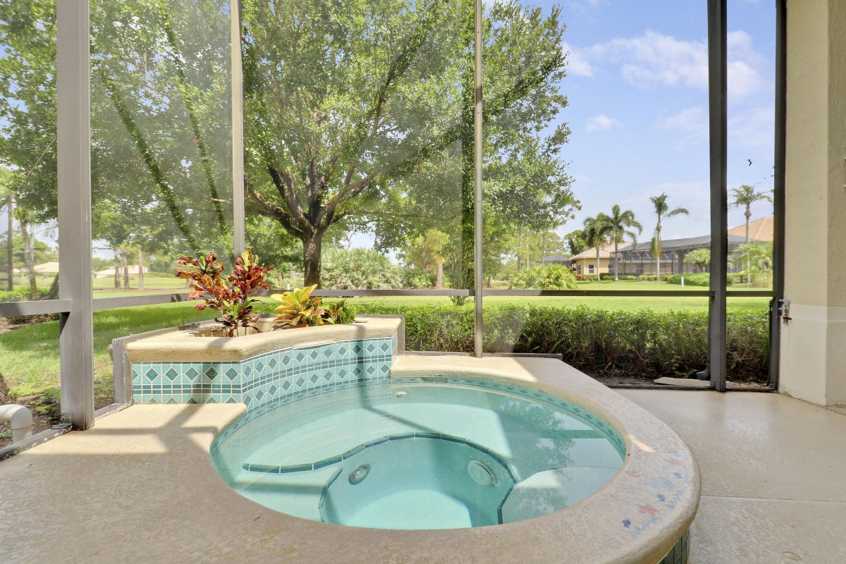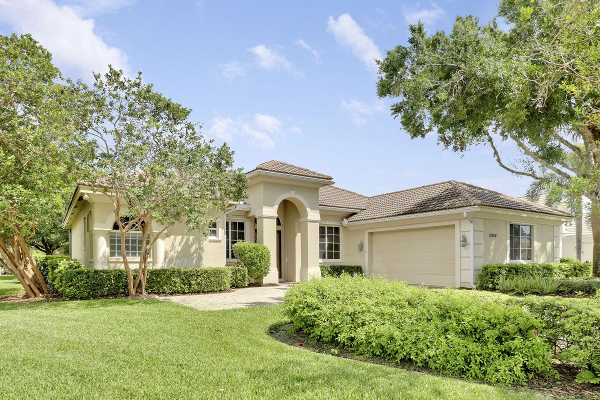 FANTASTIC VALUE IN PGA VILLAGE! Nestled on the 17th tee of the Ryder Course with a park-like setting and golf views! This 3BR+Den/2BA/2.5CG home has been lovingly enjoyed and has many charming features including built in shelving, a breakfast room, tall ceilings, dual glass entry front doors, a split bedroom plan, multiple doors leading out to the lanai, oversized garage w/ room for a golf cart and newer AC (2021). The spacious living area is brimming with light and overlooks the back yard. Kitchen opens to the breakfast room, has newer SS appliances, solid surface counters and a breakfast bar. The master suite has a large walk-in closet, access to the patio as well as an ensuite with dual vanities, walk-in shower and soaking tub. Two additional bedrooms share a hall bath.