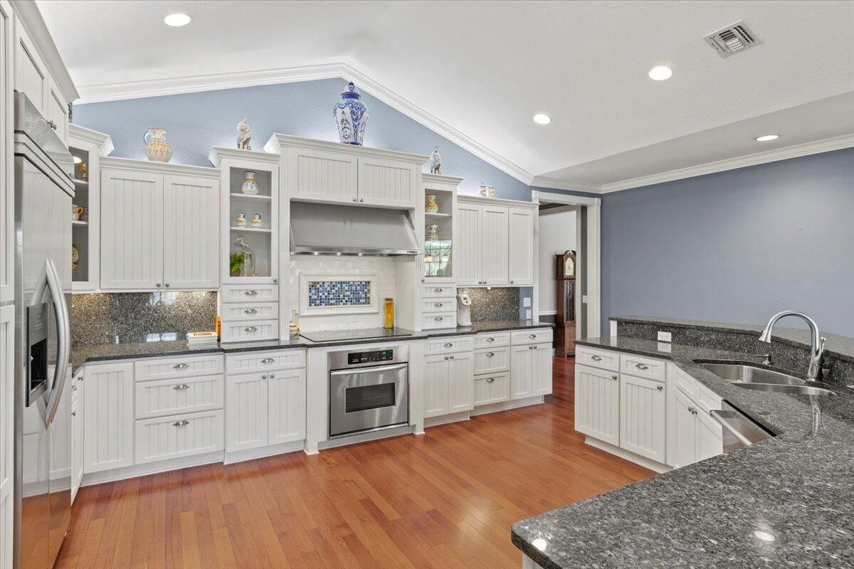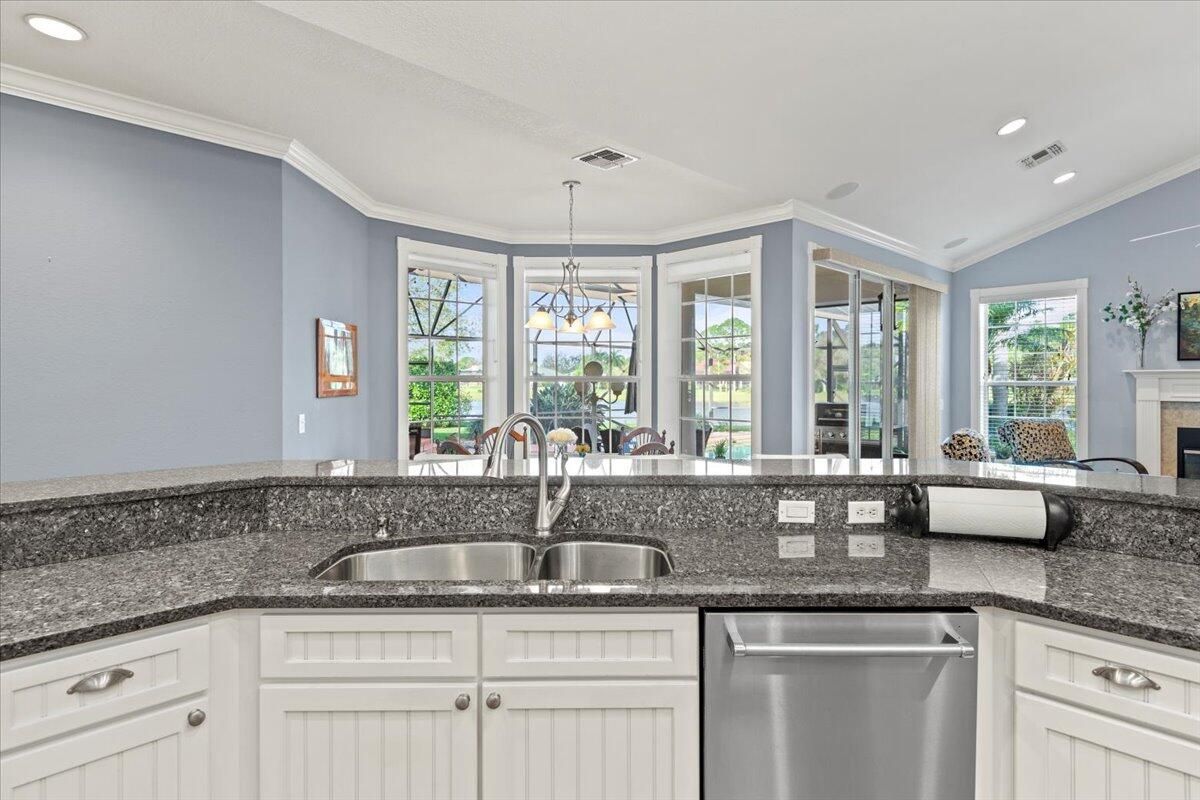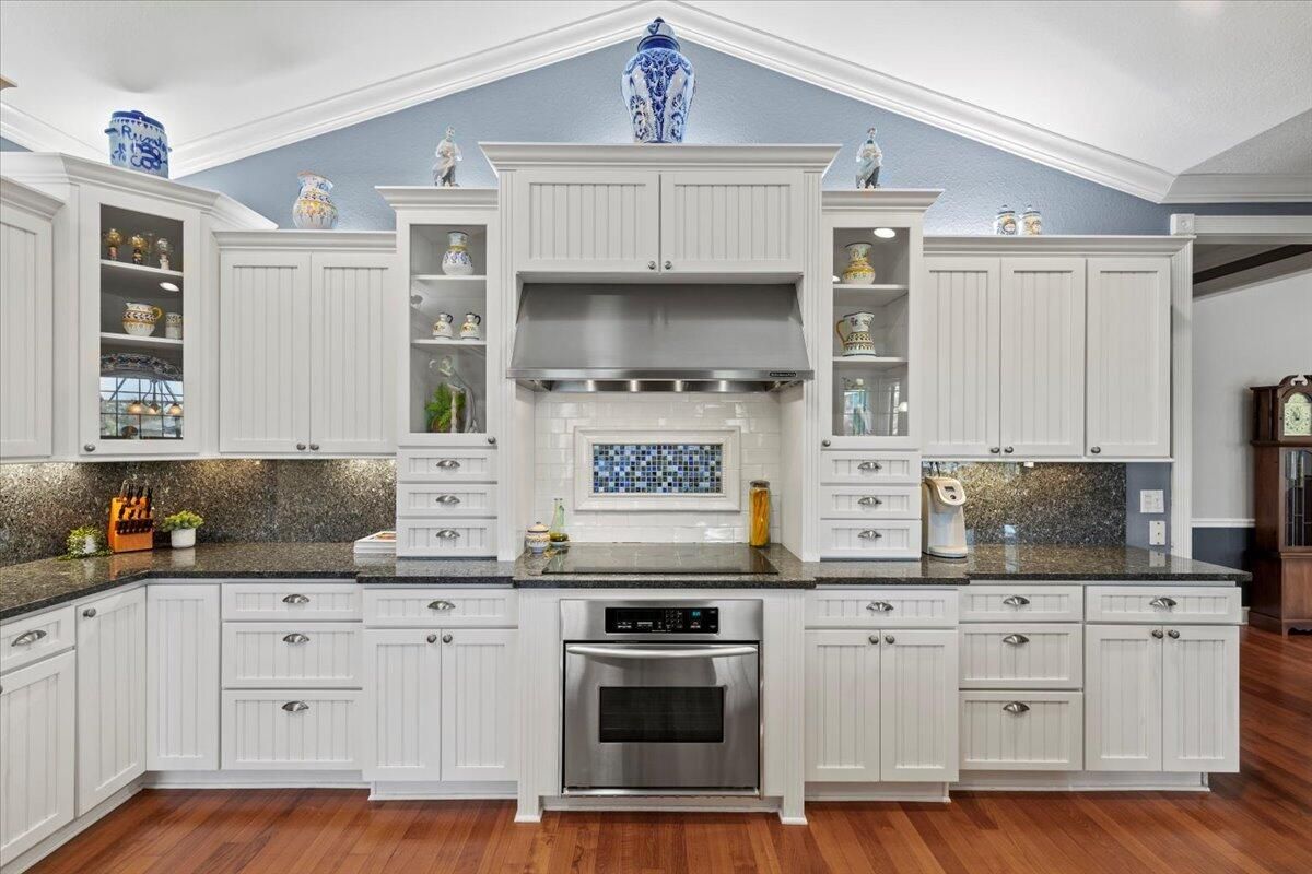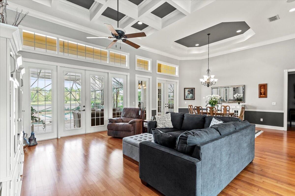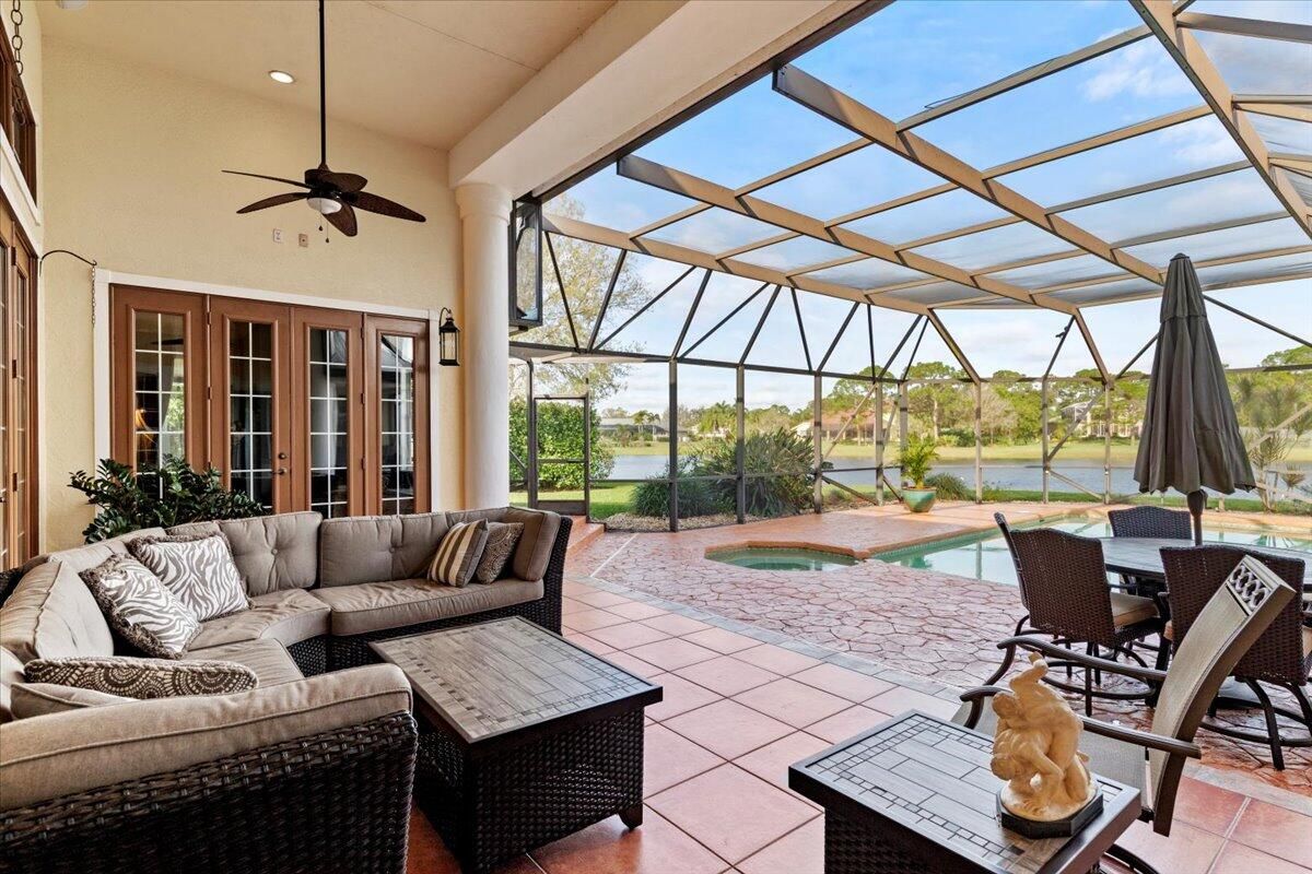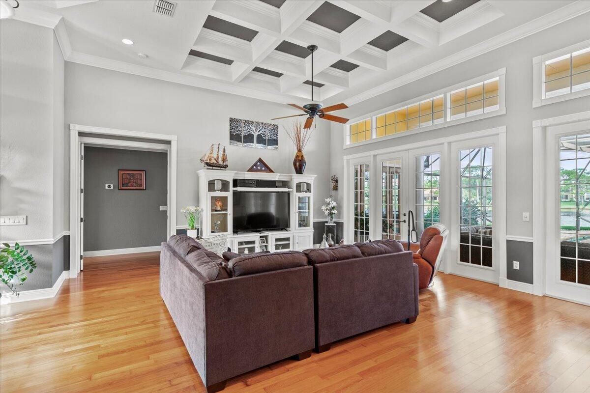 Exceptional Custom built home on 1.49 Acre Lot in cul-de-sac w/ panoramic lake views.Beautiful entrance, impact widows, Metal Roof, French Doors, volume coffered ceiling, custom moldings & wood floors. Features 3 BR's, Office w/ built-in's, 2 Full BA's, 2 1/2 BA's & oversized 2.5 CG w/ storage. Stunning Eat in Kitchen offers white updated cabinets, stainless steel appliances/hood, breakfast bar, pantry, granite counter tops & backsplash. Overlooking LG lanai, heated pool & tranquil lake views plus cabana bath. Split BR'S, natural lighting & fireplace are just a few of the details. Spacious Master Suite includes sitting area, custom window treatments & tray ceiling. Large walk in closets with built in's & grand Master BA boasts shower & tub, updated quartz counter tops & custom cabinets.