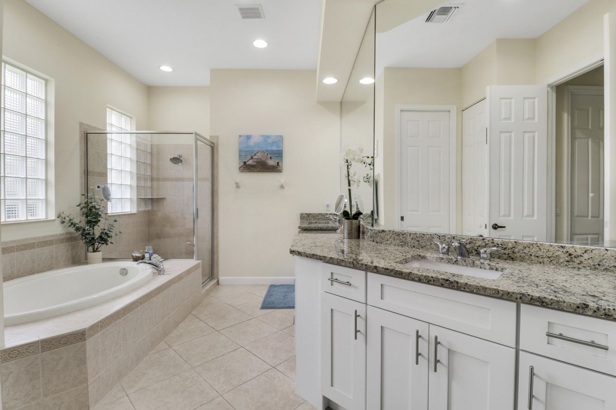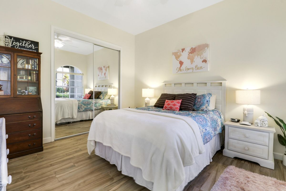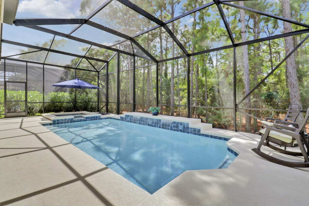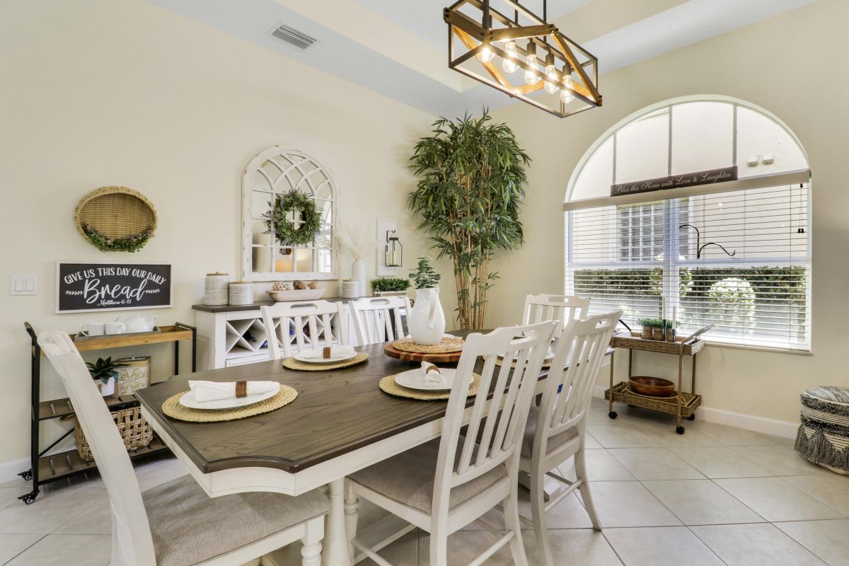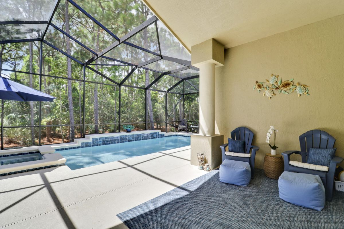 WELCOME HOME! Popular Fairview plan in PGA Village w/ NEW 2024 SALTWATER POOL & SPA! This 2BR+Den/2BA/2CG home has an open floor plan ideal for entertaining & modern living. Special features include tile flooring throughout, decorative glass entry front door, neutral interior paint, new refrigerator, washer, dryer and water heater, vaulted ceilings, updated cabinetry and more. The spacious kitchen features gray cabinetry, granite counters, tile backsplash, SS appliances, pantry closet and breakfast bar. Master Suite has large walk-in closets and a spa like ensuite w/ soaking tub, walk in shower and large vanity w/ dual sinks. The guest bedroom and den are both close to the hall bathroom. Spacious laundry room leads to the garage. The star of the show is the NEW POOL & SPA, built in 2024.