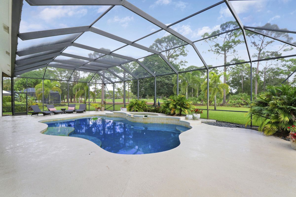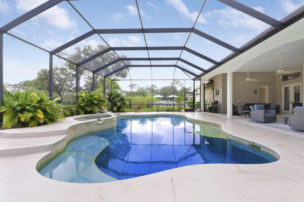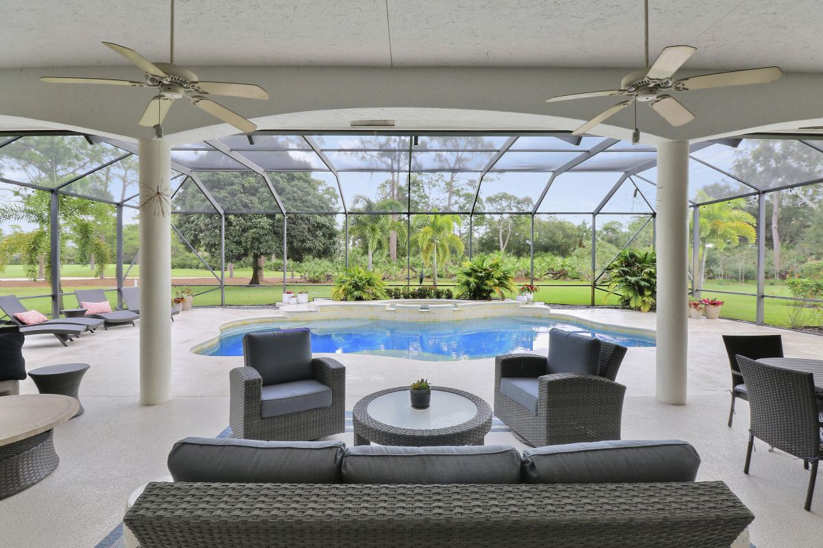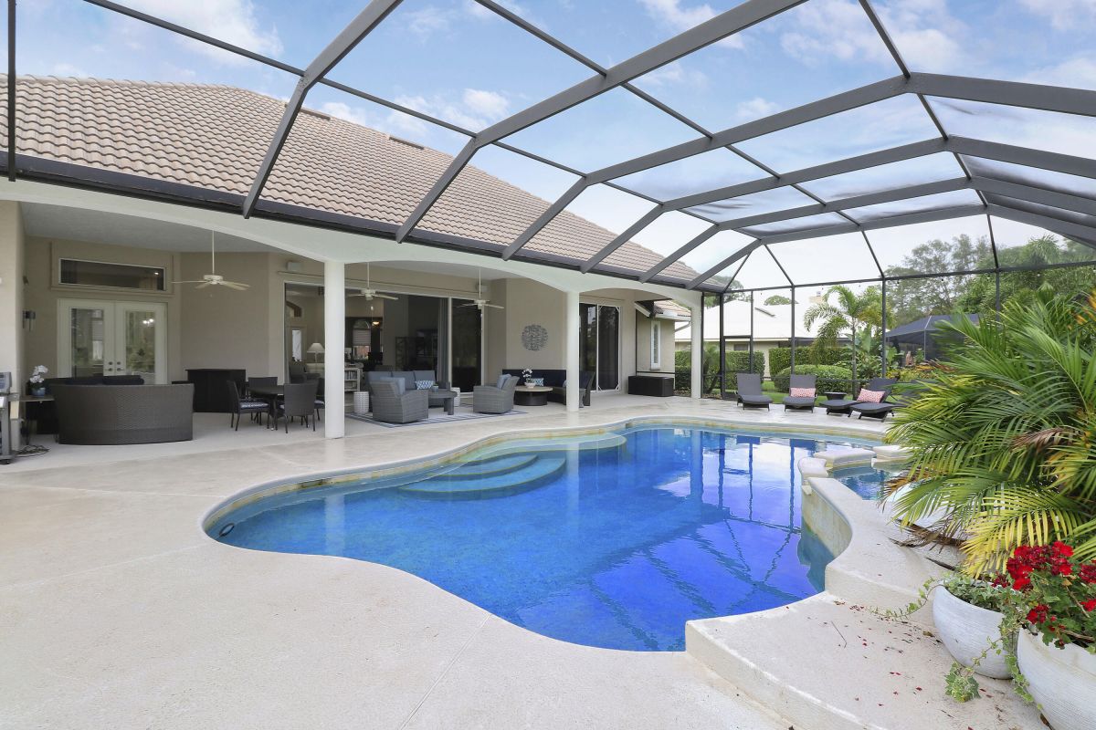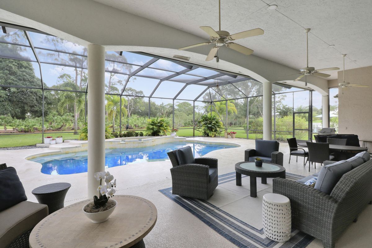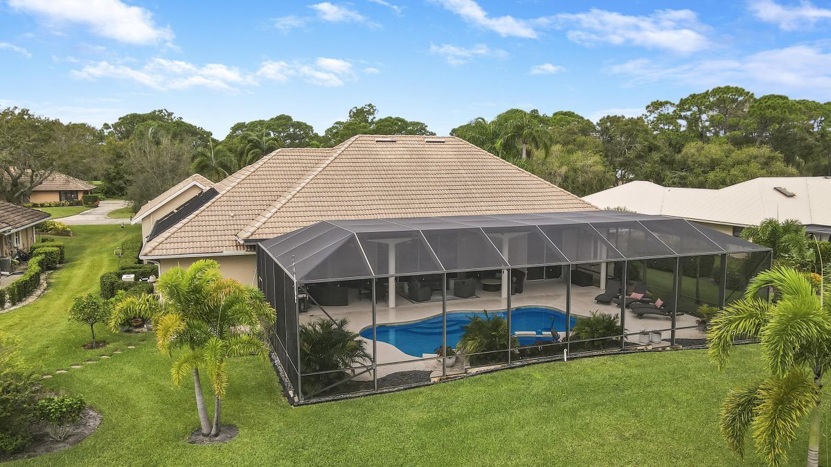PARADISE FOUND! SPECTACULAR 3BR+DEN/3.5BA/3CG POOL HOME NESTLED ON A GOLF FRONT ESTATE LOT IN THE HEART OF PGA VILLAGE! This custom built great room floor plan is brimming with upgrades and has been recently renovated with elegant and sophisticated finishes around every turn. The minute you enter you will begin to notice some of the many special features including decorative glass insert front doors, wood-look tile through the main living areas, volume ceiling in the great room, built in speakers, pocketing living room doors seamlessly blend indoor & outdoor living, LED hihats, custom light fixtures & draperies, neutral interior paint, charming dining area, solid core doors, crown moldings and expansive views of the 1st and 2nd holes of The Legacy Golf Course.