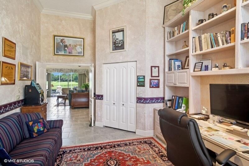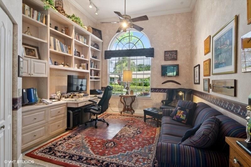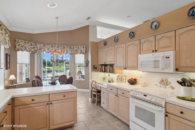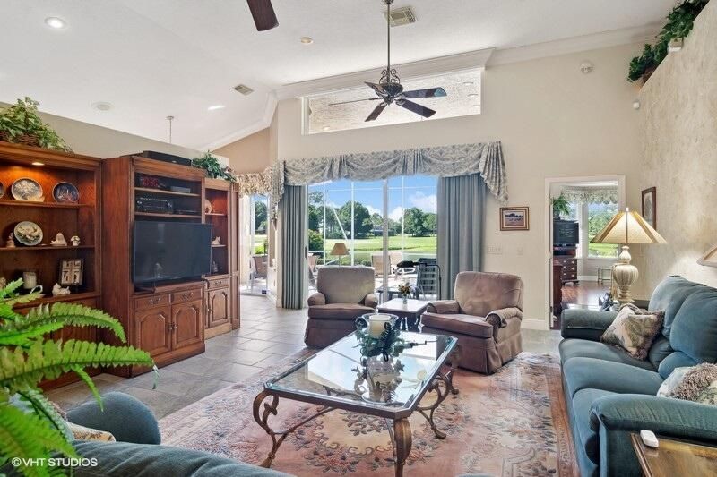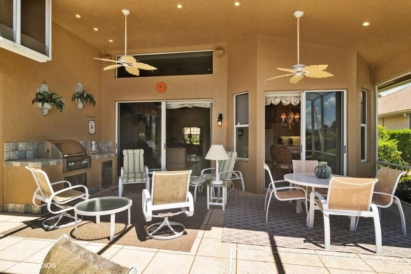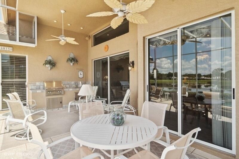 NEW ROOF WITH DOUBLE UNDERLAYMENT INSTALLED IN 2023. Don't miss this large home located in a serene cul-de-sac with spectacular lake & golf views. Original owners have maintained this home impeccably. Expanded Sawgrass floor plan offers three bedrooms (3rd being used as office with built-ins) 2 full baths, great room, formal dining room, & a large bright kitchen with a breakfast area has views to the covered screened lanai which houses a summer kitchen for all your entertaining needs & relaxing spa overlooking the beautiful lake & The Legacy Golf Course. Additional features include: 500 ga. propane tank, WHOLE HOUSE GENERATOR, central vac, impact glass on the den window & main bedroom window, 3M Film on all other windows, water purification system & surround system throughout