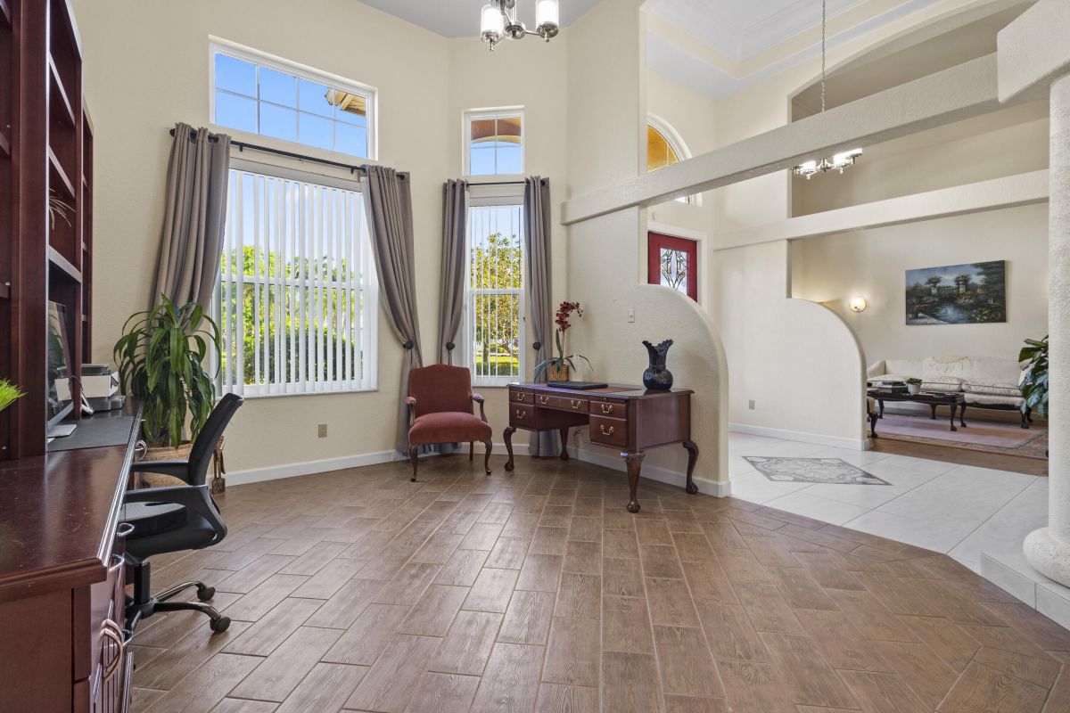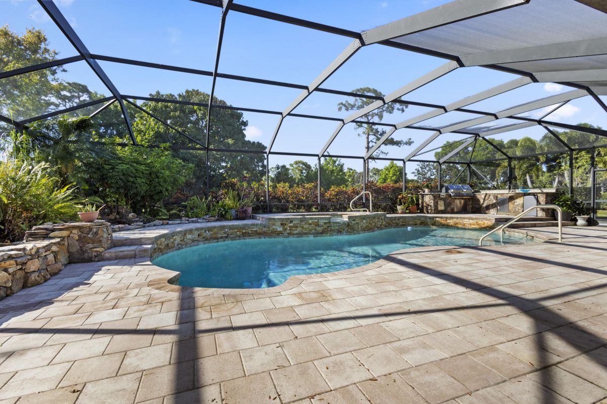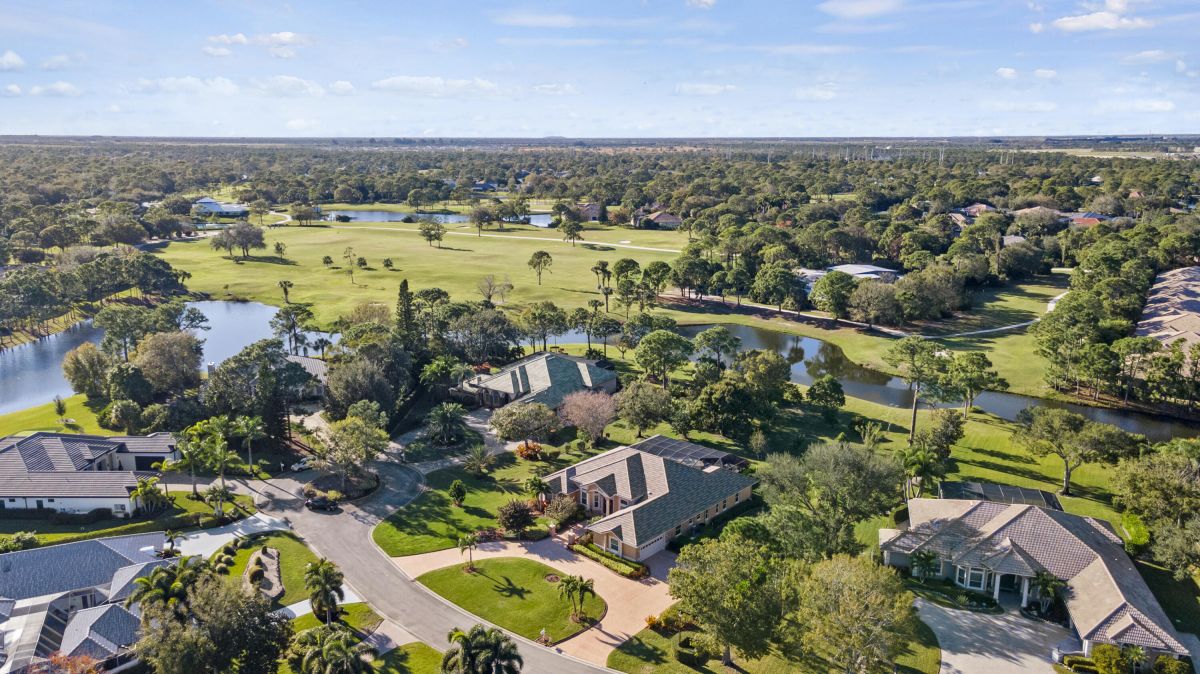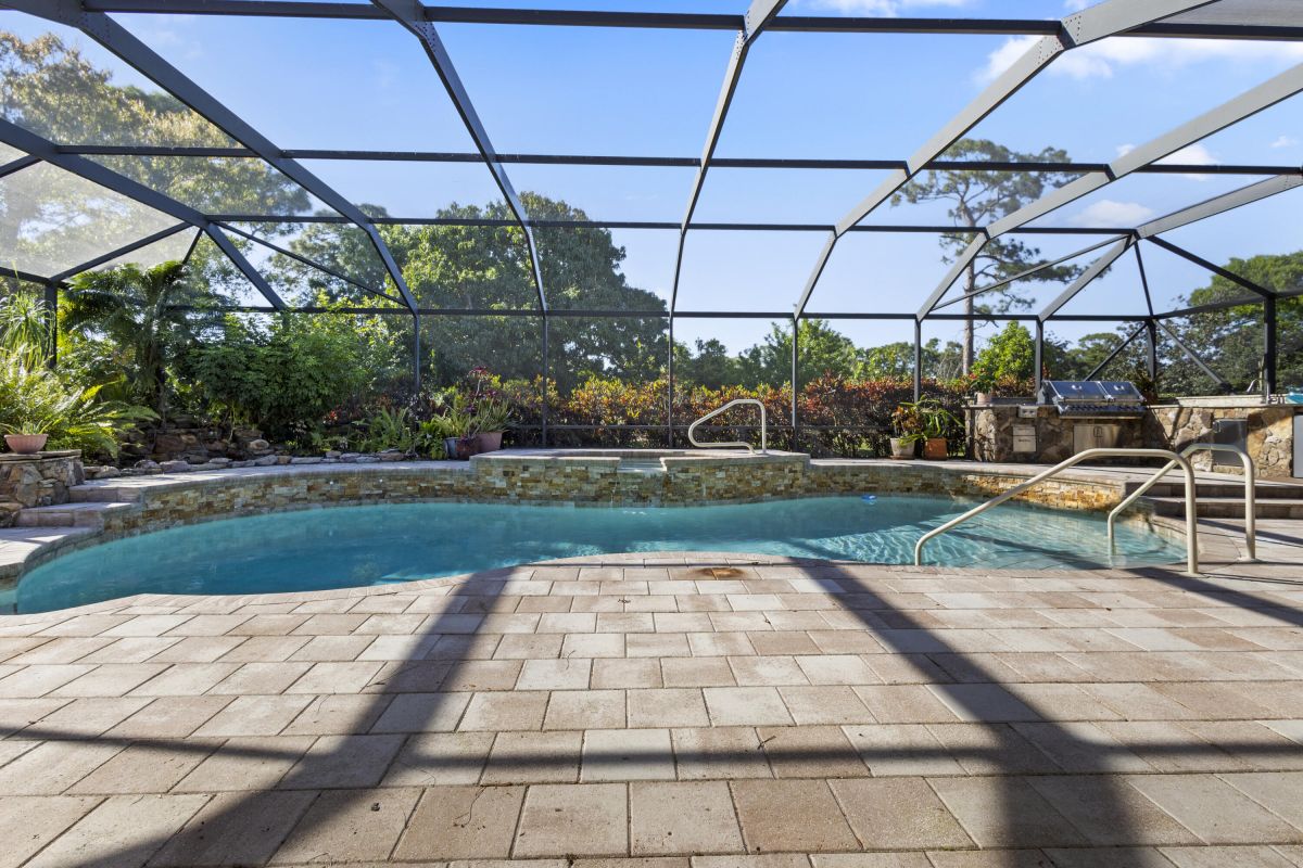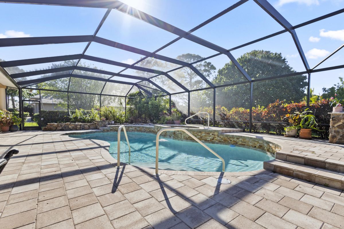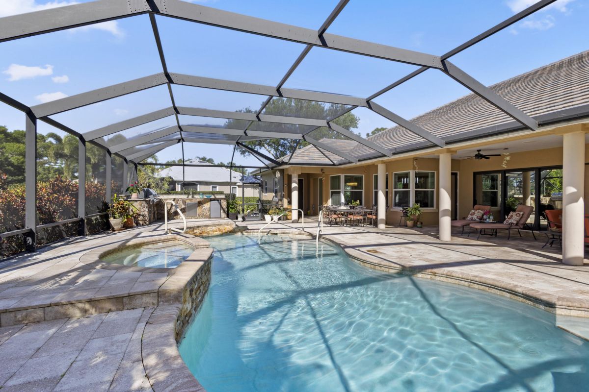 SELLER OFFERING $25,000 AT CLOSE! Looking for something special? Look no further! This custom-built pool home, tucked away in the prestigious PGA Village, offers elegance and privacy on nearly an acre of lush landscaping with mature fruit trees and a tranquil lake backdrop. Boasting over 3,500 sq. ft. of living space, grand coffered ceilings, and nearly 5,000 sq. ft. of total space, it includes 3 ensuite bedrooms, a cabana bath with patio access, a den, and a flex space. The living room features a built-in wall unit with triple pocket sliders for seamless indoor-outdoor living. The gourmet chef's kitchen, recently remodeled, showcases granite counters, a large island, and top of the line Viking appliances, including a double oven, convection oven, hood vent, refrigerator , and wine chille