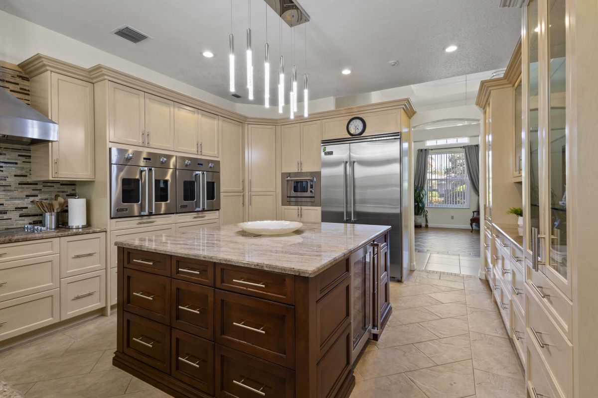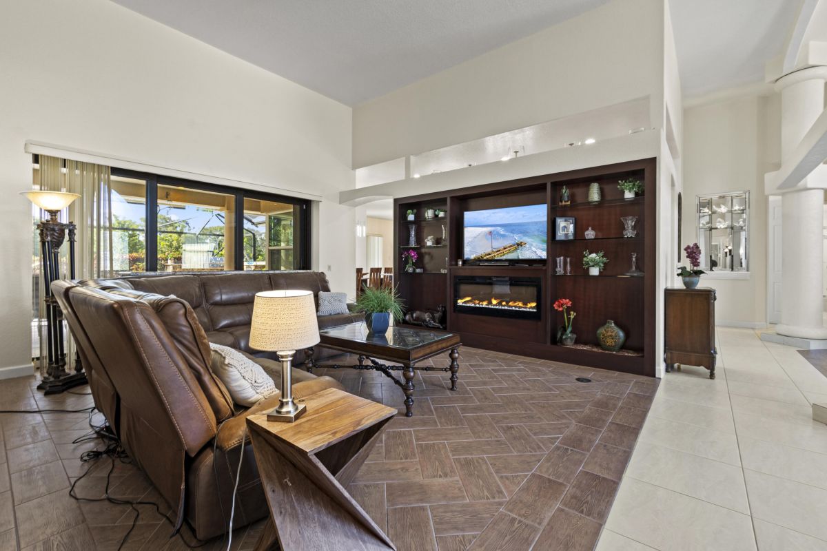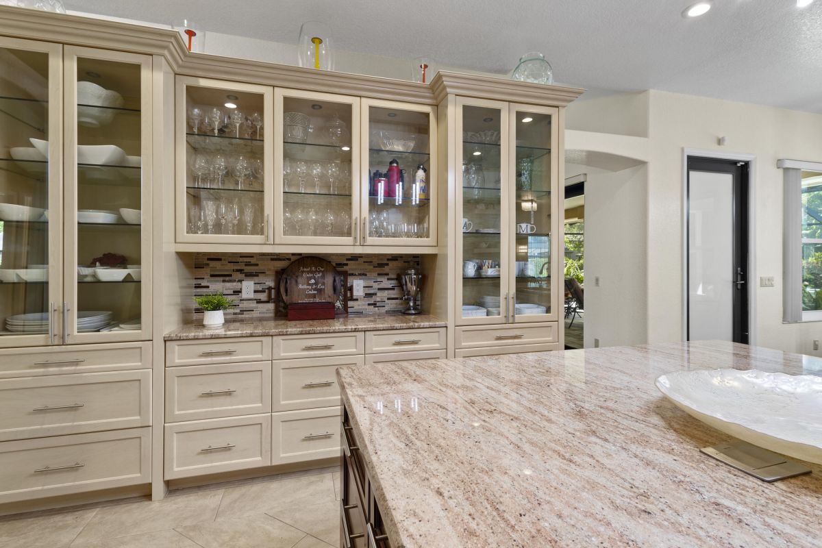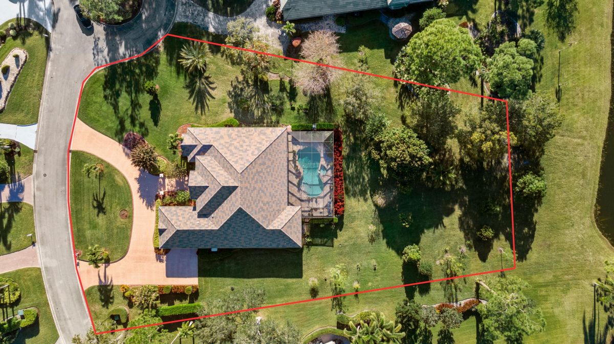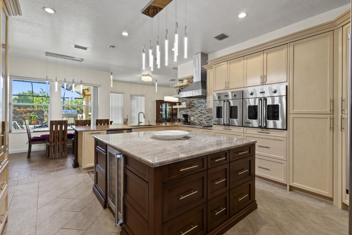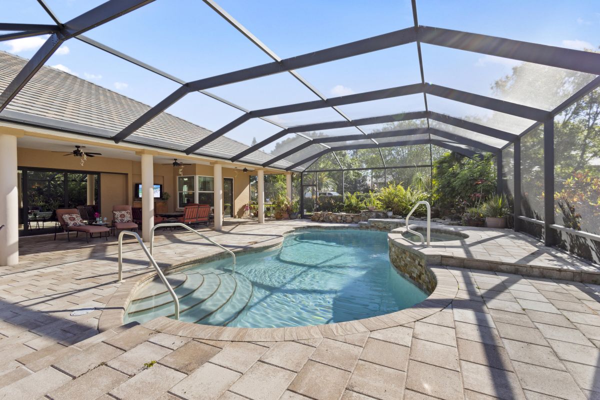 SELLER OFFERING $25,000 AT CLOSE! Looking for something special? Look no further! This custom-built pool home, tucked away in the prestigious PGA Village, offers elegance and privacy on nearly an acre of lush landscaping with mature fruit trees and a tranquil lake backdrop. Boasting over 3,500 sq. ft. of living space, grand coffered ceilings, and nearly 5,000 sq. ft. of total space, it includes 3 ensuite bedrooms, a cabana bath with patio access, a den, and a flex space. The living room features a built-in wall unit with triple pocket sliders for seamless indoor-outdoor living. The gourmet chef's kitchen, recently remodeled, showcases granite counters, a large island, and top of the line Viking appliances, including a double oven, convection oven, hood vent, refrigerator , and wine chille