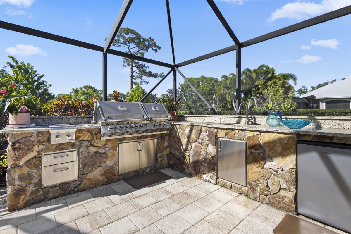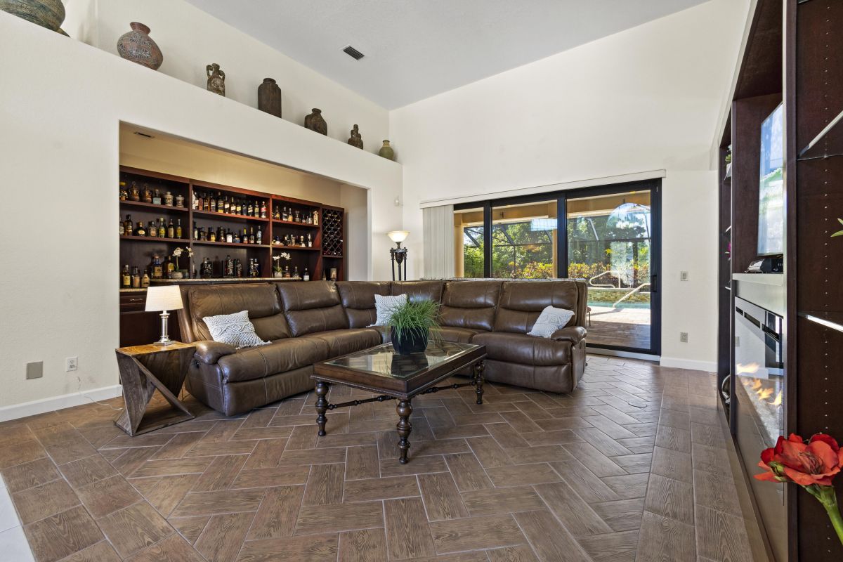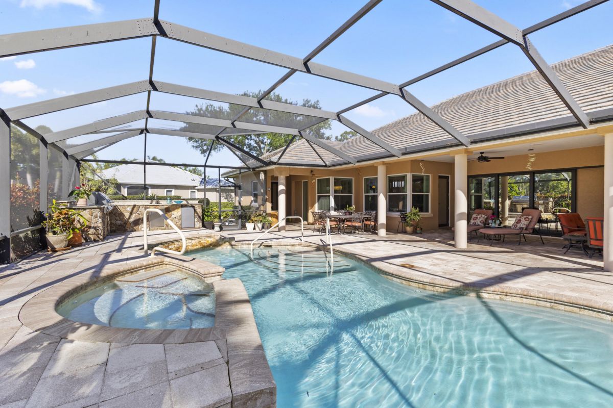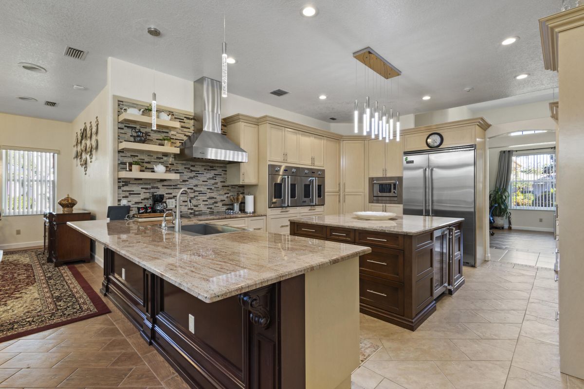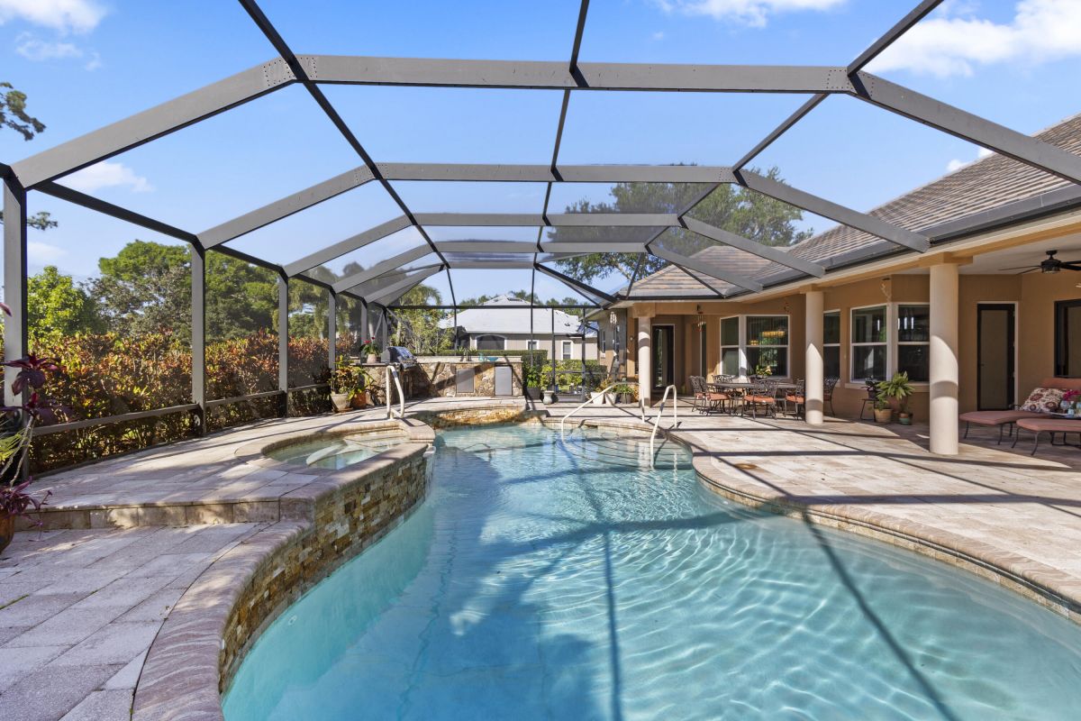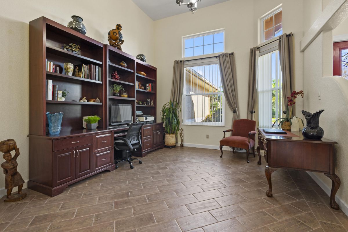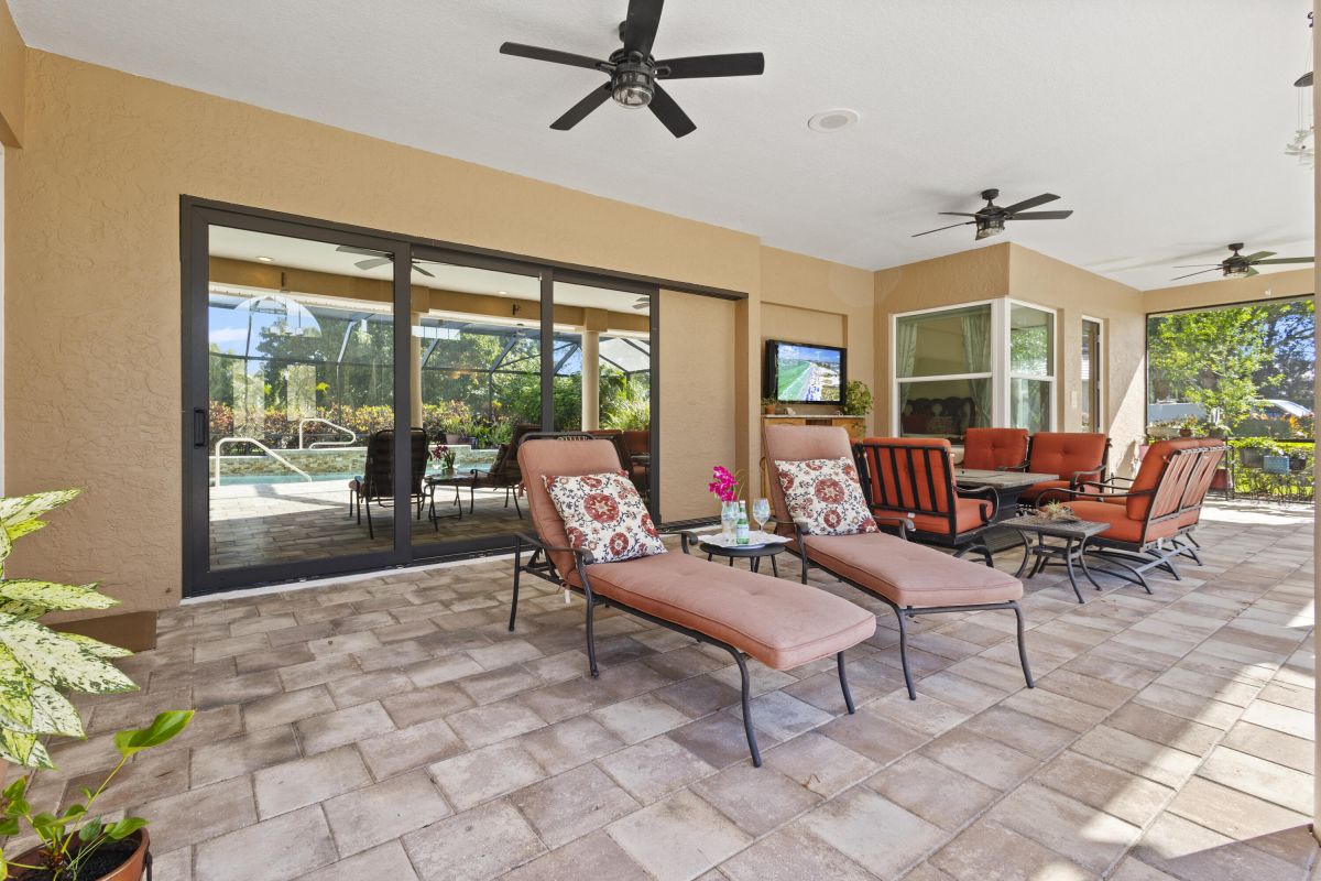 SELLER OFFERING $25,000 AT CLOSE! Looking for something special? Look no further! This custom-built pool home, tucked away in the prestigious PGA Village, offers elegance and privacy on nearly an acre of lush landscaping with mature fruit trees and a tranquil lake backdrop. Boasting over 3,500 sq. ft. of living space, grand coffered ceilings, and nearly 5,000 sq. ft. of total space, it includes 3 ensuite bedrooms, a cabana bath with patio access, a den, and a flex space. The living room features a built-in wall unit with triple pocket sliders for seamless indoor-outdoor living. The gourmet chef's kitchen, recently remodeled, showcases granite counters, a large island, and top of the line Viking appliances, including a double oven, convection oven, hood vent, refrigerator , and wine chille