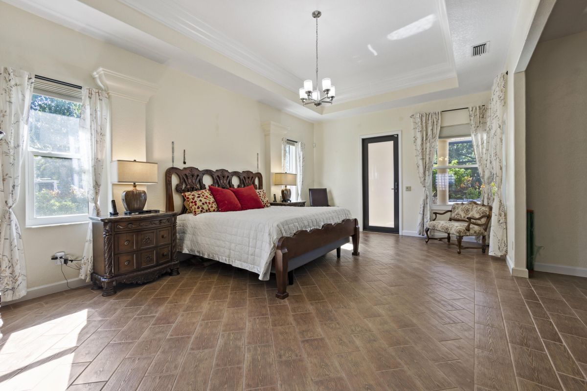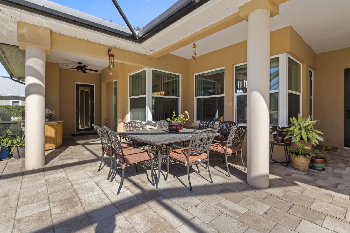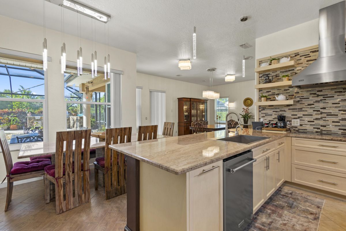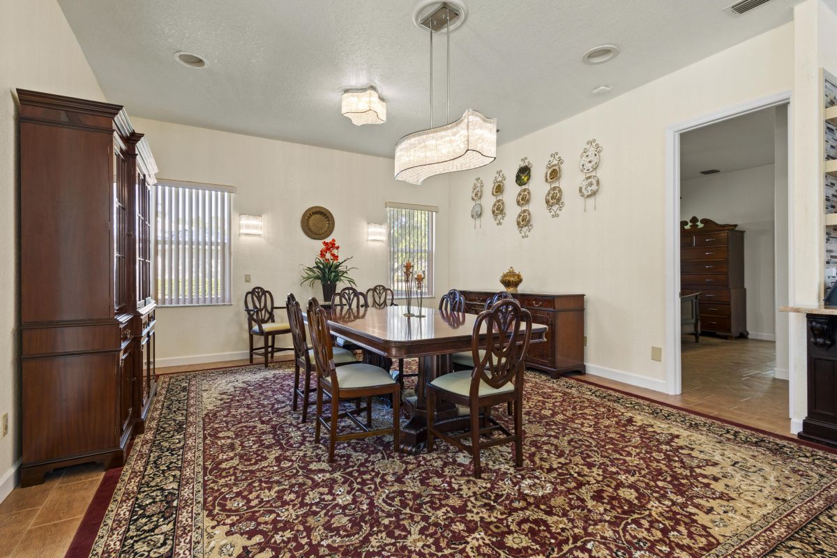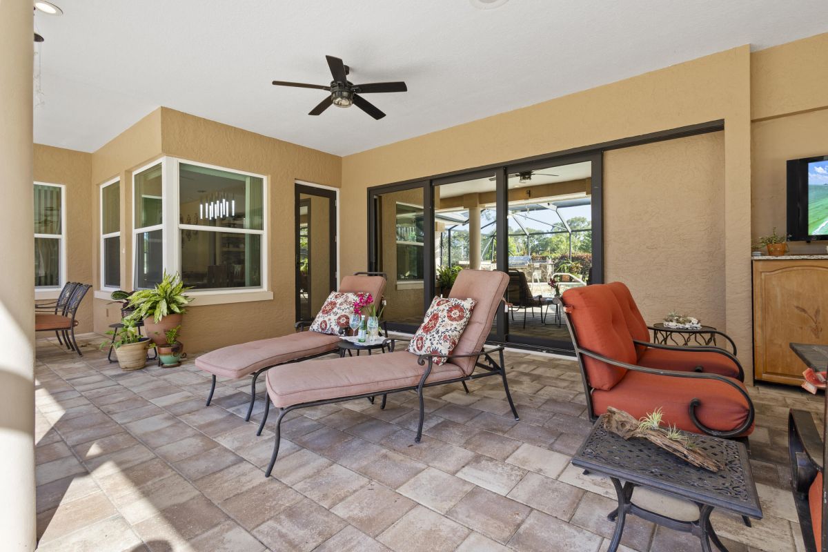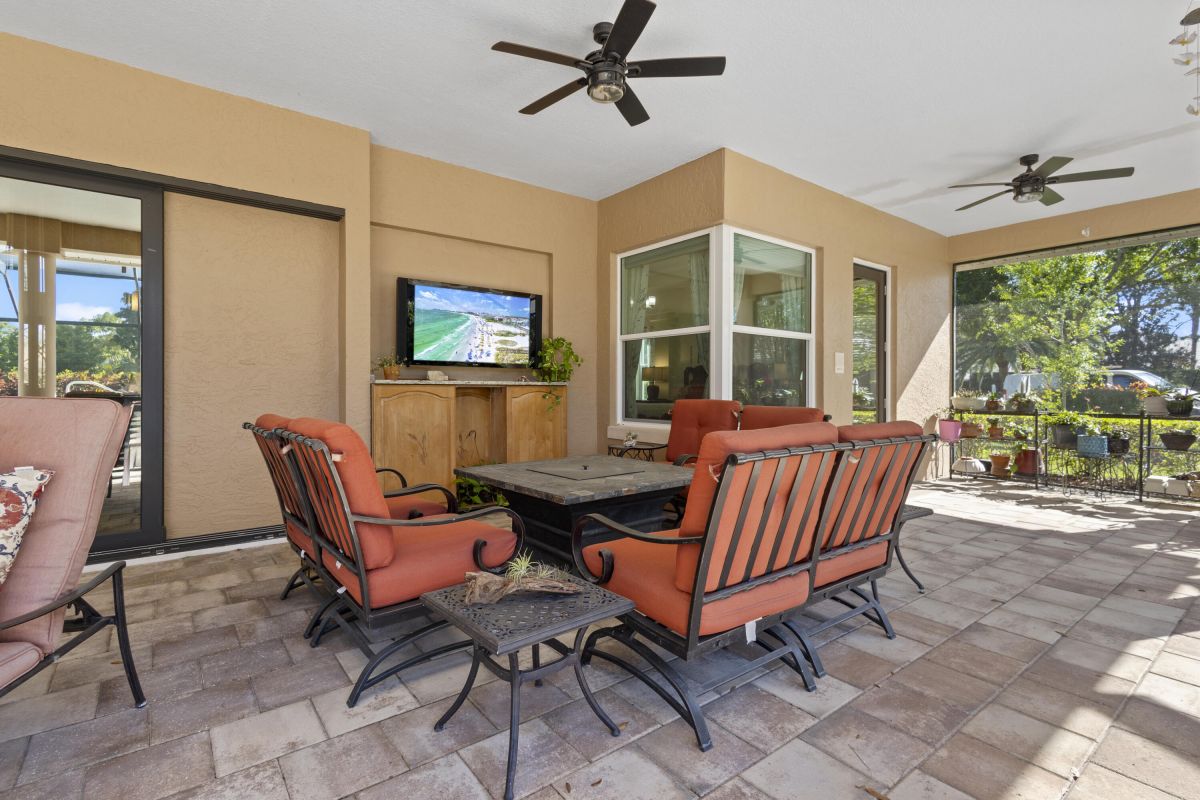 SELLER OFFERING $25,000 AT CLOSE! Looking for something special? Look no further! This custom-built pool home, tucked away in the prestigious PGA Village, offers elegance and privacy on nearly an acre of lush landscaping with mature fruit trees and a tranquil lake backdrop. Boasting over 3,500 sq. ft. of living space, grand coffered ceilings, and nearly 5,000 sq. ft. of total space, it includes 3 ensuite bedrooms, a cabana bath with patio access, a den, and a flex space. The living room features a built-in wall unit with triple pocket sliders for seamless indoor-outdoor living. The gourmet chef's kitchen, recently remodeled, showcases granite counters, a large island, and top of the line Viking appliances, including a double oven, convection oven, hood vent, refrigerator , and wine chille
