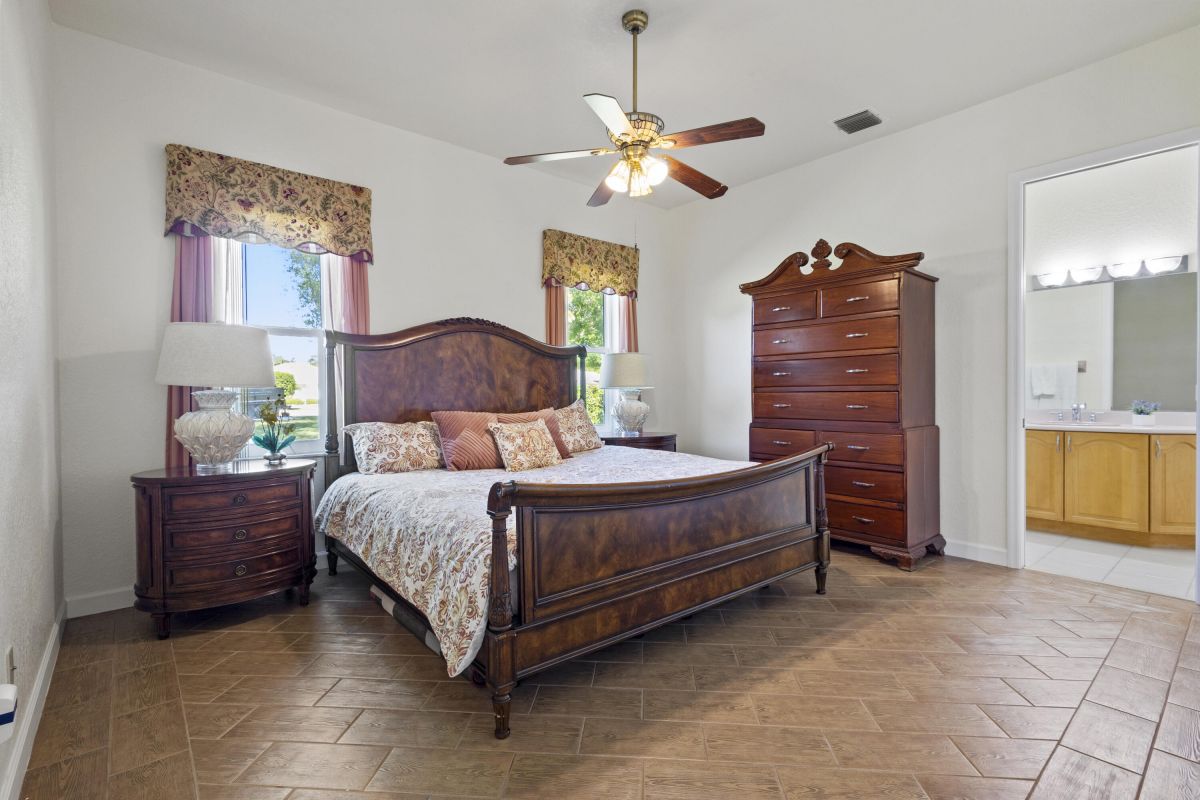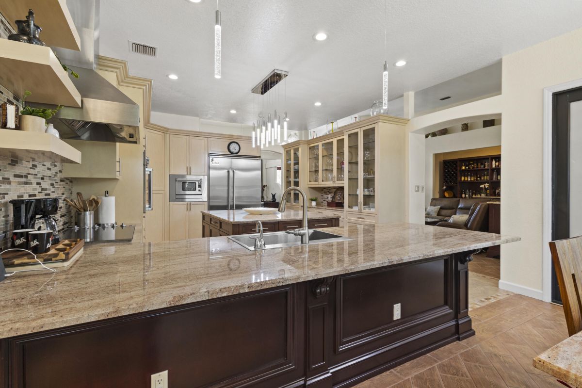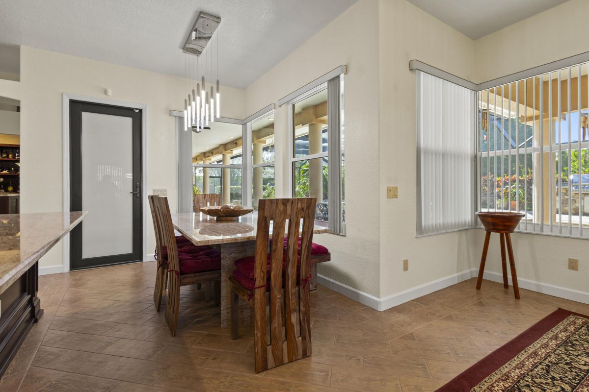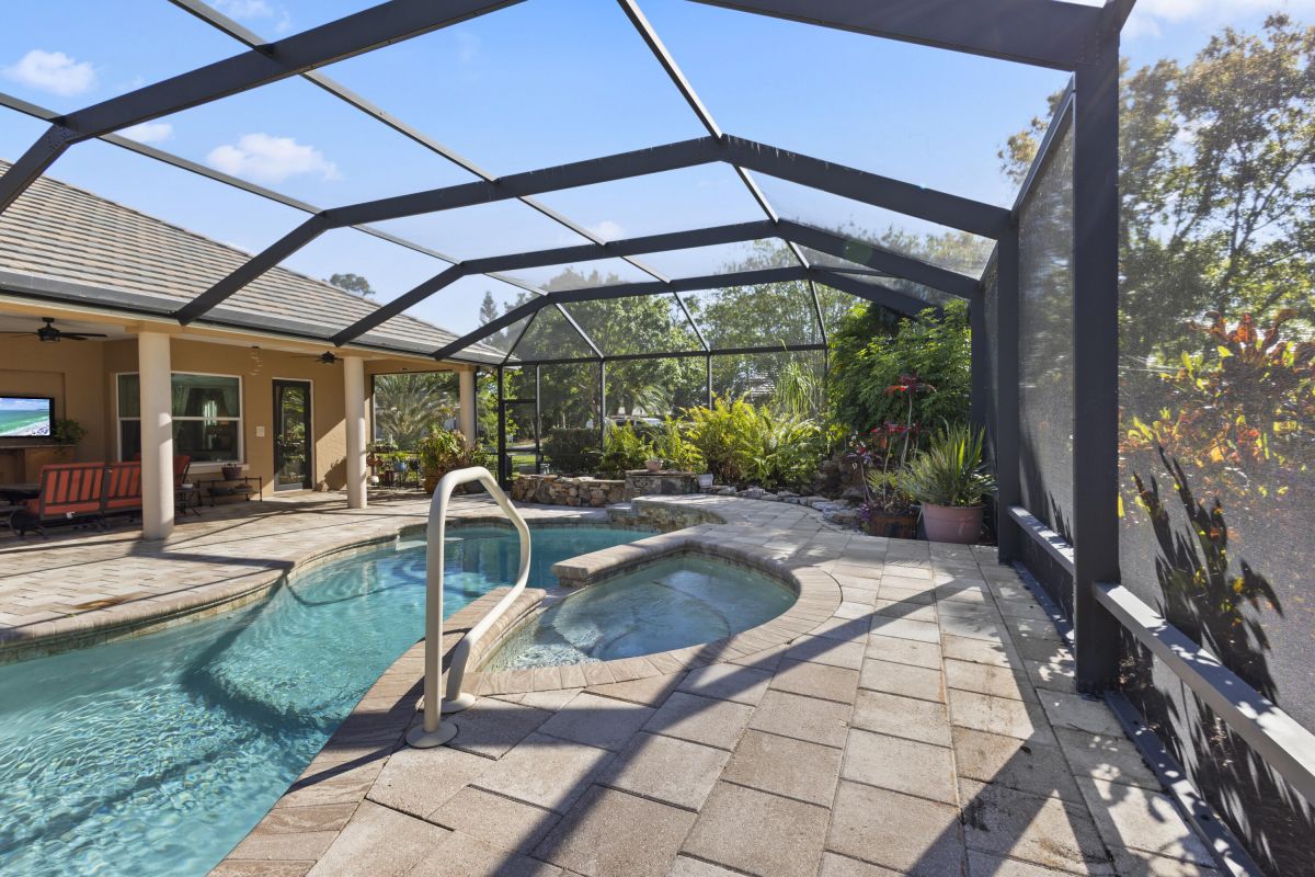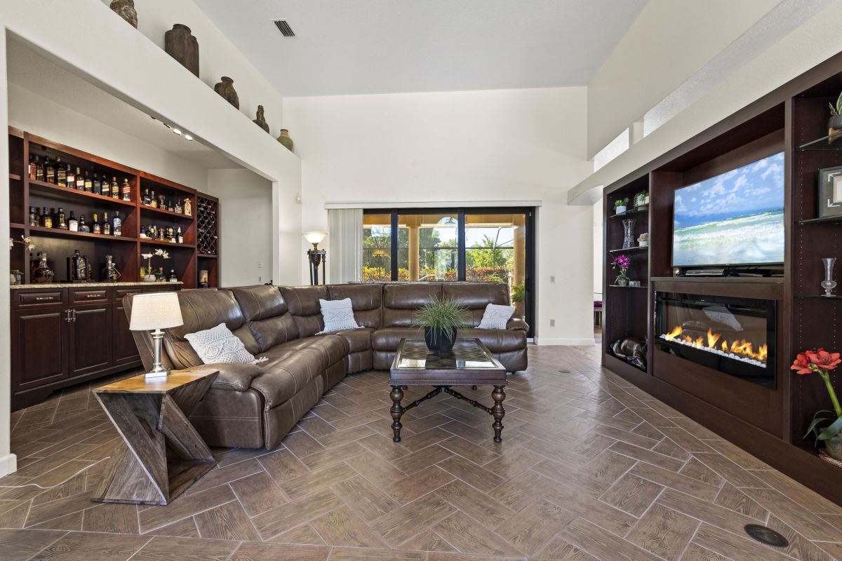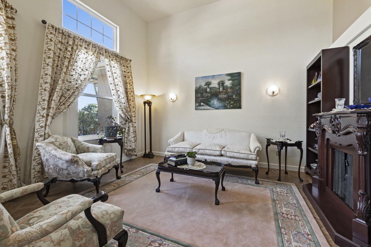SELLER OFFERING $25,000 AT CLOSE! Looking for something special? Look no further! This custom-built pool home, tucked away in the prestigious PGA Village, offers elegance and privacy on nearly an acre of lush landscaping with mature fruit trees and a tranquil lake backdrop. Boasting over 3,500 sq. ft. of living space, grand coffered ceilings, and nearly 5,000 sq. ft. of total space, it includes 3 ensuite bedrooms, a cabana bath with patio access, a den, and a flex space. The living room features a built-in wall unit with triple pocket sliders for seamless indoor-outdoor living. The gourmet chef's kitchen, recently remodeled, showcases granite counters, a large island, and top of the line Viking appliances, including a double oven, convection oven, hood vent, refrigerator , and wine chille