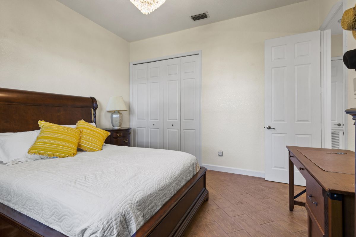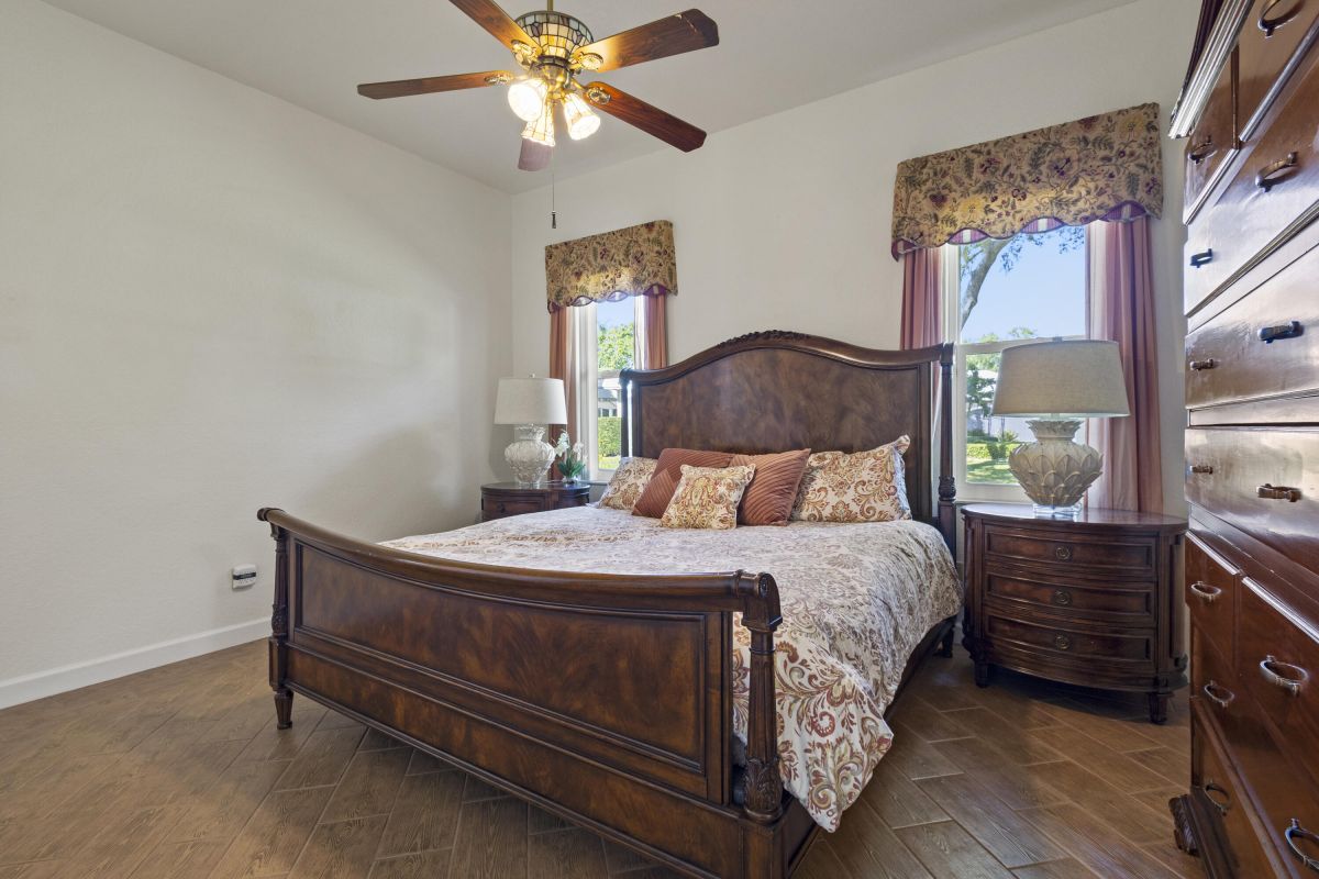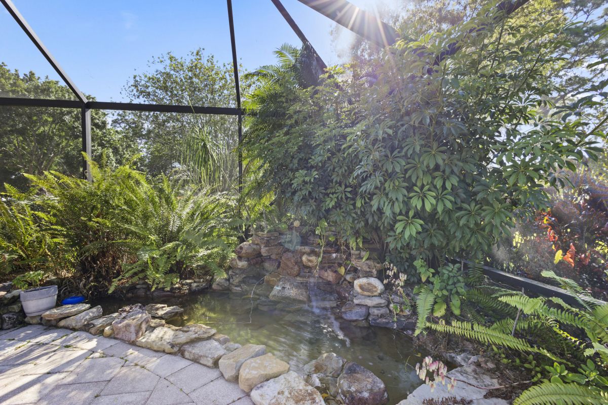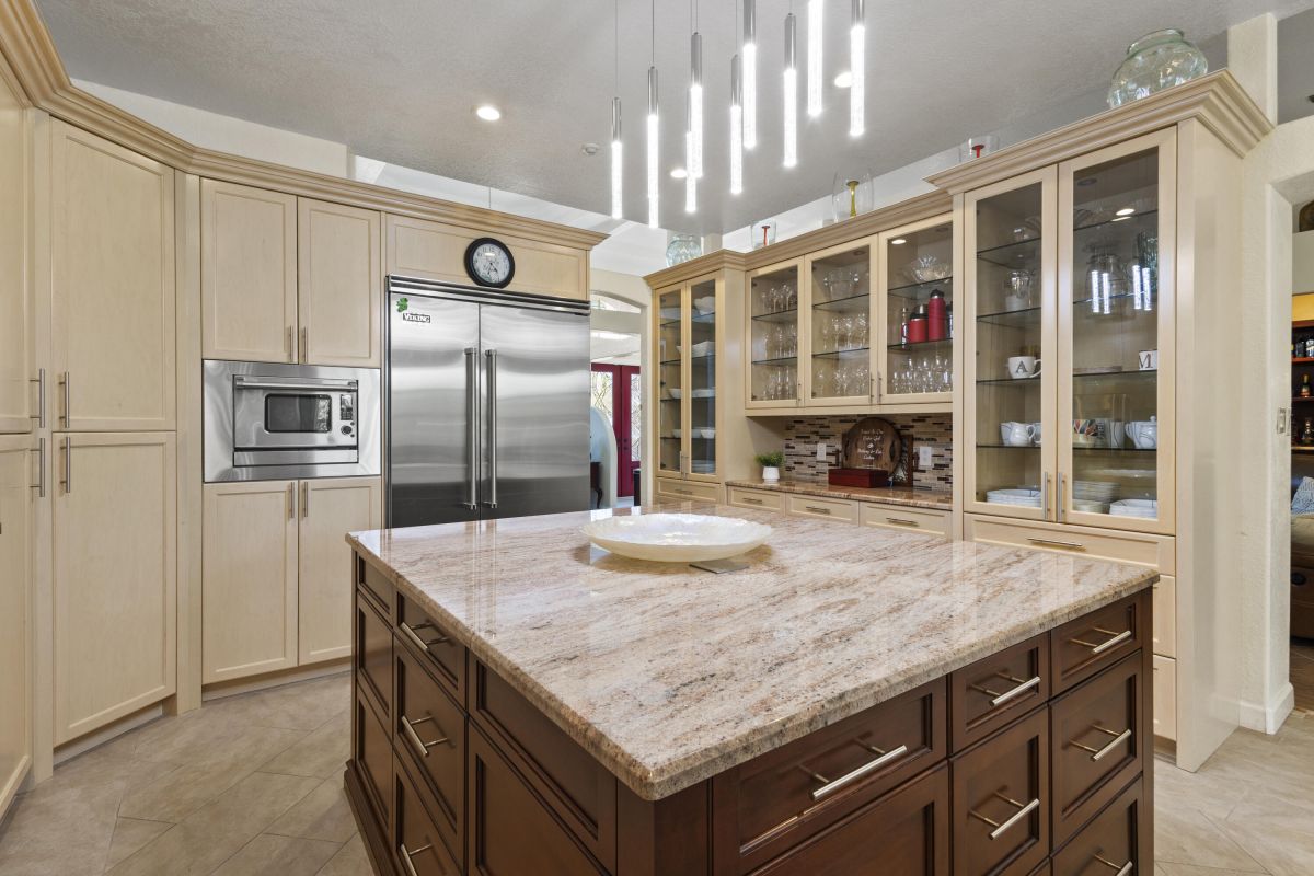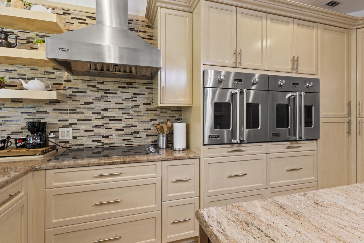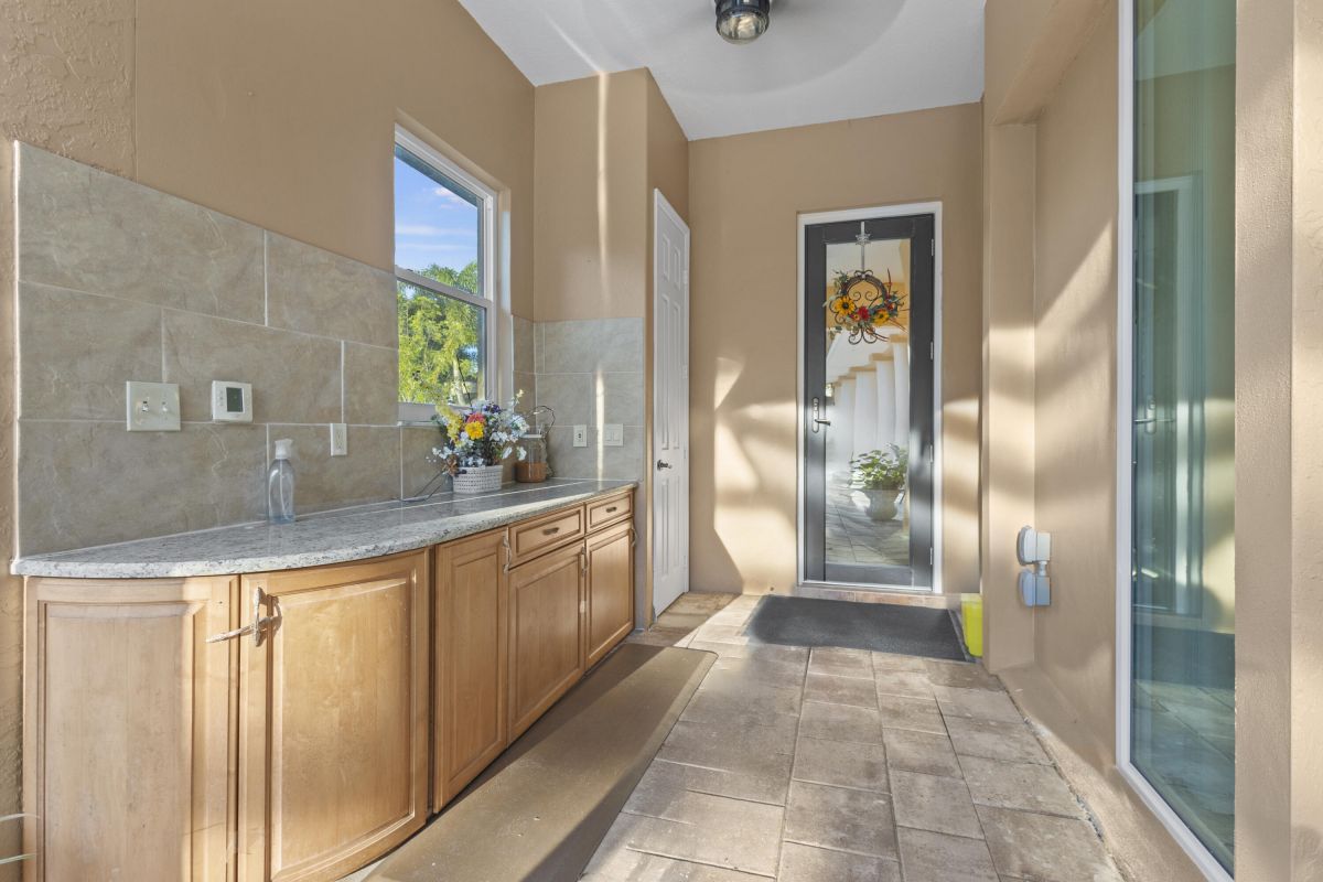 SELLER OFFERING $25,000 AT CLOSE! Looking for something special? Look no further! This custom-built pool home, tucked away in the prestigious PGA Village, offers elegance and privacy on nearly an acre of lush landscaping with mature fruit trees and a tranquil lake backdrop. Boasting over 3,500 sq. ft. of living space, grand coffered ceilings, and nearly 5,000 sq. ft. of total space, it includes 3 ensuite bedrooms, a cabana bath with patio access, a den, and a flex space. The living room features a built-in wall unit with triple pocket sliders for seamless indoor-outdoor living. The gourmet chef's kitchen, recently remodeled, showcases granite counters, a large island, and top of the line Viking appliances, including a double oven, convection oven, hood vent, refrigerator , and wine chille