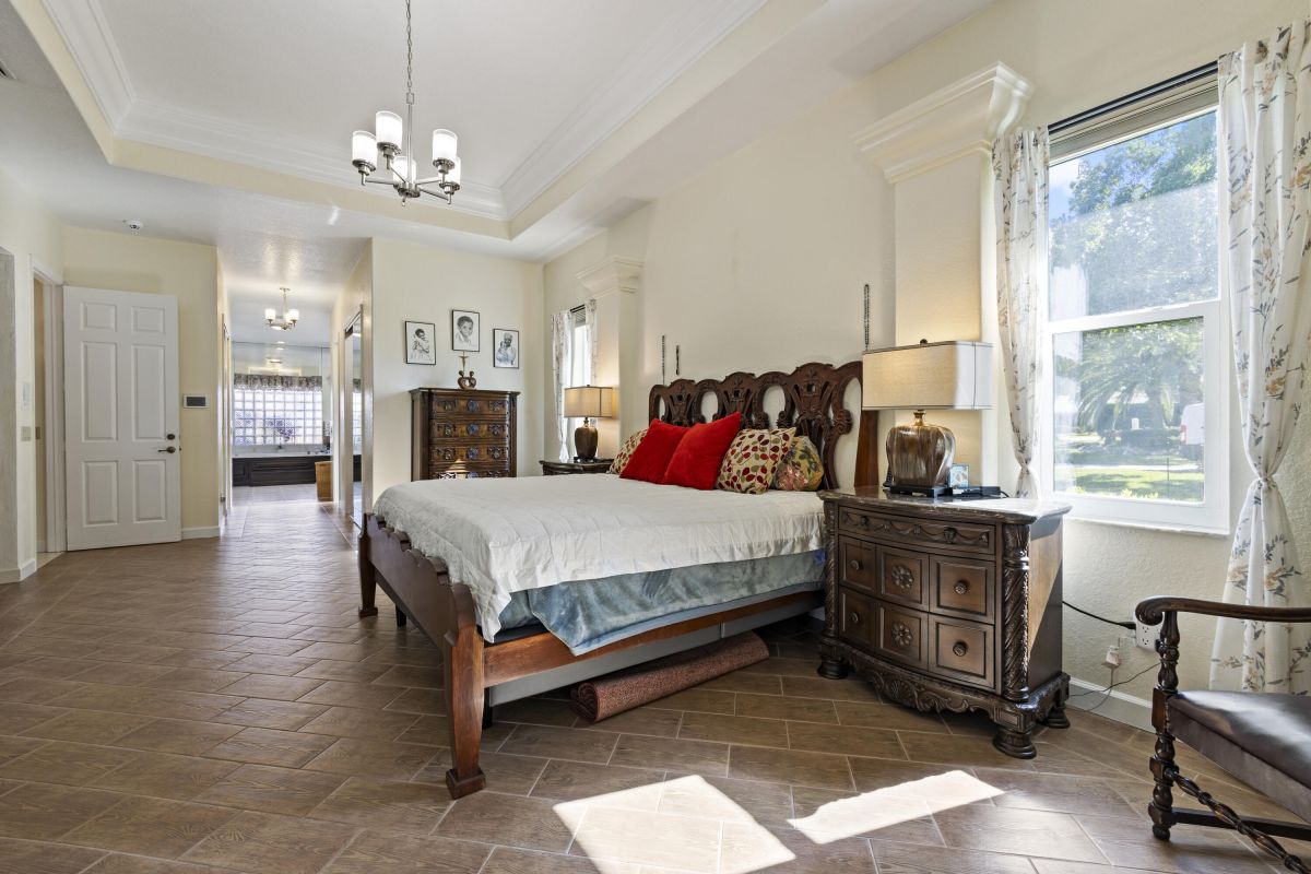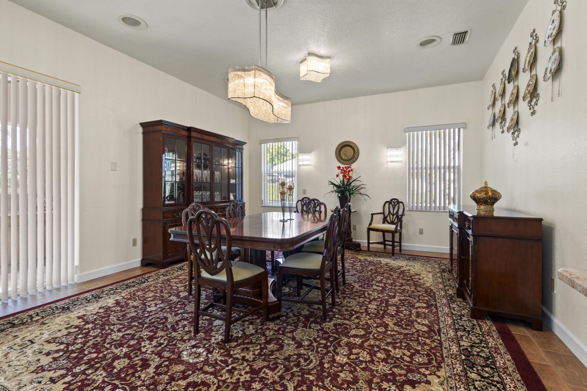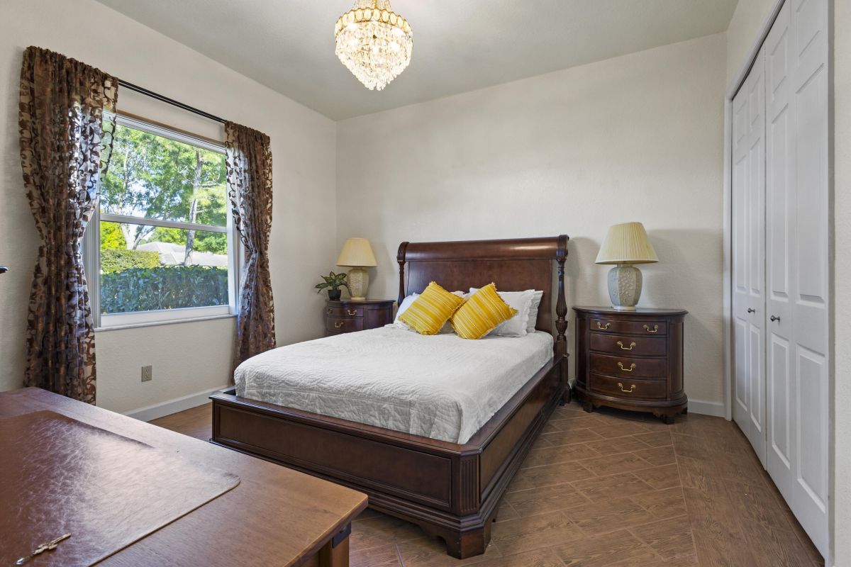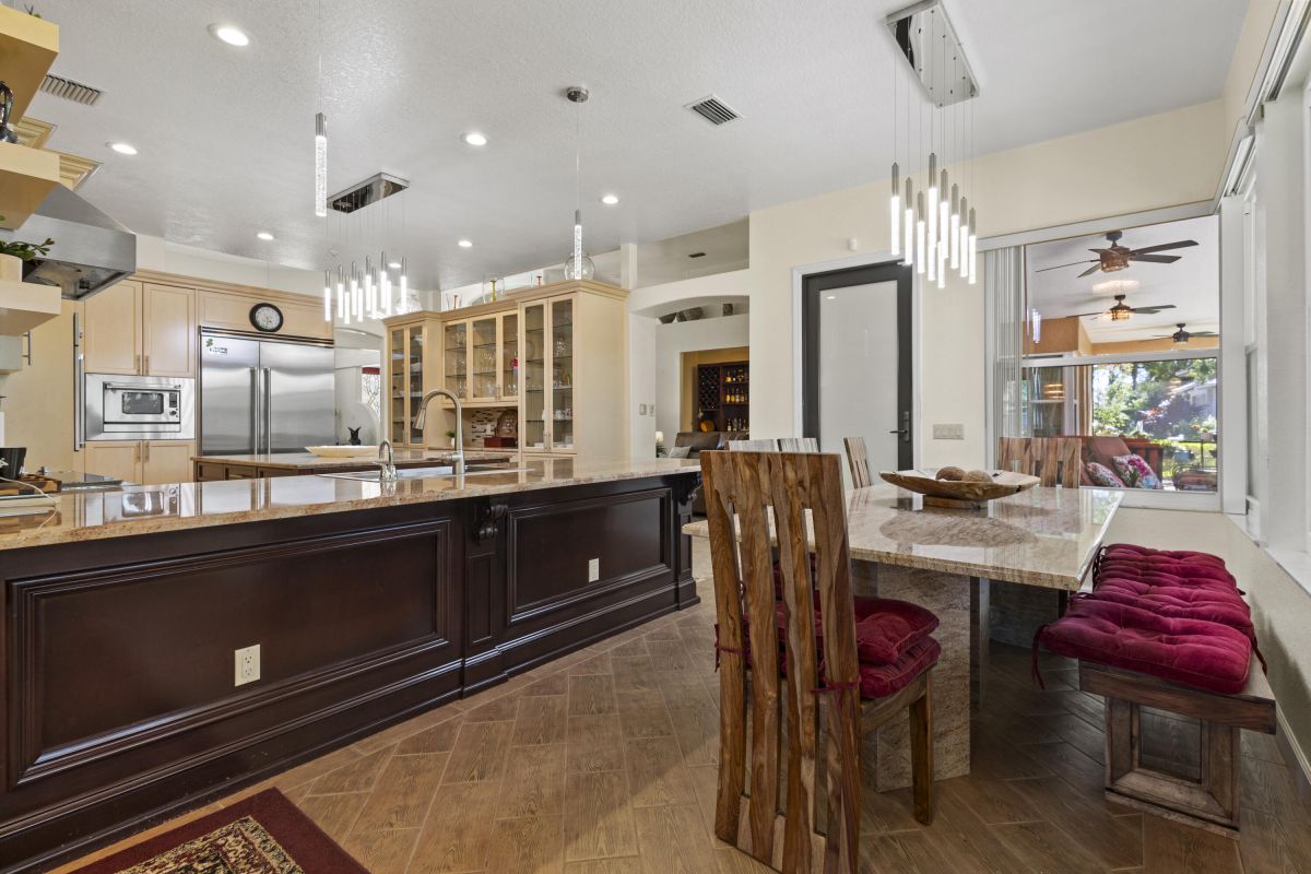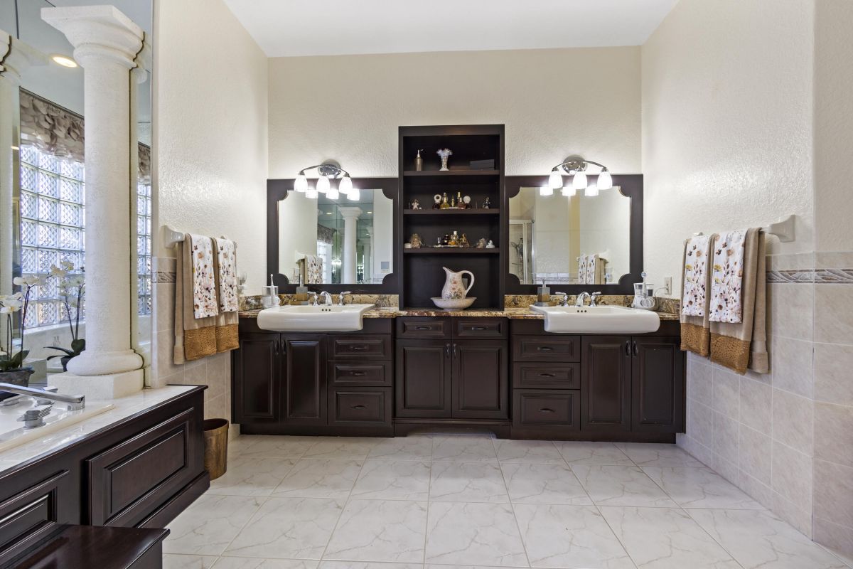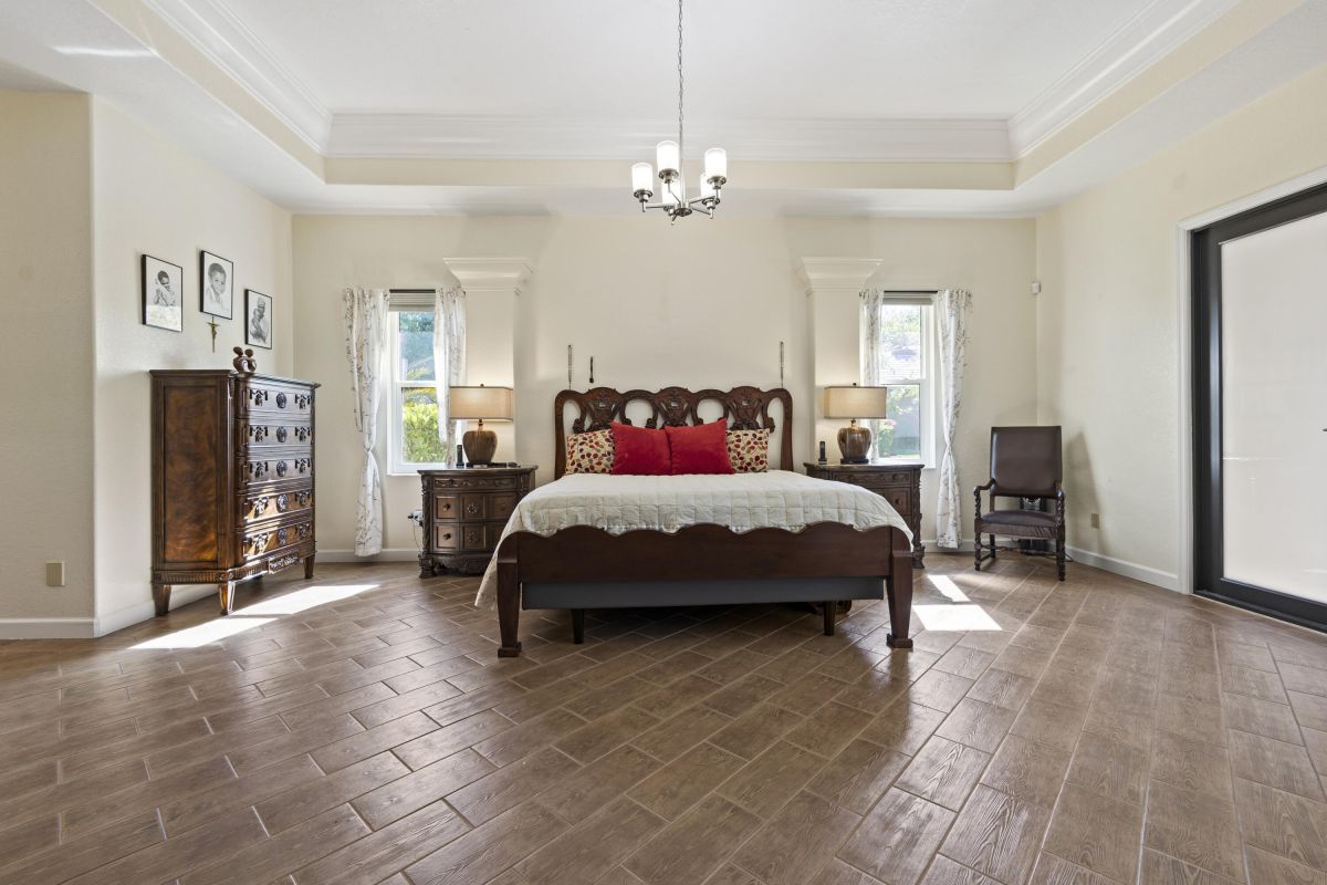 SELLER OFFERING $25,000 AT CLOSE! Looking for something special? Look no further! This custom-built pool home, tucked away in the prestigious PGA Village, offers elegance and privacy on nearly an acre of lush landscaping with mature fruit trees and a tranquil lake backdrop. Boasting over 3,500 sq. ft. of living space, grand coffered ceilings, and nearly 5,000 sq. ft. of total space, it includes 3 ensuite bedrooms, a cabana bath with patio access, a den, and a flex space. The living room features a built-in wall unit with triple pocket sliders for seamless indoor-outdoor living. The gourmet chef's kitchen, recently remodeled, showcases granite counters, a large island, and top of the line Viking appliances, including a double oven, convection oven, hood vent, refrigerator , and wine chille