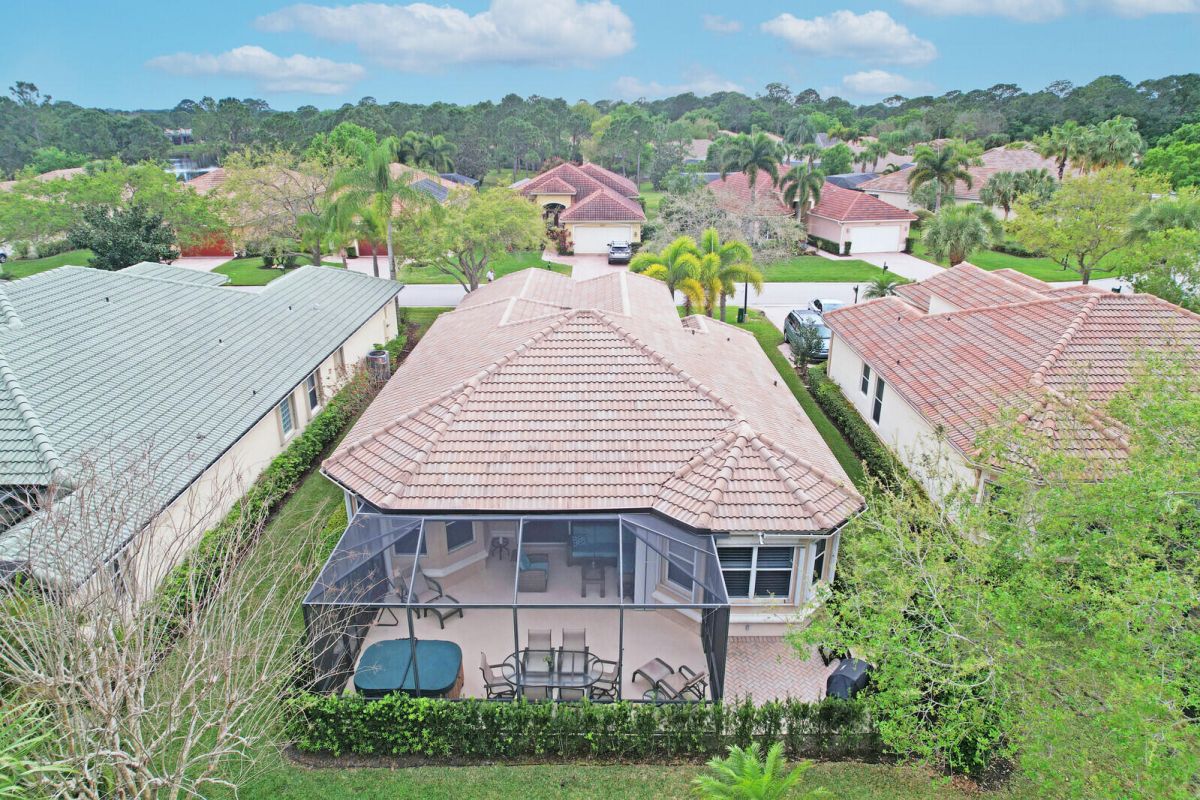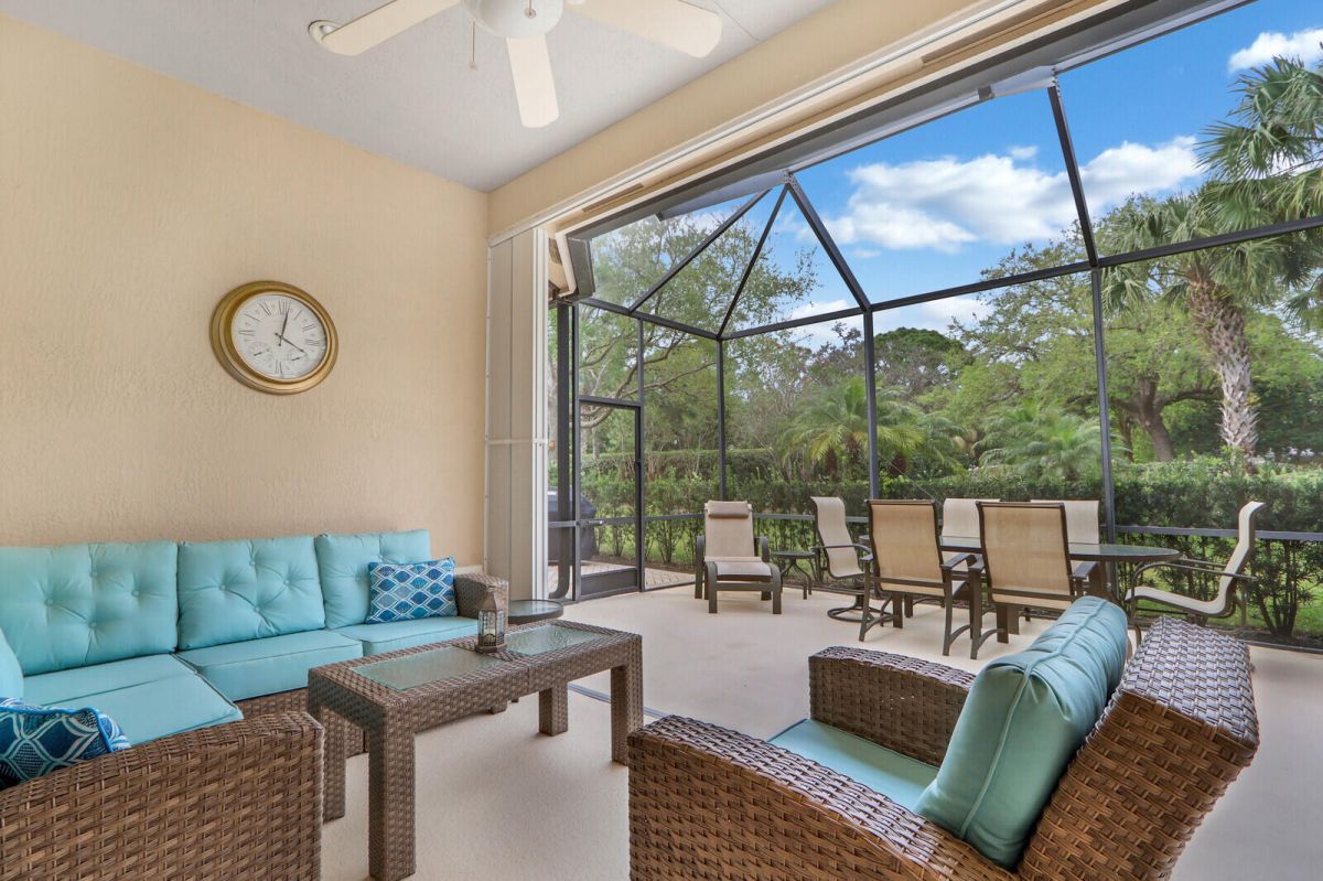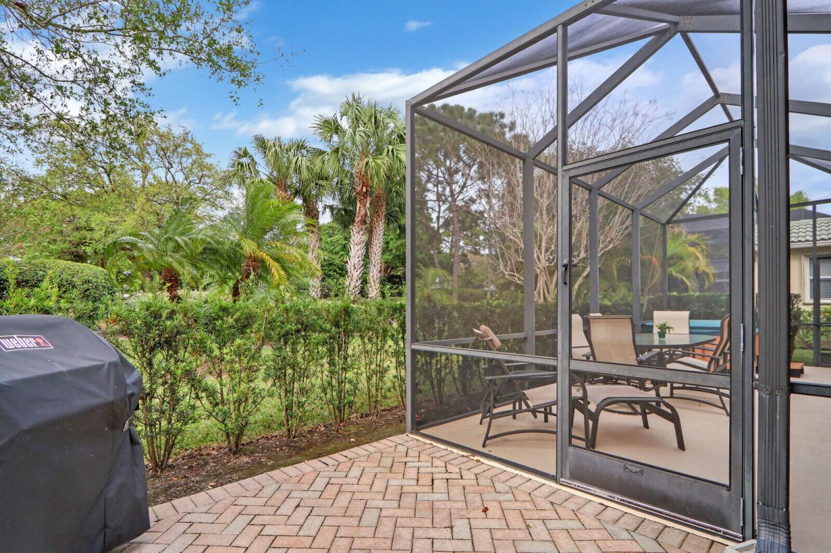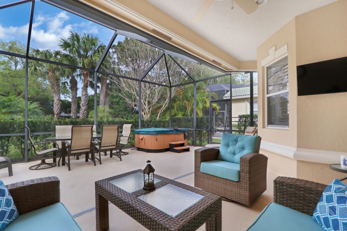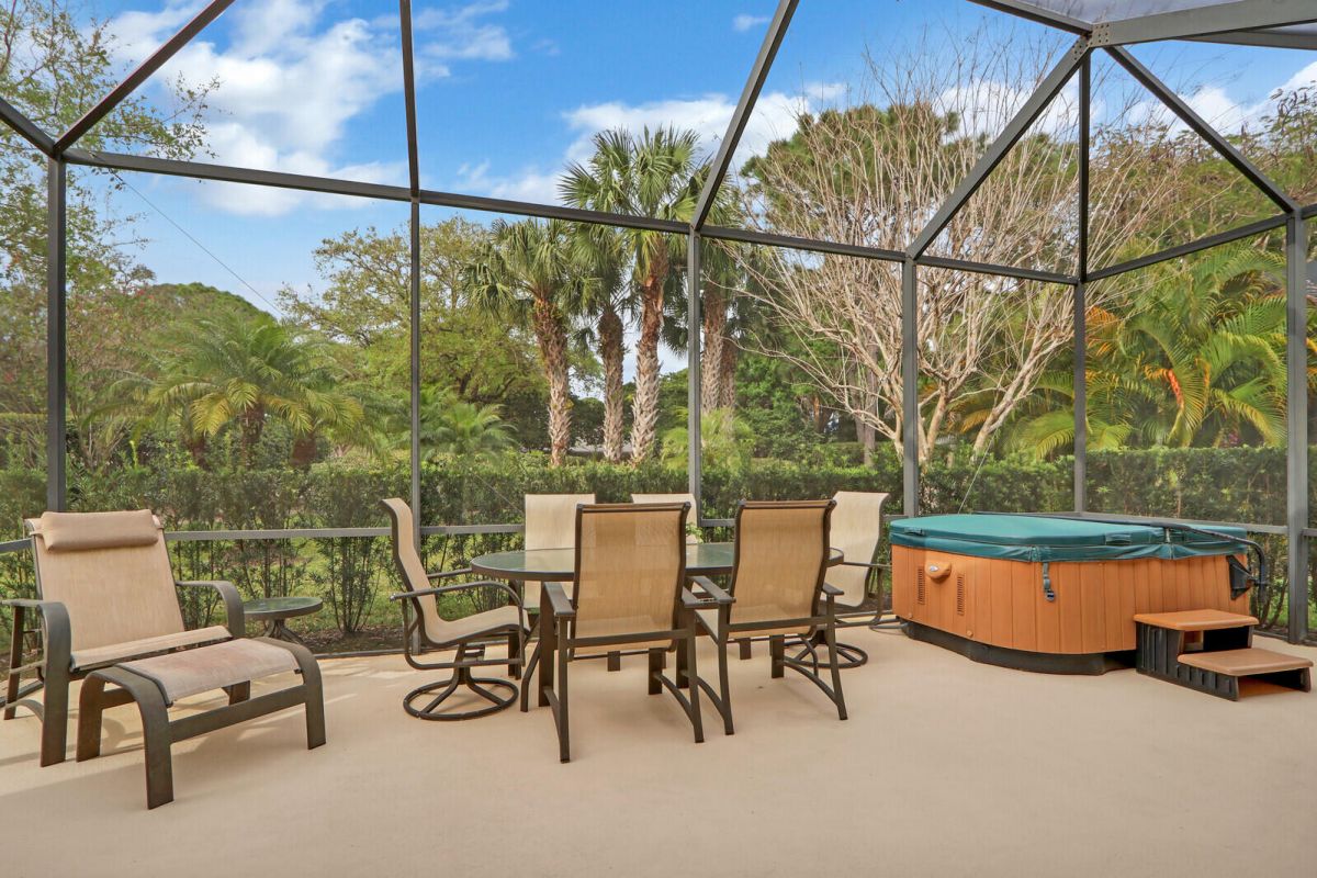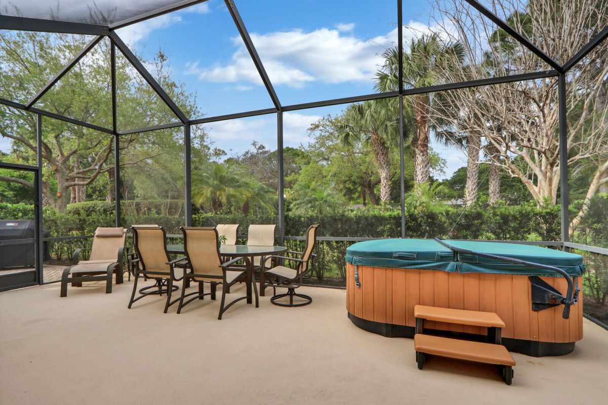 NESTLED IN GREENBRIER NEIGHBORHOOD IN THE HEART OF PGA VILLAGE, just a stone's throw away from The Legacy Golf & Tennis Club & a short golf cart ride to The PGA Golf Club & it's 3 world class championship golf courses! This charming home boast a private, treed rear yard & an extended lanai that beckons you to relax & unwind in the hot tub after a day on the course! Inside the pride of ownership & attention to detail is evident in every corner. This open, great room plan has 2 spacious brs + den, 2 full baths & a convenient 1/2 bath, the perfect combination for comfort & convenience! For added peace of mind, accordion shutters provide protection, ensuring the safety & security of the home during storm season. NEW SS APPLIANCES. Gently lived in & lovingly maintained by the original owner