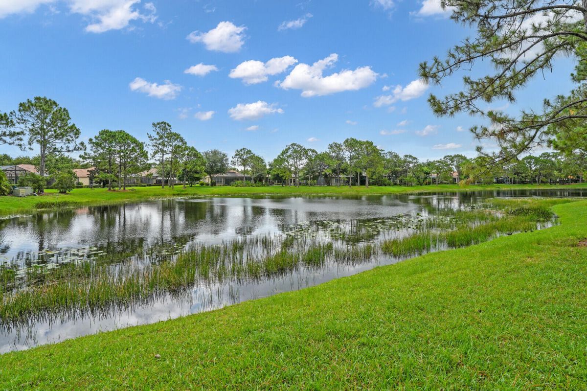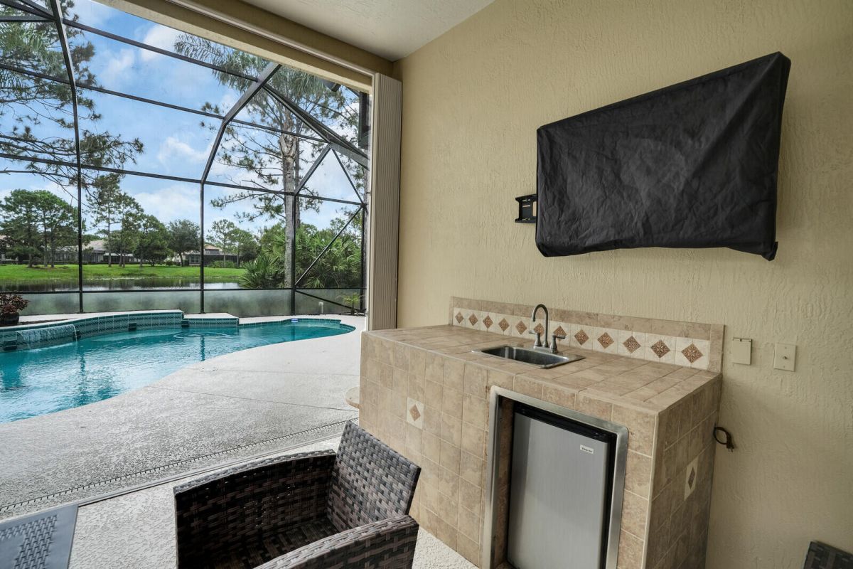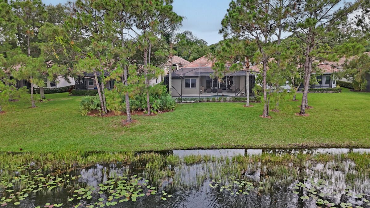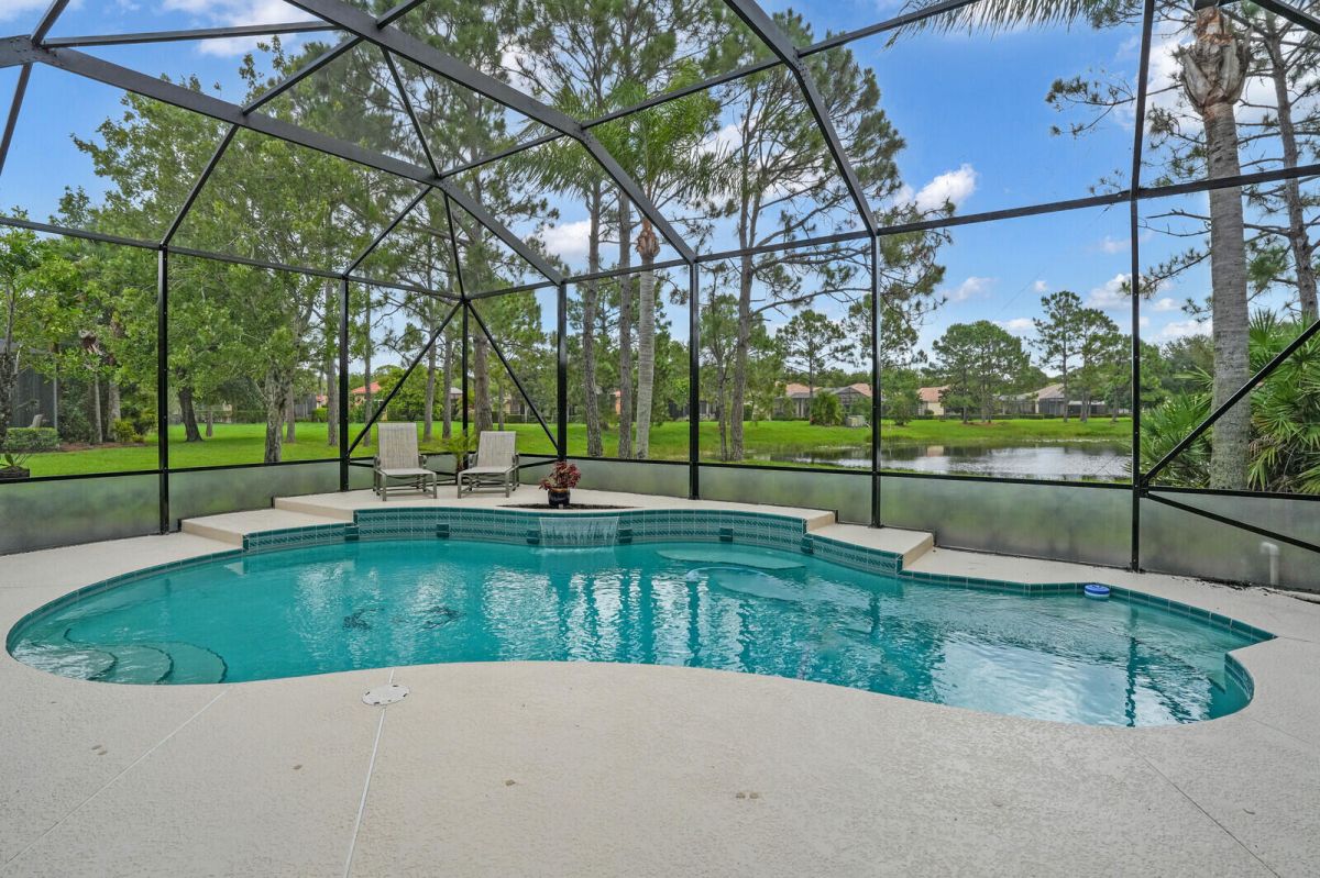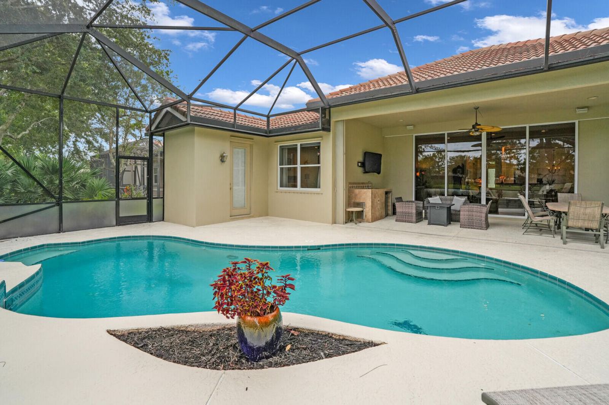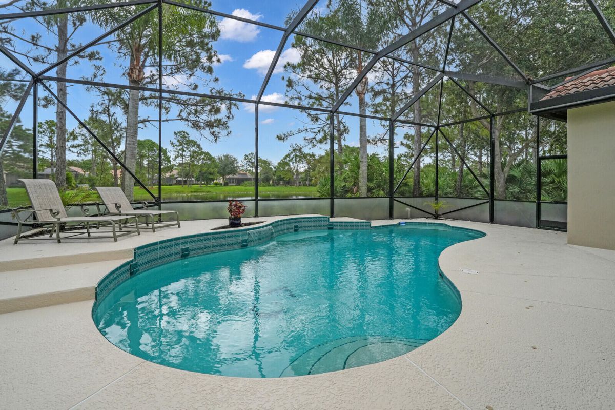 Stunning Pool Home on the Water in PGA Village! Beautifully maintained & freshly painted Medinah model with private, peaceful water view in the Greenbrier neighborhood-right in the heart of PGA Village. Offering 2,284 sq. ft. of air-conditioned living space, this spacious 2-bedroom plus den, 3.5-bath home can easily be converted to 3 bedrooms plus den to suit your lifestyle. Enjoy Florida living at its finest with a screened pool overlooking the water, a covered patio & summer kitchen, 10' pocketing patio doors that fully open to blend indoor & outdoor living-perfect for entertaining Water heater, range & refrigerator new in 2025. Whole house Storm shutters. Located just minutes from the 3 PGA world class golf courses & around the corner from The Legacy Golf & Tennis Club! Paradise