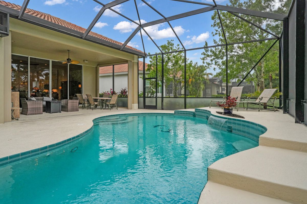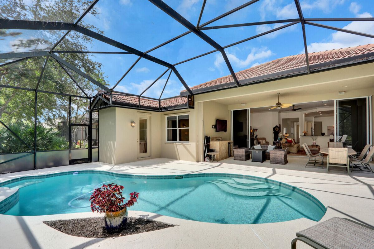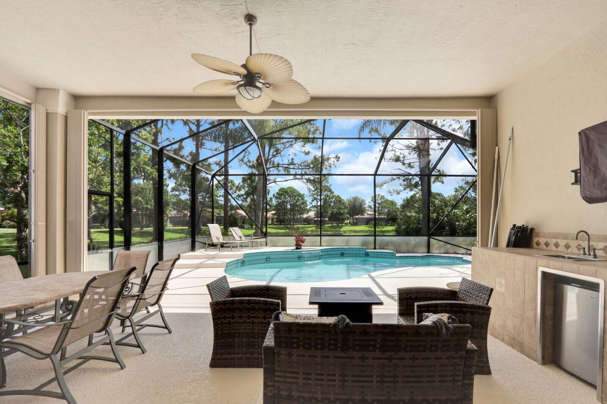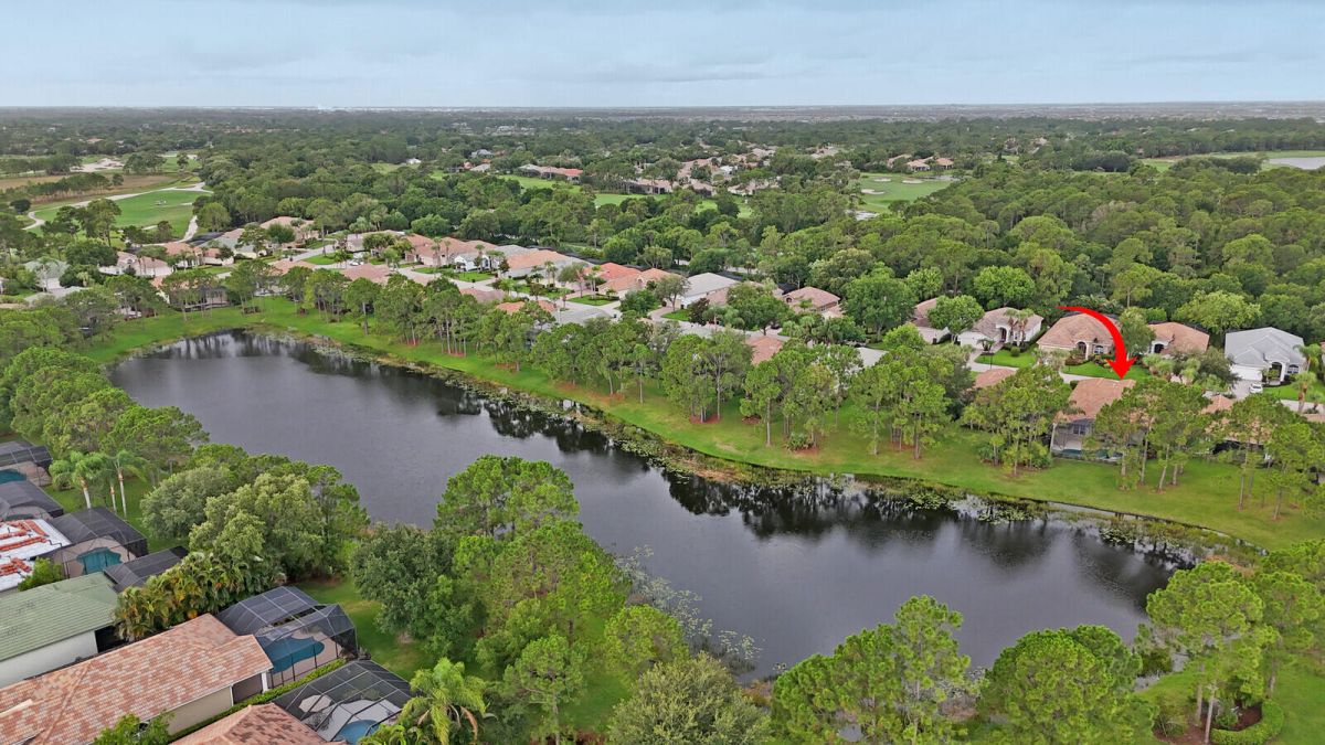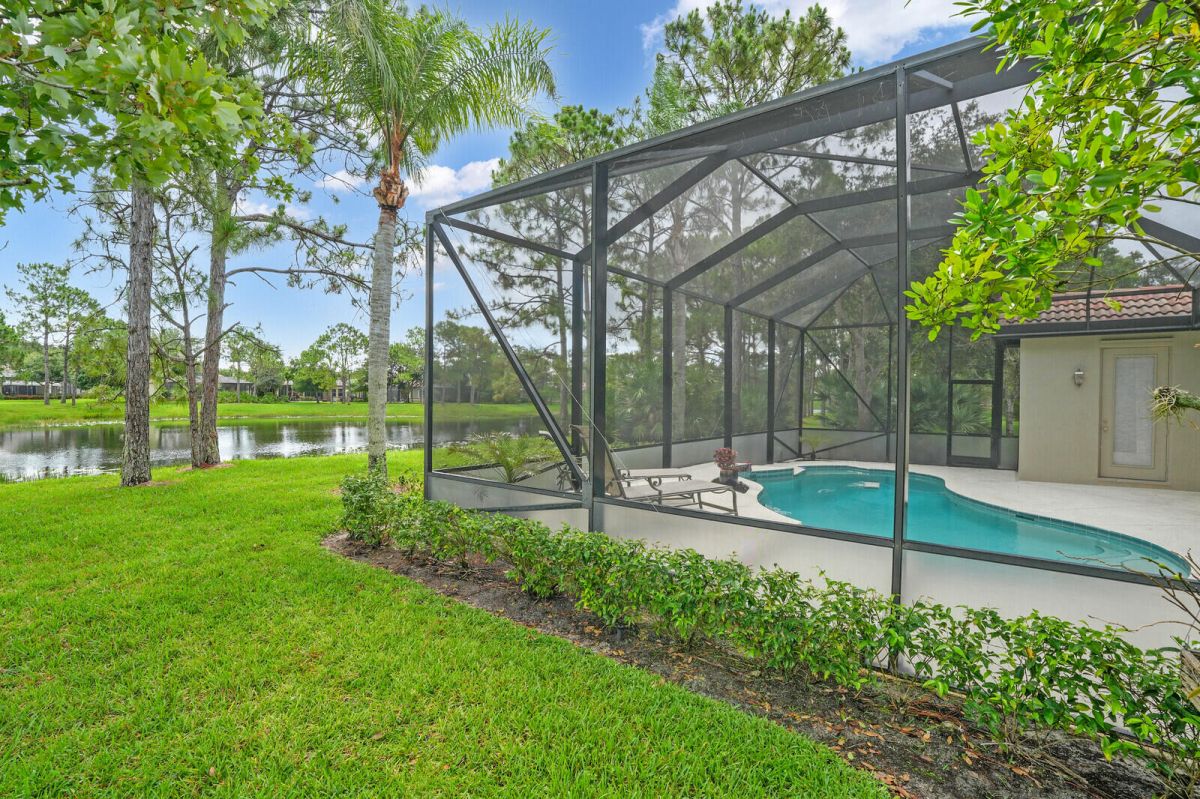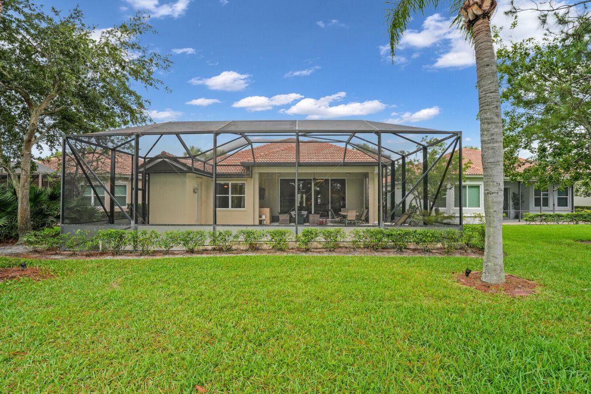 Stunning Pool Home on the Water in PGA Village! Beautifully maintained & freshly painted Medinah model with private, peaceful water view in the Greenbrier neighborhood-right in the heart of PGA Village. Offering 2,284 sq. ft. of air-conditioned living space, this spacious 2-bedroom plus den, 3.5-bath home can easily be converted to 3 bedrooms plus den to suit your lifestyle. Enjoy Florida living at its finest with a screened pool overlooking the water, a covered patio & summer kitchen, 10' pocketing patio doors that fully open to blend indoor & outdoor living-perfect for entertaining Water heater, range & refrigerator new in 2025. Whole house Storm shutters. Located just minutes from the 3 PGA world class golf courses & around the corner from The Legacy Golf & Tennis Club! Paradise
