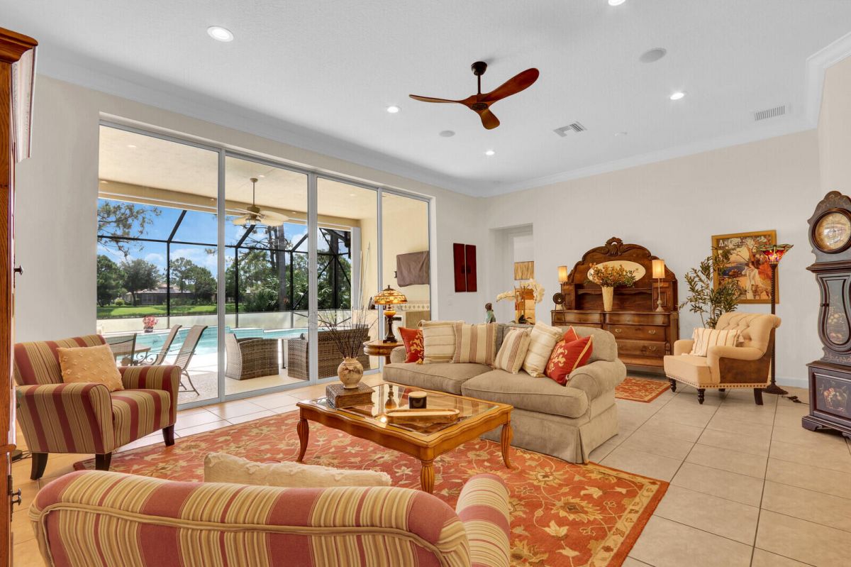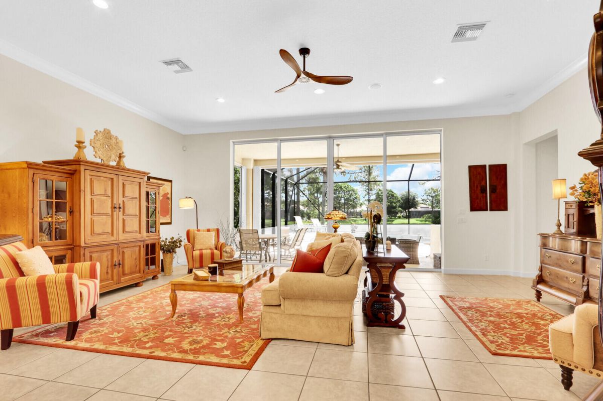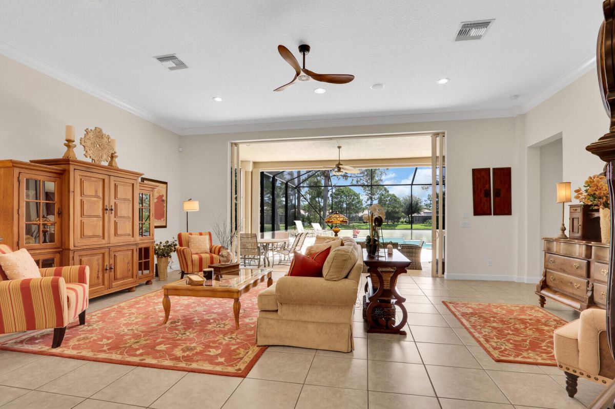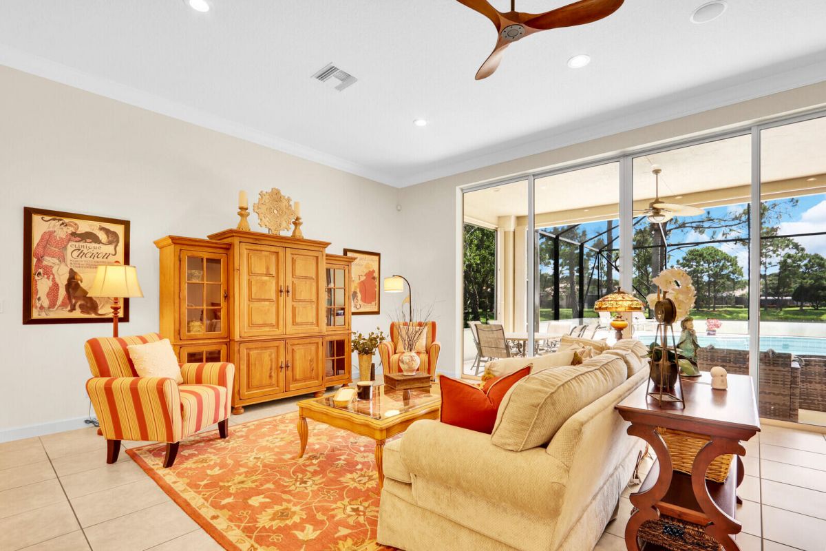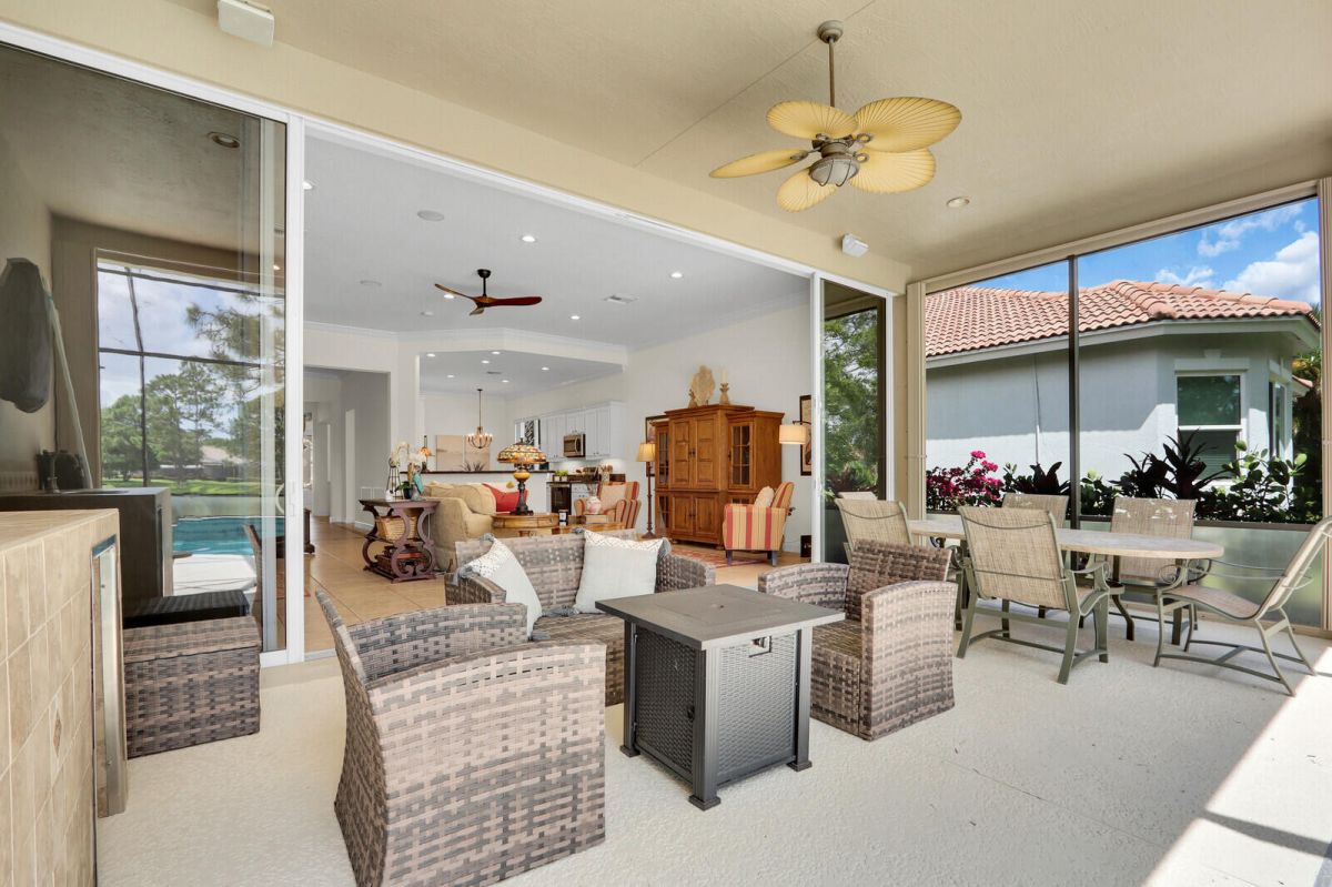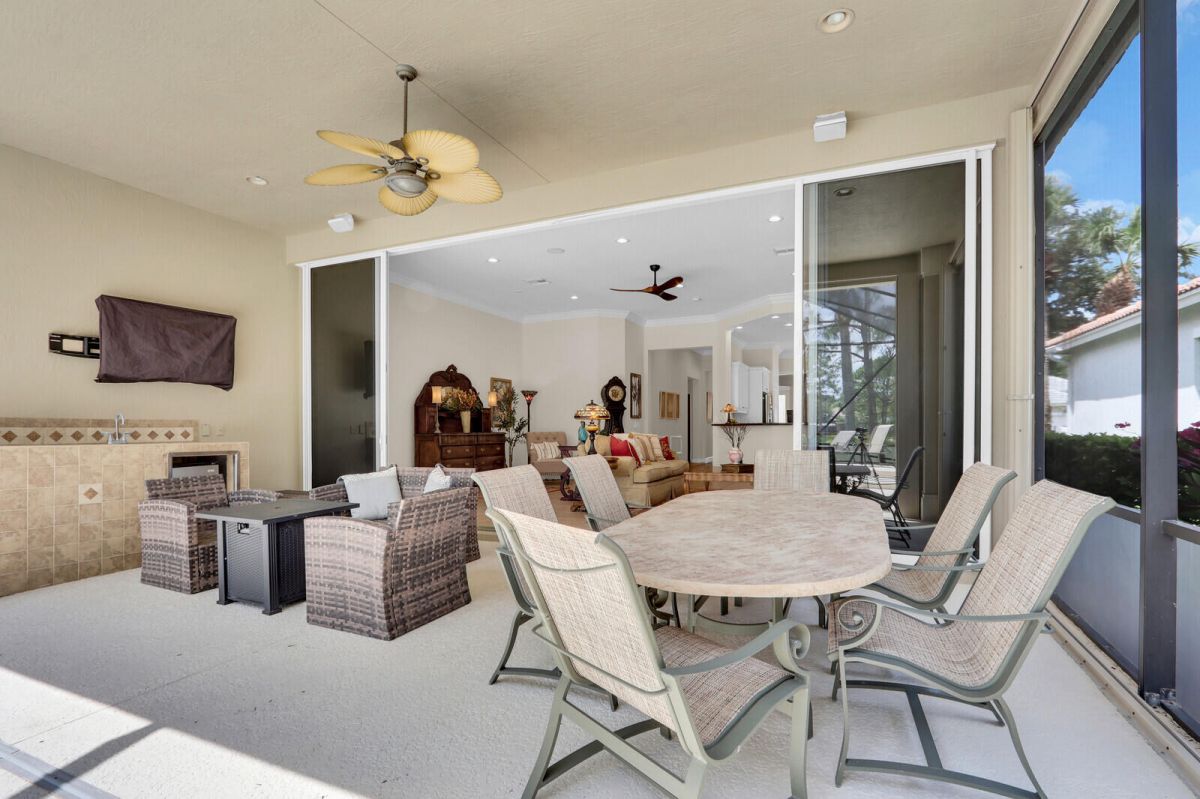 Stunning Pool Home on the Water in PGA Village! Beautifully maintained & freshly painted Medinah model with private, peaceful water view in the Greenbrier neighborhood-right in the heart of PGA Village. Offering 2,284 sq. ft. of air-conditioned living space, this spacious 2-bedroom plus den, 3.5-bath home can easily be converted to 3 bedrooms plus den to suit your lifestyle. Enjoy Florida living at its finest with a screened pool overlooking the water, a covered patio & summer kitchen, 10' pocketing patio doors that fully open to blend indoor & outdoor living-perfect for entertaining Water heater, range & refrigerator new in 2025. Whole house Storm shutters. Located just minutes from the 3 PGA world class golf courses & around the corner from The Legacy Golf & Tennis Club! Paradise