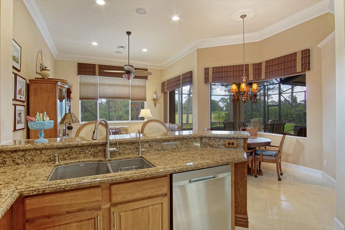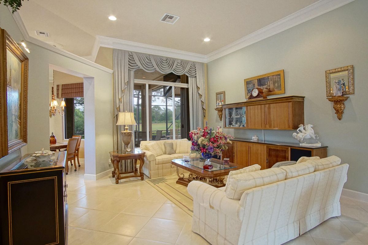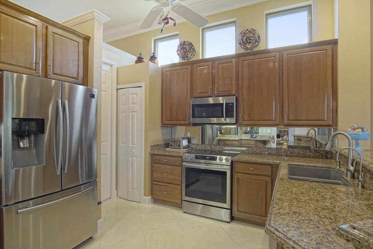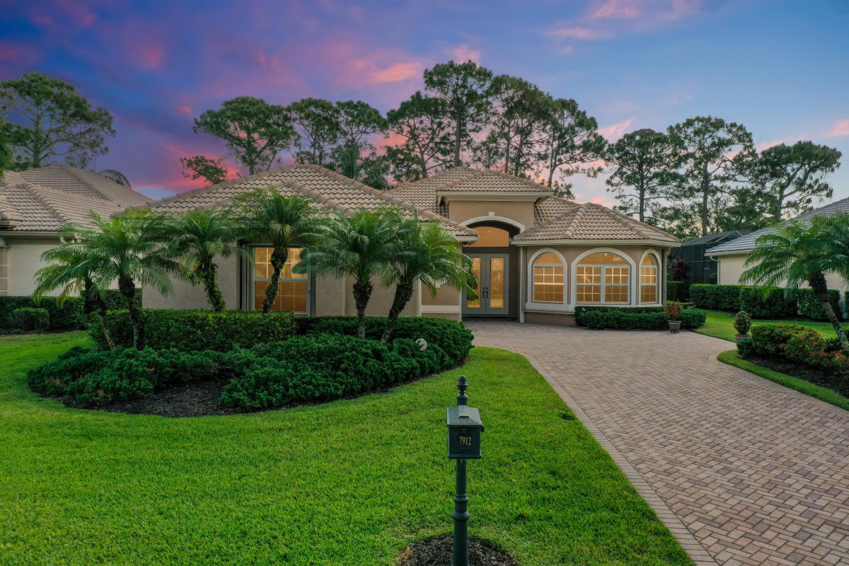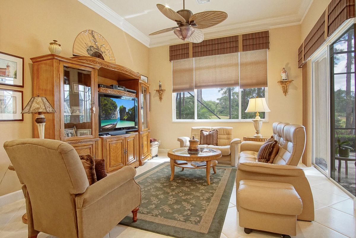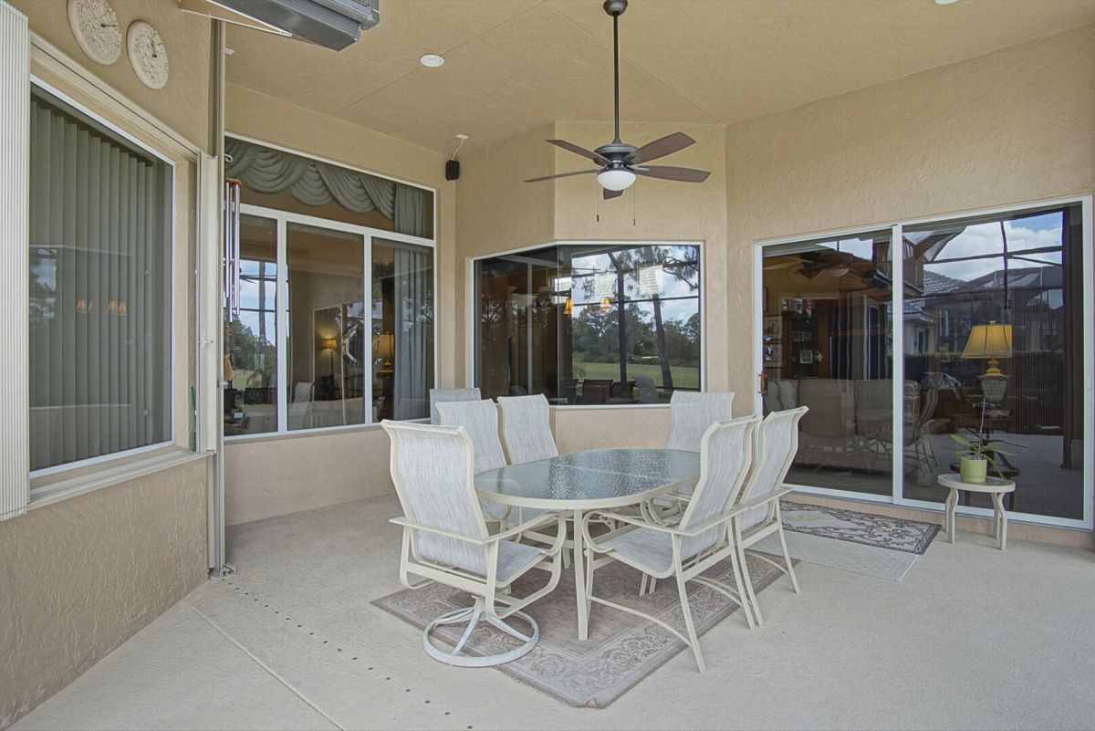 Beautiful and pristine golf course home offers a fabulous view of the 13th hole on the Rider course. The custom features inside and outside will not disappoint! Upon entry the double leaded glass doors and the 12 ft. ceilings with detailed crown molding creates elegance throughout. The home has 2 bedroom ensuites, total of 2.5 baths, an office, a formal living room, a large formal dining room and a great room. The kitchen has stainless appliances, a pantry, slide out shelves, granite countertops and a custom oak wall under the snackbar counter. 3 hurricane impact windows were installed in the kitchen in 2019 and the A/C system was installed in 2019.