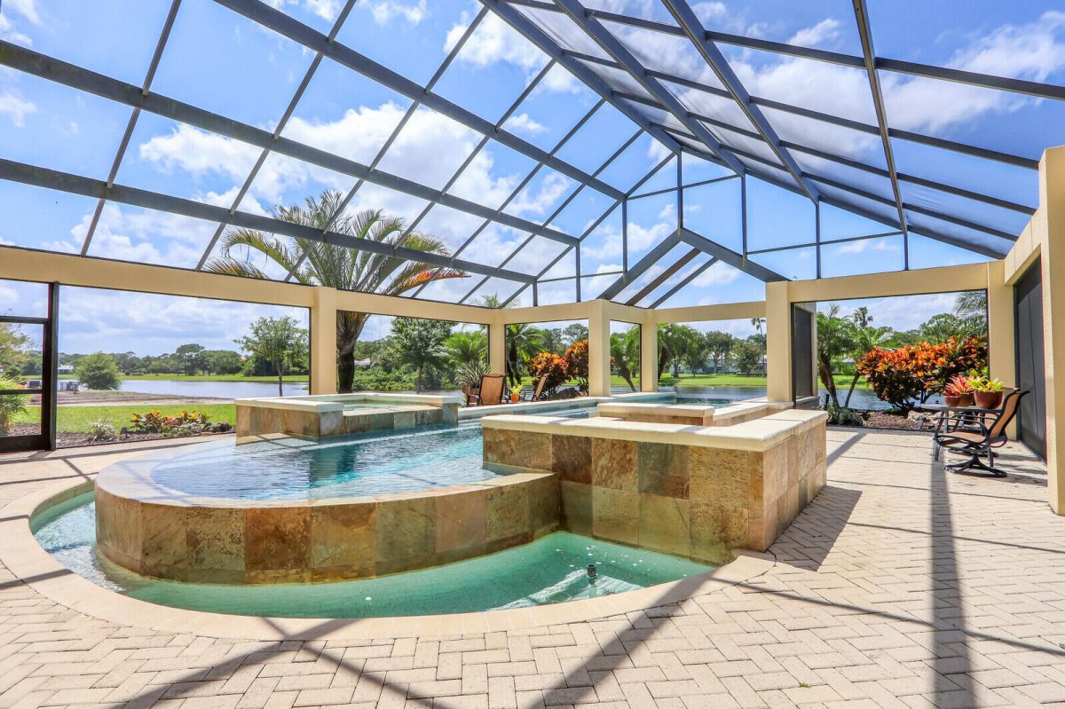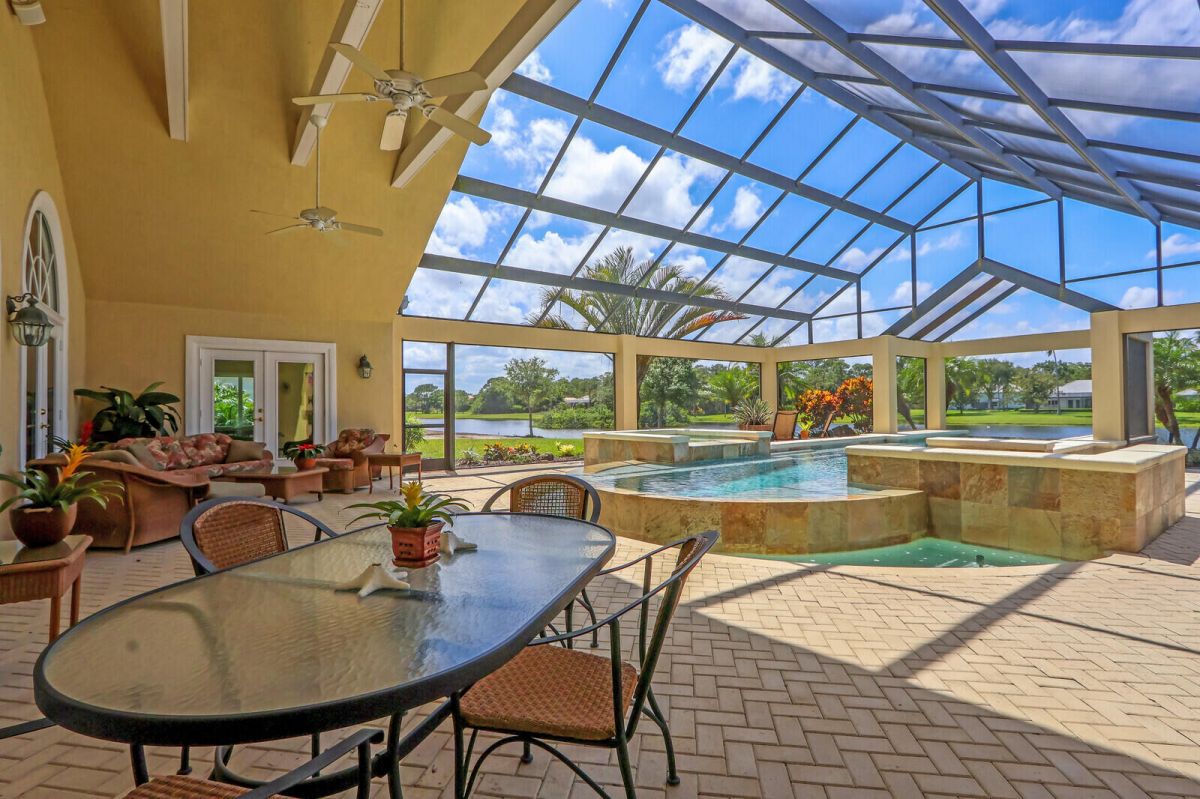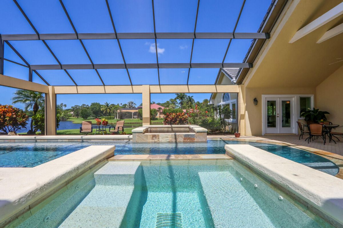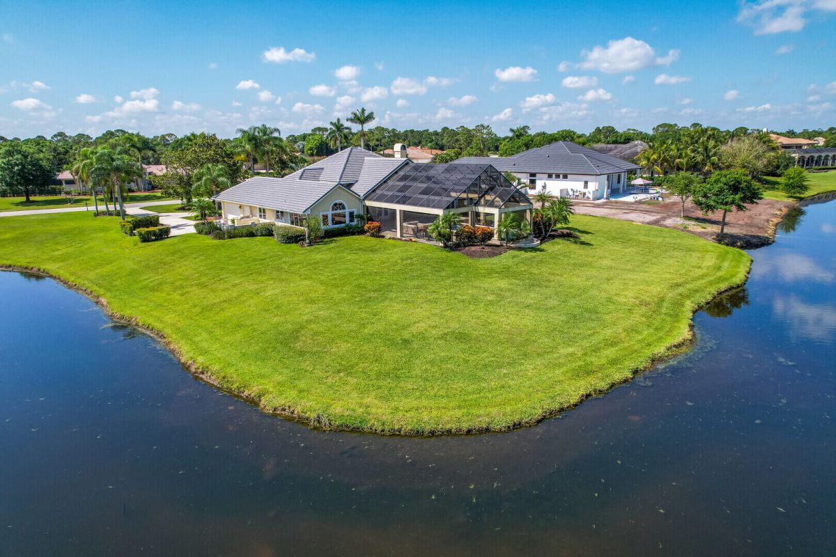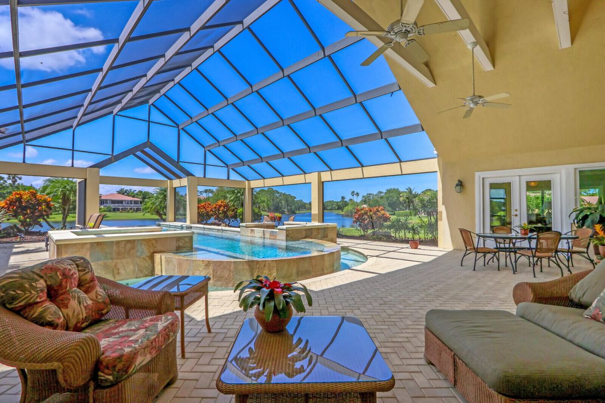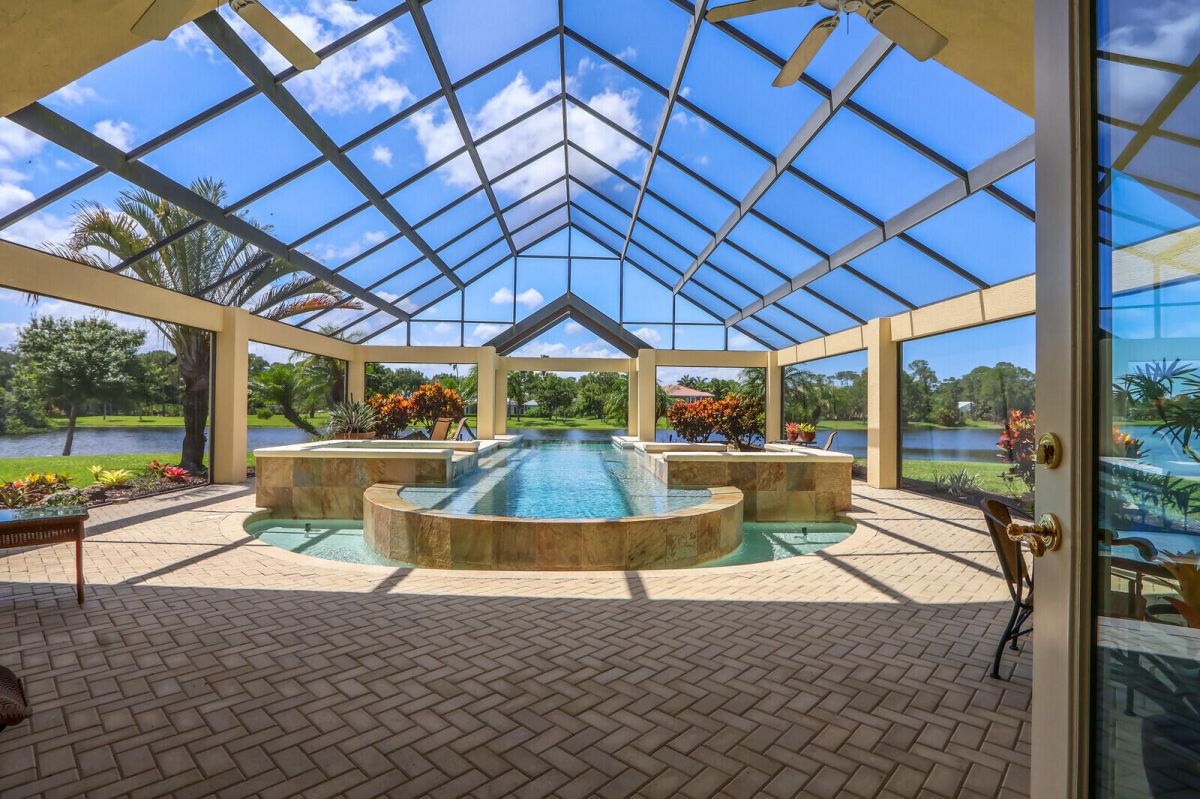 On one of the most stunning locations within the PGA Village sits this custom beauty. 2.35 acres of tranquility, with water on two sides. As you step through the front door your gaze is drawn to the amazing infinity edge pool. Three bedroom suites are within the 3652SF of living space, along with a large office/den space. Terra cotta tile throughout the main living areas as well as a fireplace in the living room. This unique home is a ''must see''.