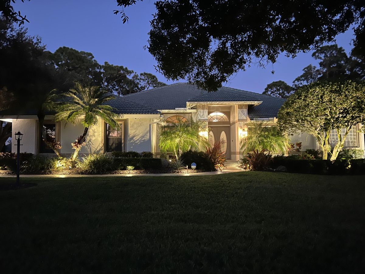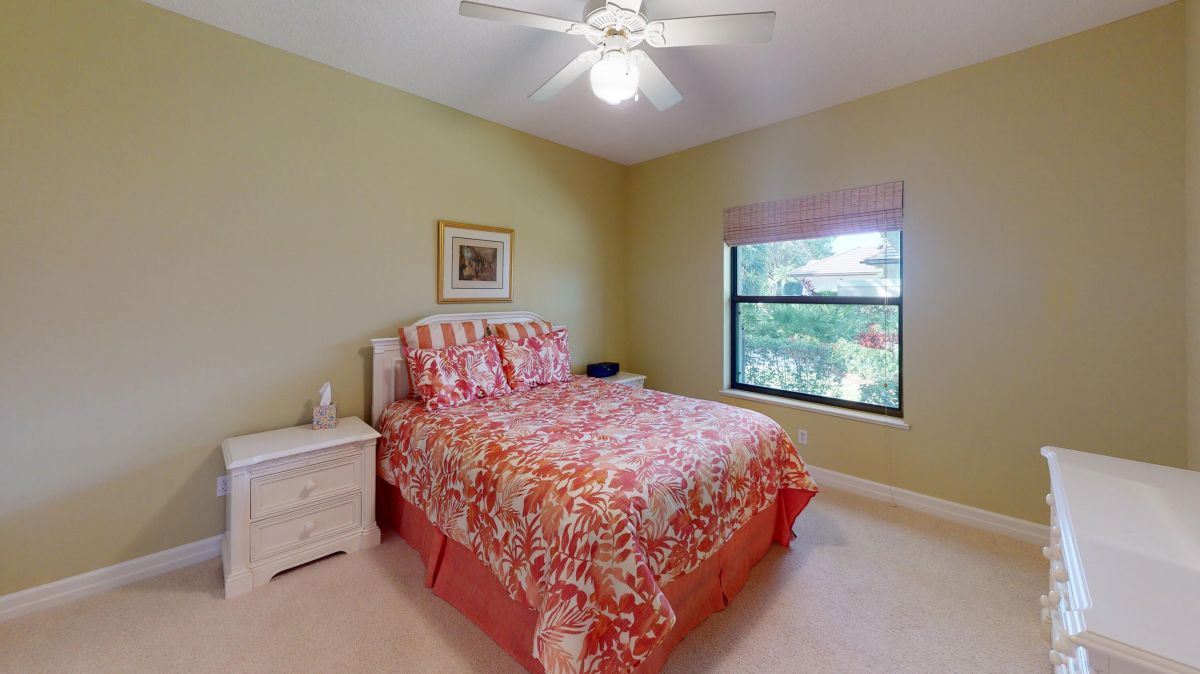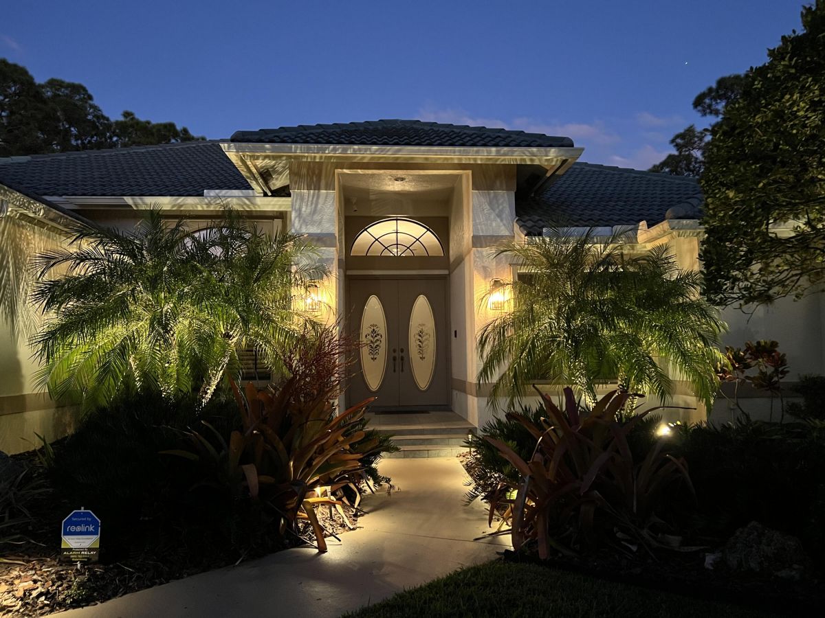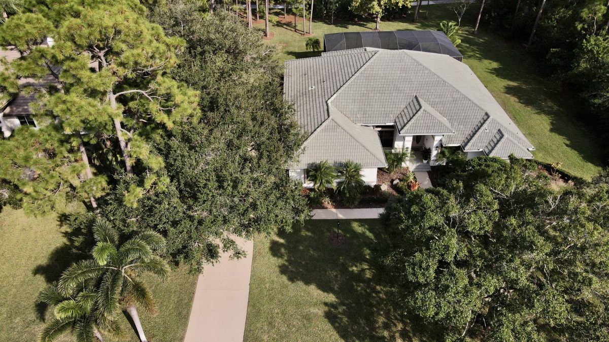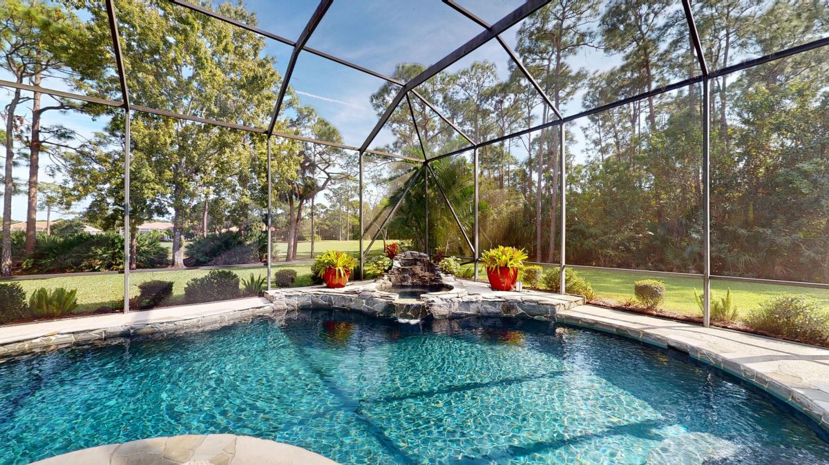 Custom built CBS, pool home set on a beautiful .63-acre lot, lushly landscaped with dramatic lighting and surrounded by majestic oaks. Large Lanai looks out to views of 6th Fairway of Fazio ''Ryder'' golf course in the highly desirable PGA Village community. This move-in ready home boasts 3 bedrooms, 21/2 baths and den or 4th bedroom, 3-car garage with shelved air-conditioned storage room, large, covered patio, pool and spa with a stunning rock waterfall. Spacious open floor plan, high volume ceilings, large kitchen with high-end stainless Kitchenaid appliances, wood cabinets, granite countertops, large island and pantry. Accordion storm shutters throughout, front door storm panels, Safety/Tinted Window Film, Hi-Res security camera system, Pool/Spa resurfaced (2020), New Pool Heater 2022