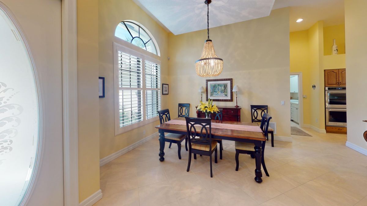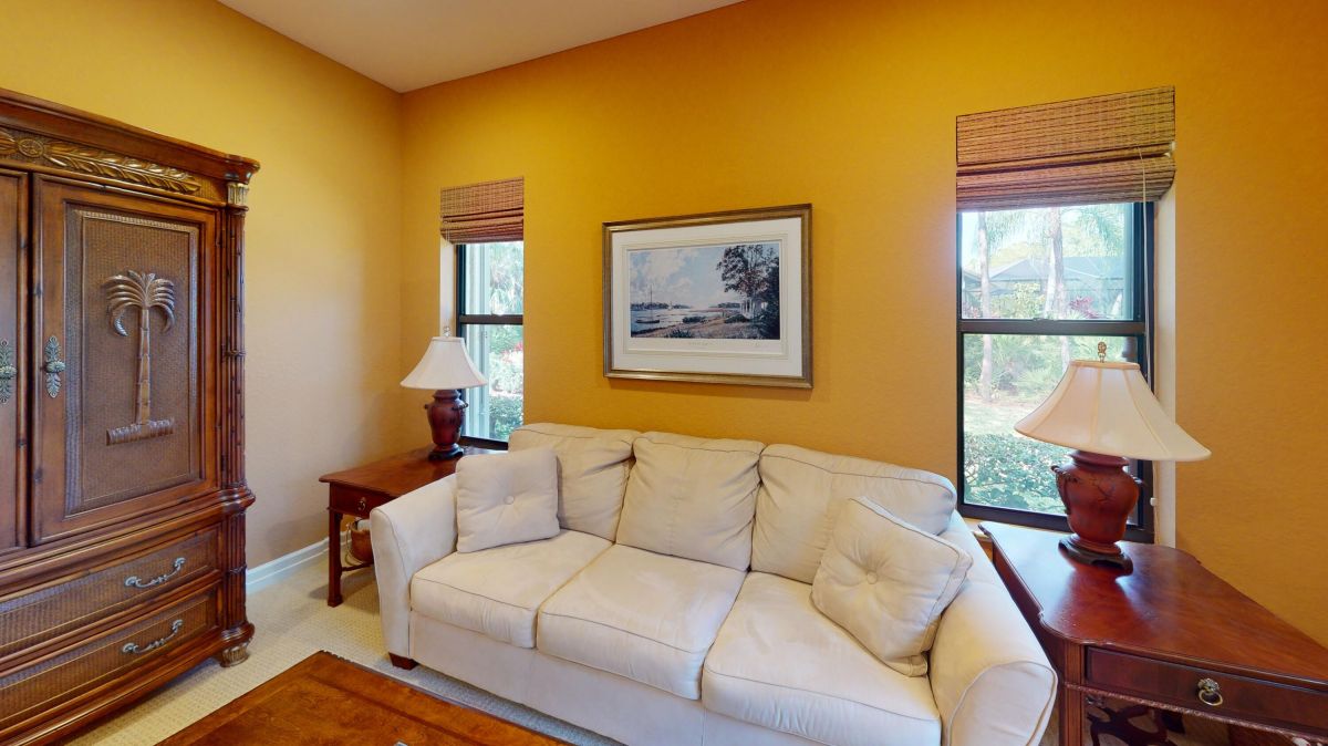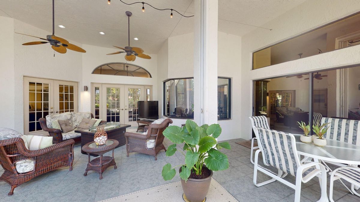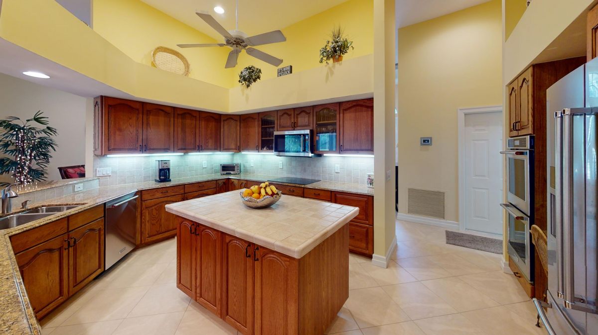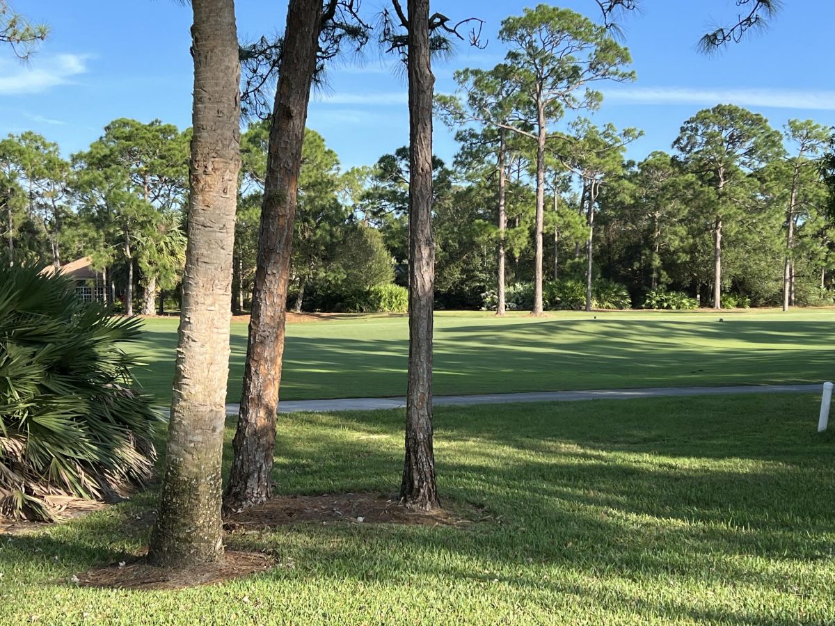 Custom built CBS, pool home set on a beautiful .63-acre lot, lushly landscaped with dramatic lighting and surrounded by majestic oaks. Large Lanai looks out to views of 6th Fairway of Fazio ''Ryder'' golf course in the highly desirable PGA Village community. This move-in ready home boasts 3 bedrooms, 21/2 baths and den or 4th bedroom, 3-car garage with shelved air-conditioned storage room, large, covered patio, pool and spa with a stunning rock waterfall. Spacious open floor plan, high volume ceilings, large kitchen with high-end stainless Kitchenaid appliances, wood cabinets, granite countertops, large island and pantry. Accordion storm shutters throughout, front door storm panels, Safety/Tinted Window Film, Hi-Res security camera system, Pool/Spa resurfaced (2020), New Pool Heater 2022