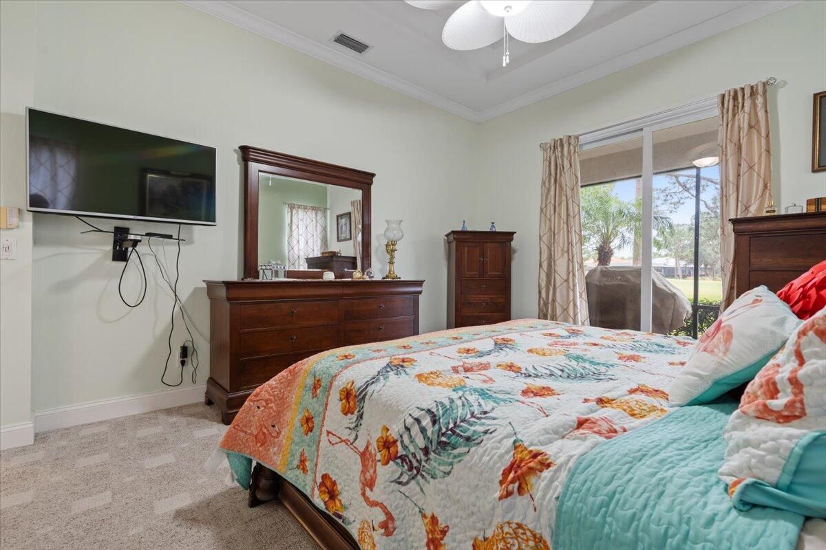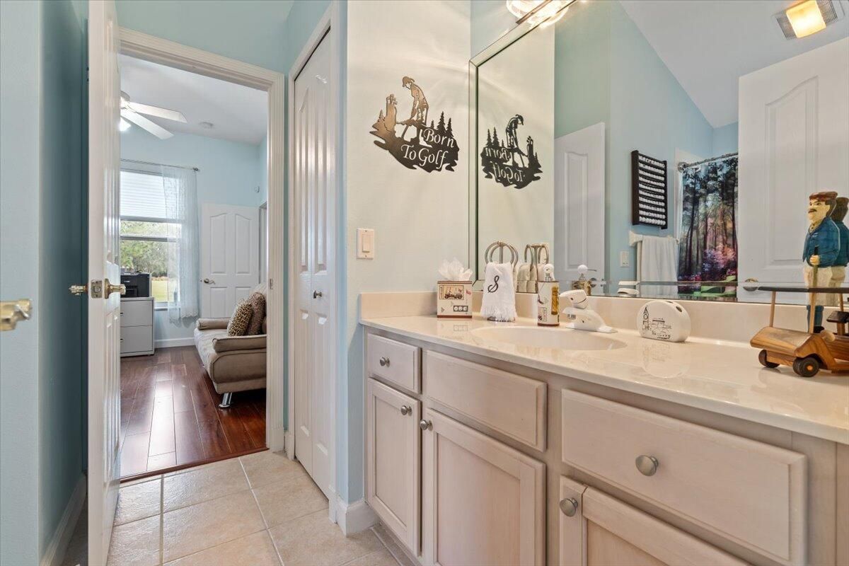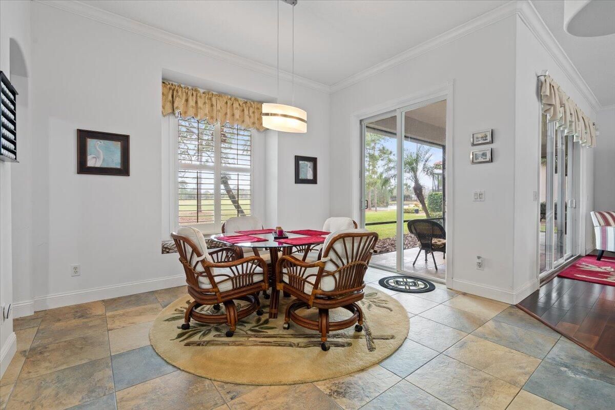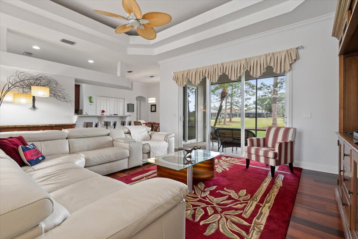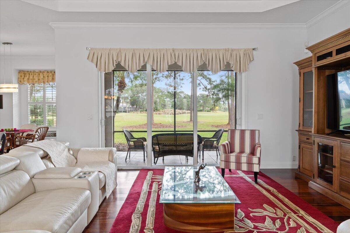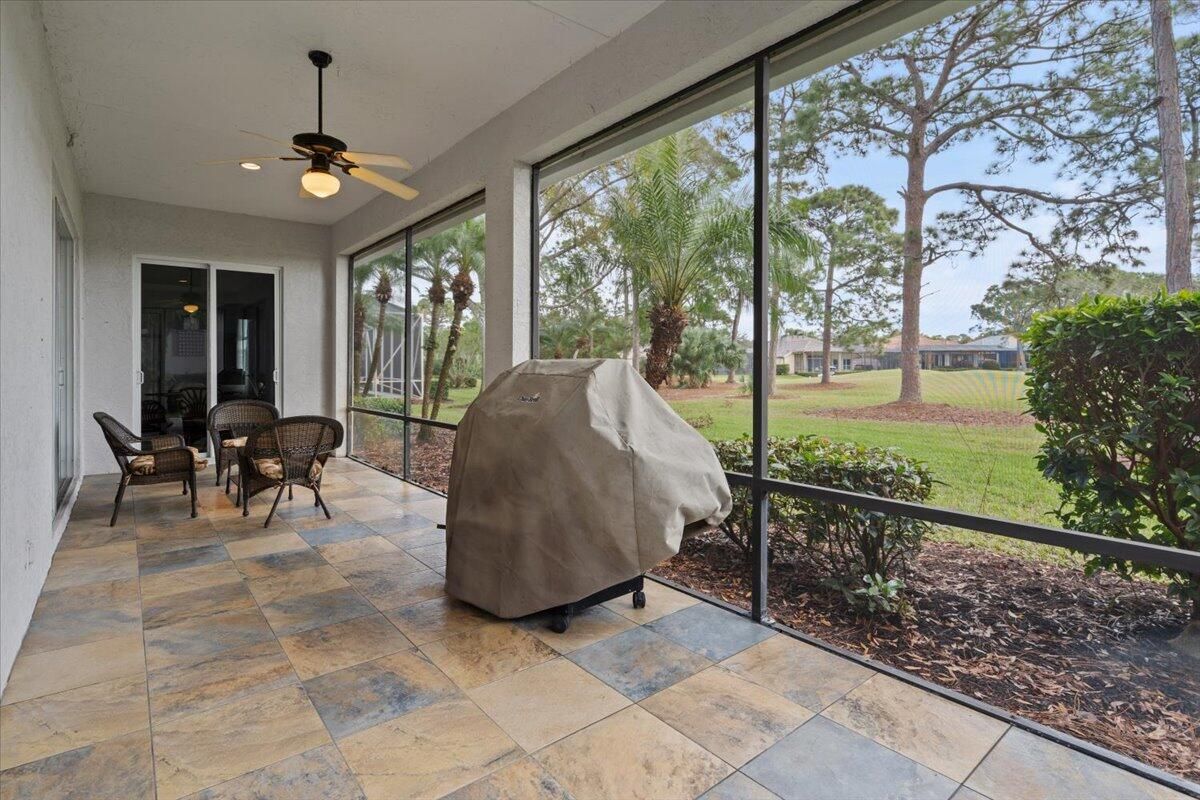 Awesome views of the 11th hole of the PGA Ryder course. This three bedroom two bath home features a brand NEW roof, impact glass windows, and doors, and a NEW garage door. The kitchen features granite counters and cherry cabinetry. Tile in the kitchen and baths and wood in the great room. **The exterior is scheduled to be painted within the next week. HOA Fees include access to the beautiful Island Club offering tennis, pickleball, basketball,fitness center, play area, grand ballroom, library, billiards room, card & craft rooms, resort style pool & many different clubs & activities. PGA Village boast 3 famous golf courses and the private Legacy golf and tennis club.PGA Village living includes majestic preserve settings where taking a walk or riding your bike