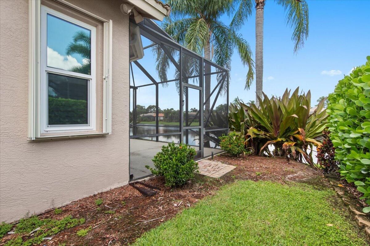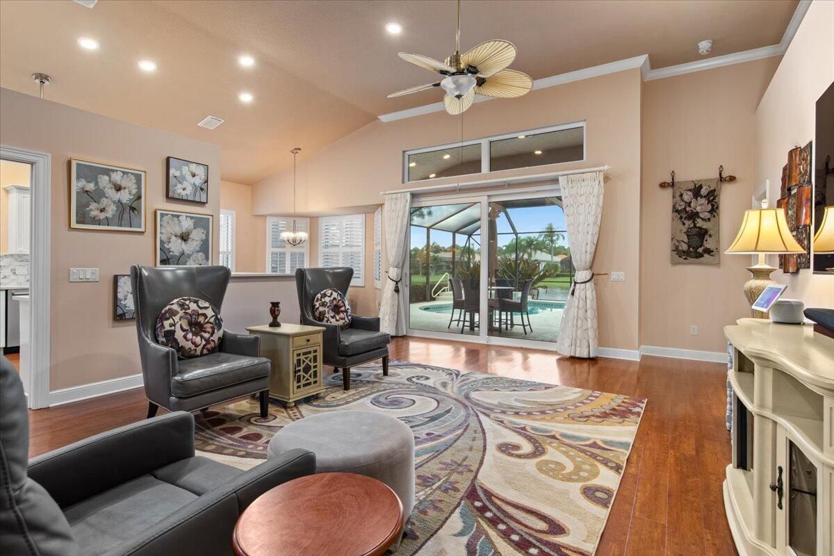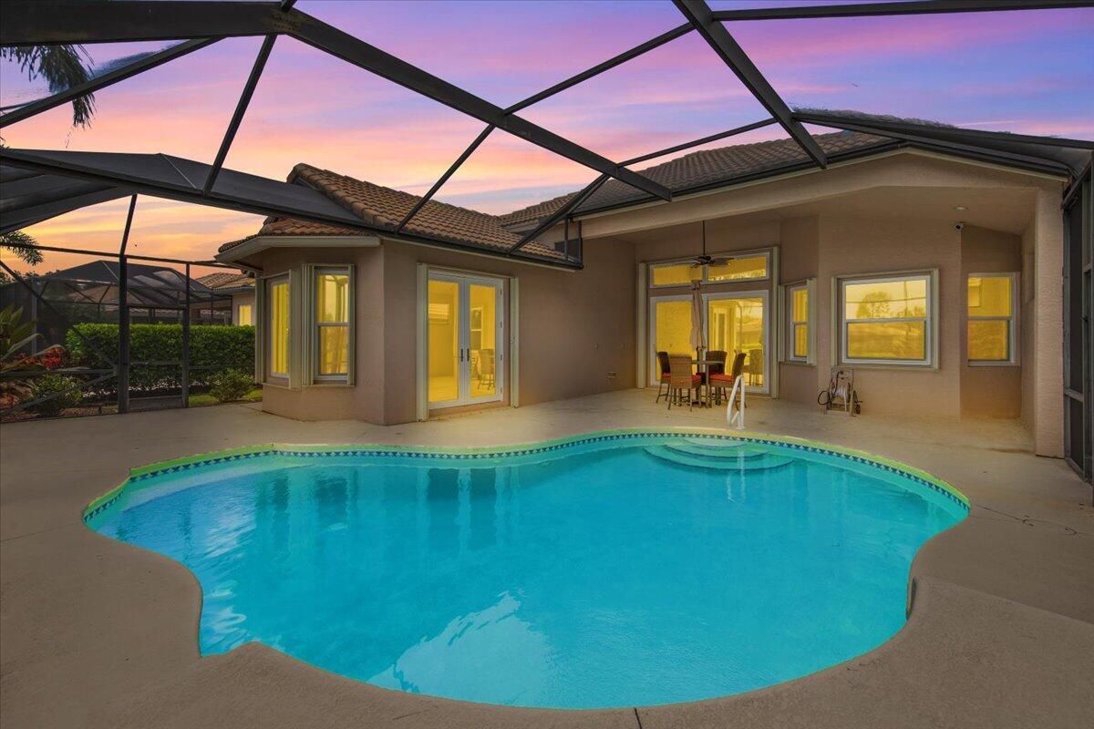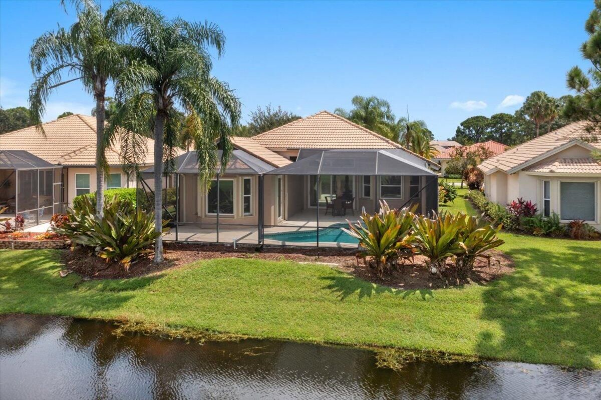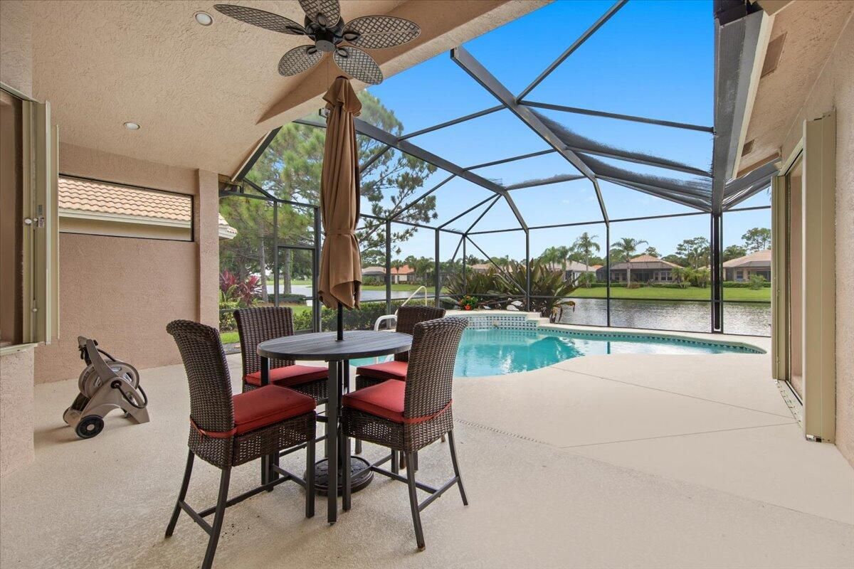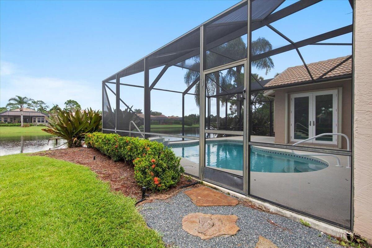 Beautiful Lakefront Home with Stunning Sunset ViewsThis spacious 3-bedroom+ Bonus Room, 2-bathroom home in the desirable Oak Hill area of PGA Village offers breathtaking lakefront sunsets from a large screened lanai, complete with a private heated pool. Enjoy peace of mind with all IMPACT GLASS, a newer A/C system and hot water tank, and an electrical generator hookup. The bright, white kitchen features quartz countertops, a decorative backsplash, and newer upgraded stainless steel appliances, including an induction cooktop--perfect for the happy chef. Crown molding, plantation shutters, and custom-designed closets and pantries add elegance and functionality throughout the home. Enjoy the convenience of a 2.5-CAR GARAGE with storage and parking space. Come take a look!