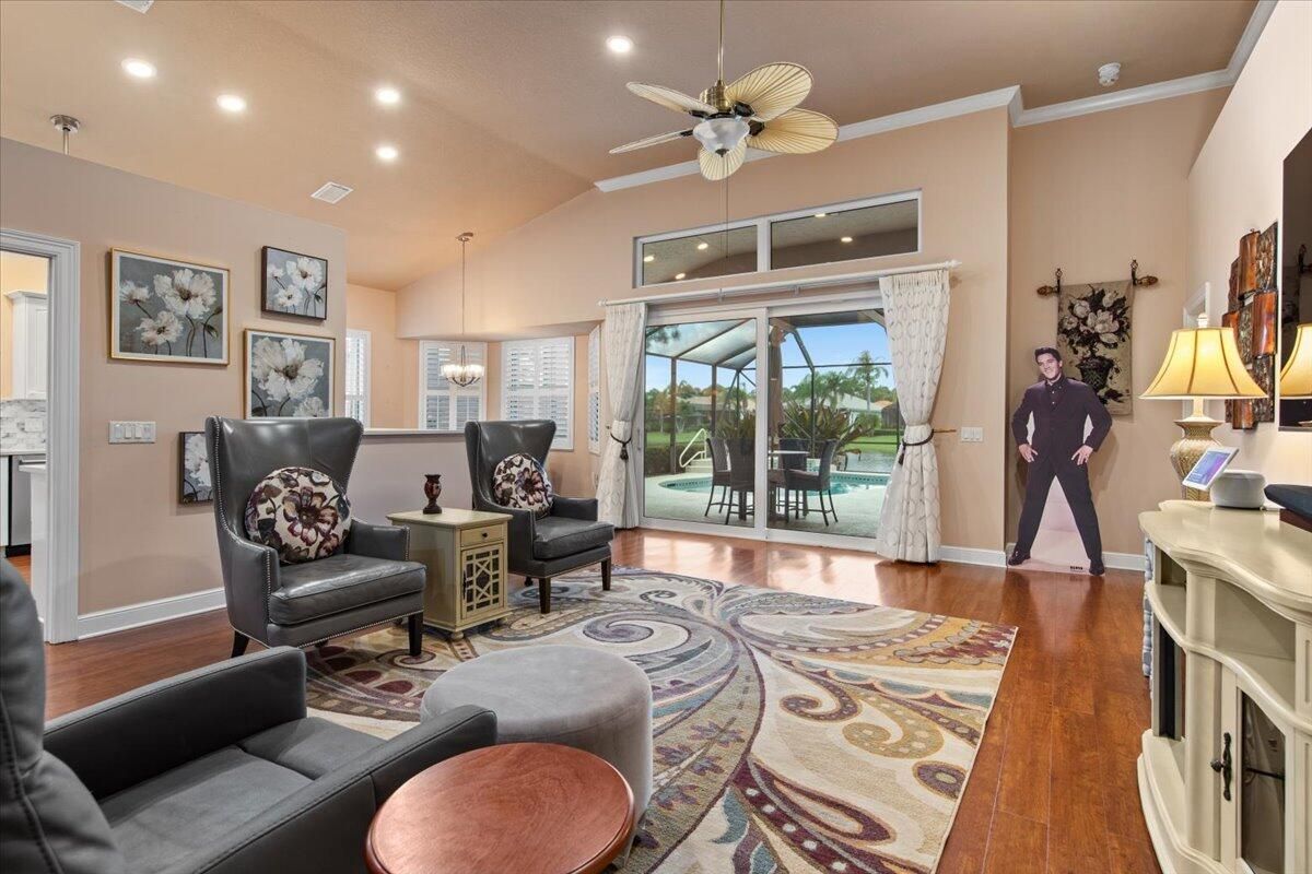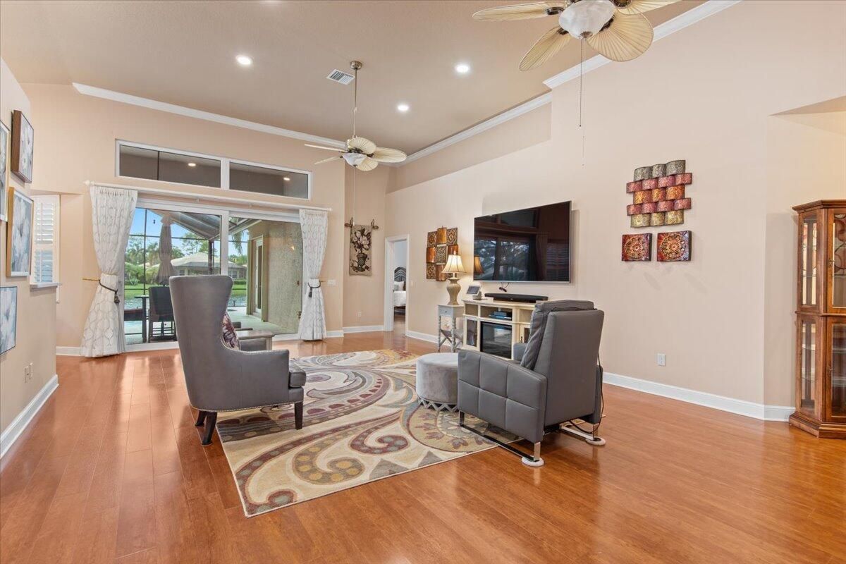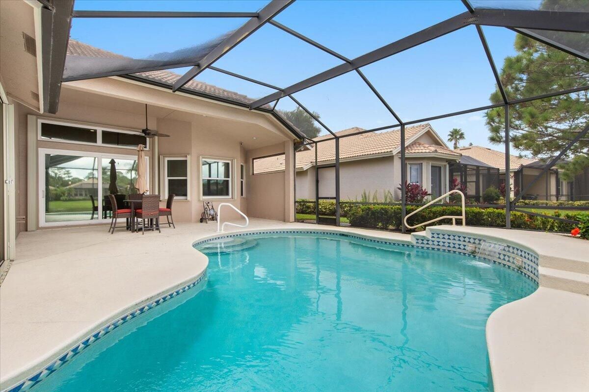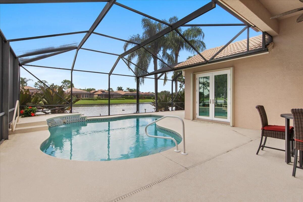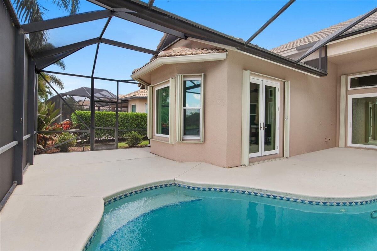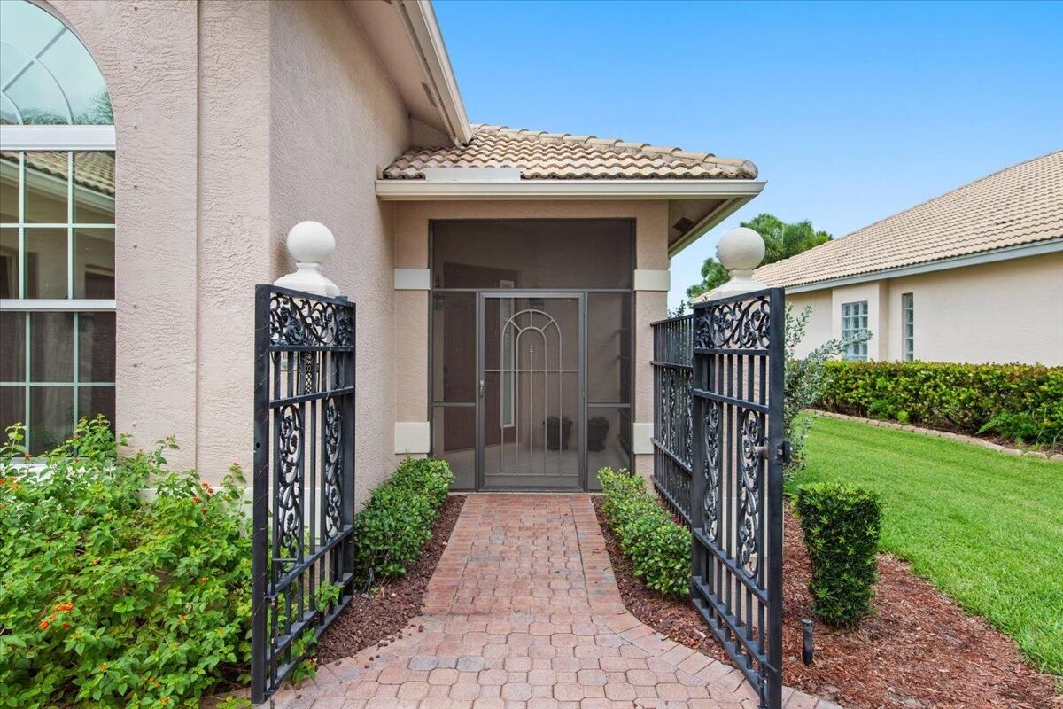 Beautiful Lakefront Home with Stunning Sunset ViewsThis spacious 3-bedroom+ Bonus Room, 2-bathroom home in the desirable Oak Hill area of PGA Village offers breathtaking lakefront sunsets from a large screened lanai, complete with a private heated pool. Enjoy peace of mind with all IMPACT GLASS, a newer A/C system and hot water tank, and an electrical generator hookup. The bright, white kitchen features quartz countertops, a decorative backsplash, and newer upgraded stainless steel appliances, including an induction cooktop--perfect for the happy chef. Crown molding, plantation shutters, and custom-designed closets and pantries add elegance and functionality throughout the home. Enjoy the convenience of a 2.5-CAR GARAGE with storage and parking space. Come take a look!