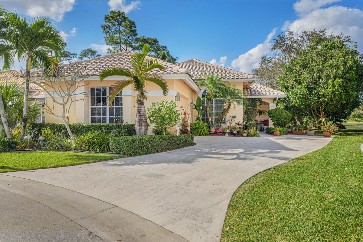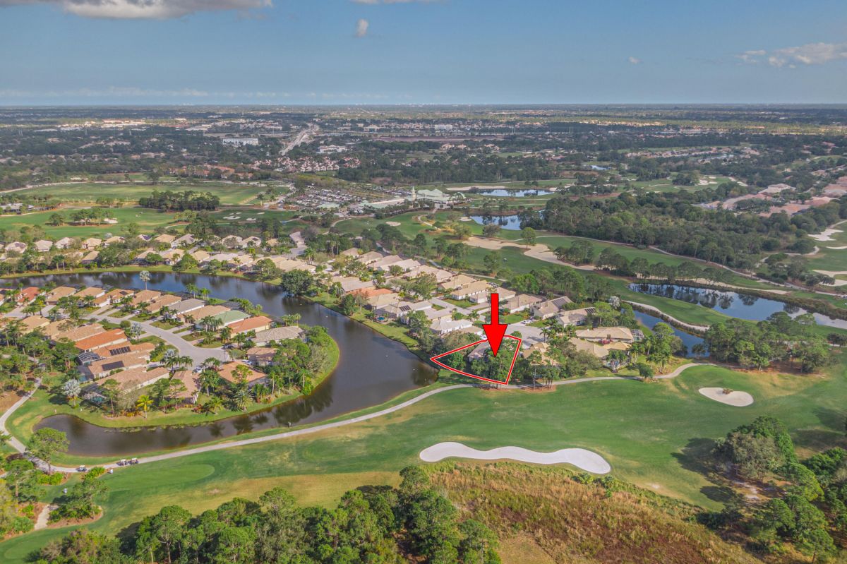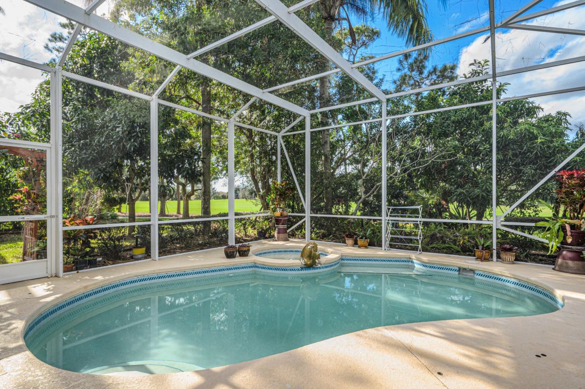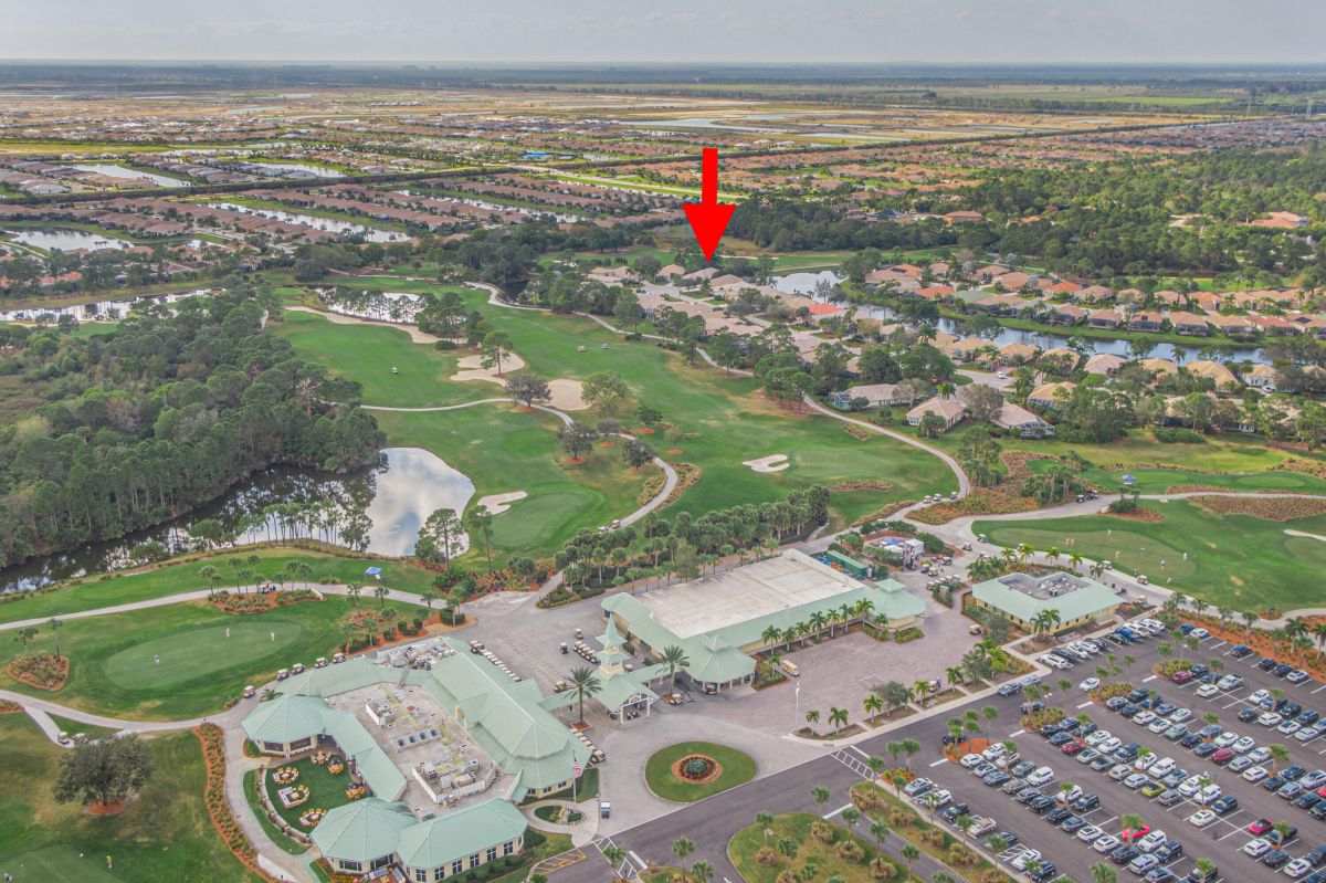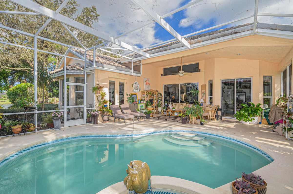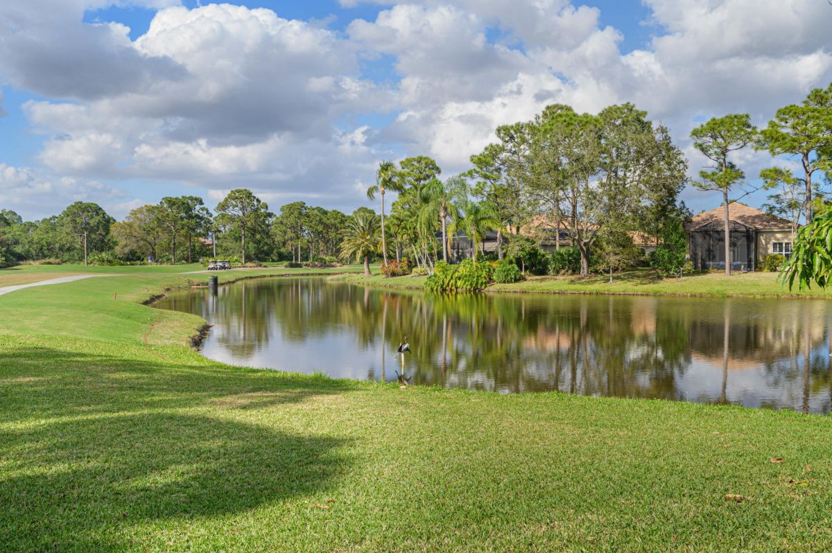 Inviting pool home at the end of a cul-de-sac with 8th fairway (Ryder course) golf and water views is one of the prime homesites in PGA Village's Oak Hill. Rooms are generously sized -- the master is huge -- and the floor plan is open. Sellers use one bedroom as a den/office. A covered lanai opens to a large screened pool and spa area. Oversize side entry garage, separate laundry room, extra storage in the garage -- this home awaits your personal touches. PGA Village has a manned gate, and HOA membership includes access to the Island Club with a community pool and fitness center, as well as many more PGA Village amenities.