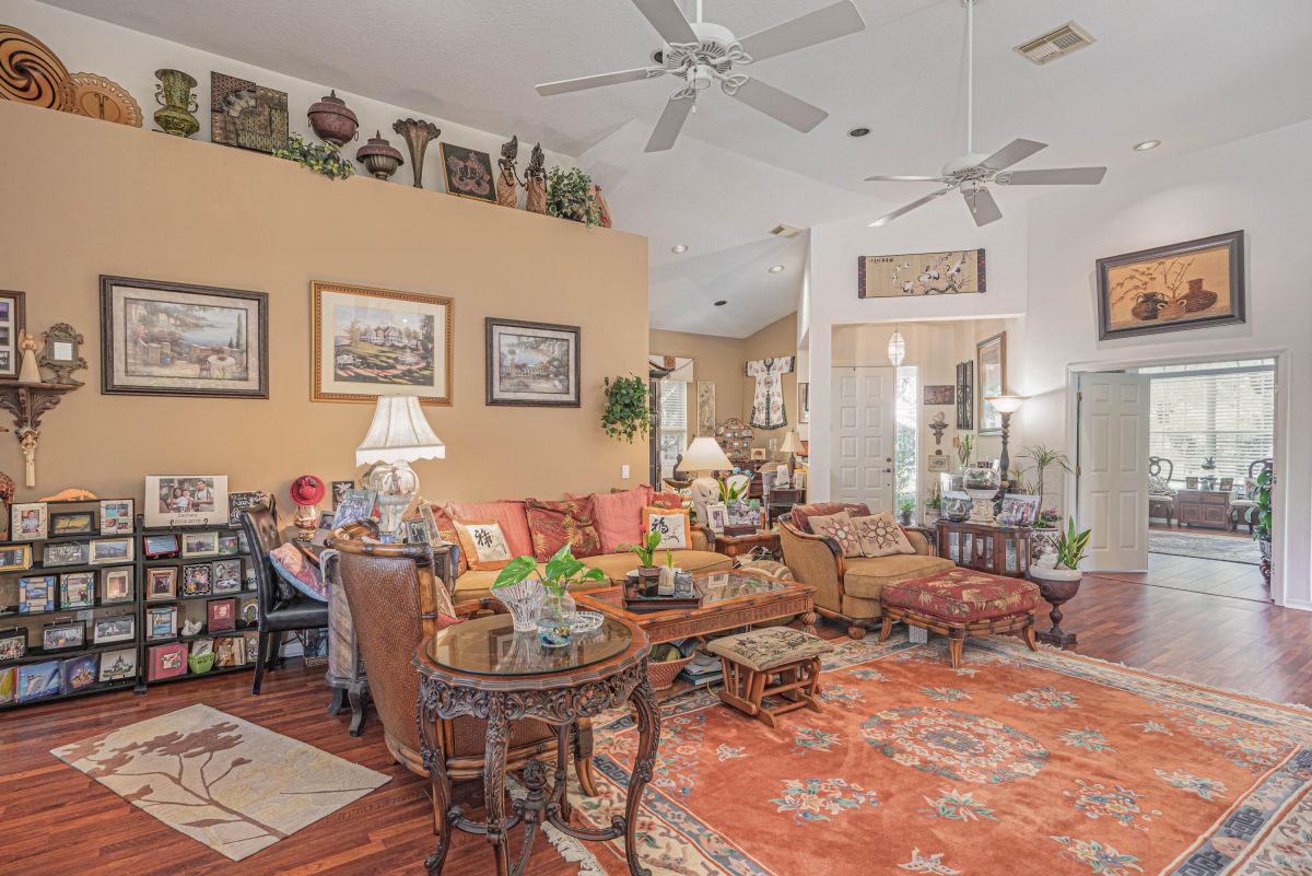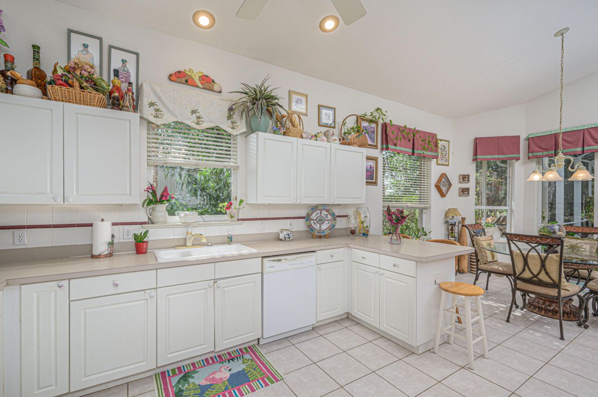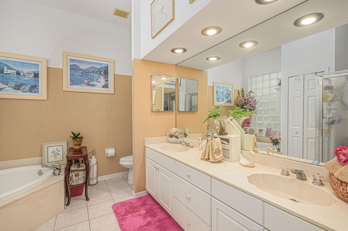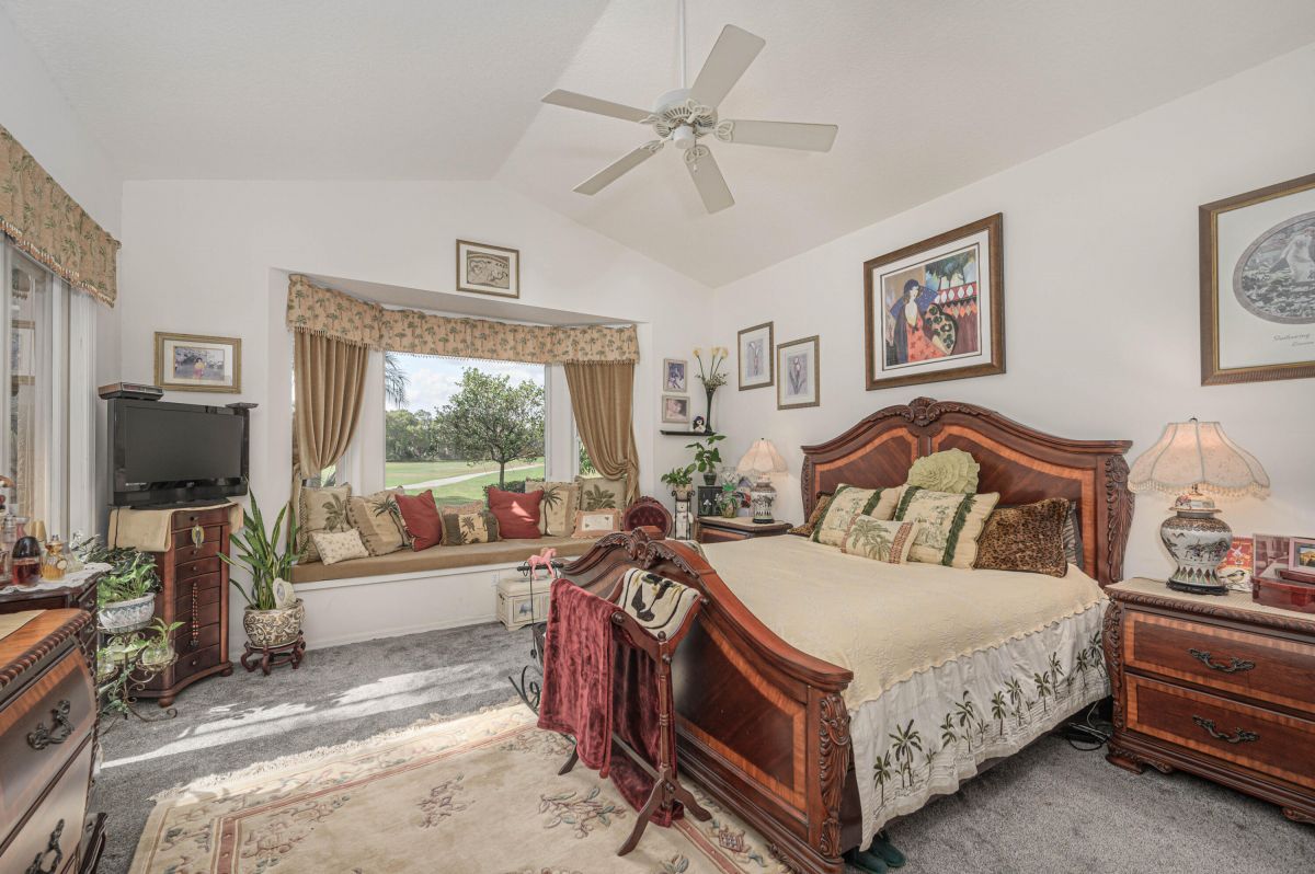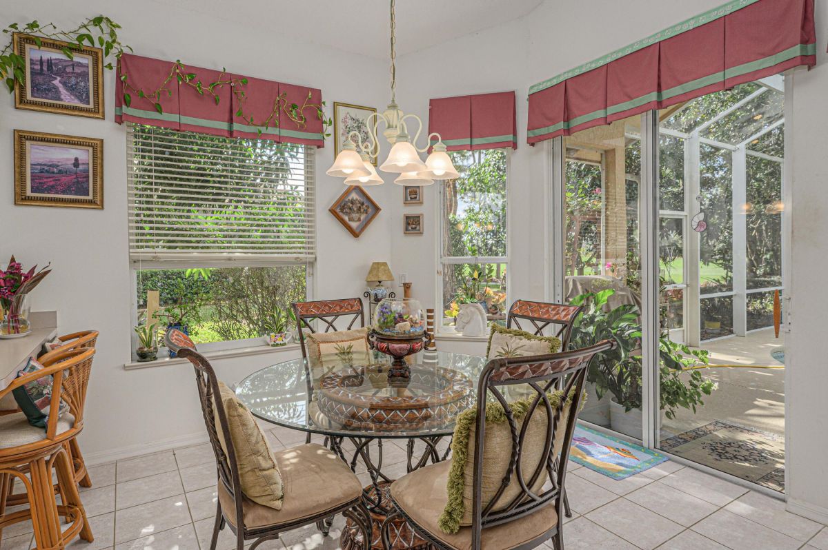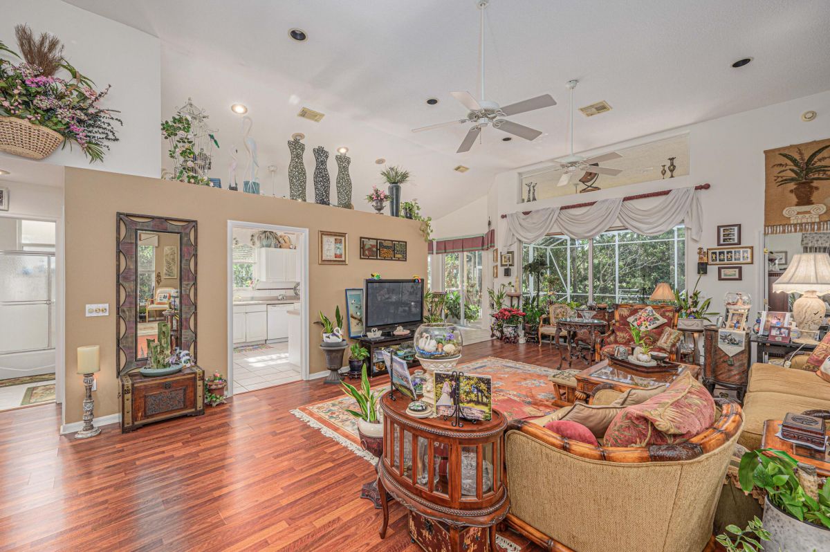 Inviting pool home at the end of a cul-de-sac with 8th fairway (Ryder course) golf and water views is one of the prime homesites in PGA Village's Oak Hill. Rooms are generously sized -- the master is huge -- and the floor plan is open. Sellers use one bedroom as a den/office. A covered lanai opens to a large screened pool and spa area. Oversize side entry garage, separate laundry room, extra storage in the garage -- this home awaits your personal touches. PGA Village has a manned gate, and HOA membership includes access to the Island Club with a community pool and fitness center, as well as many more PGA Village amenities.