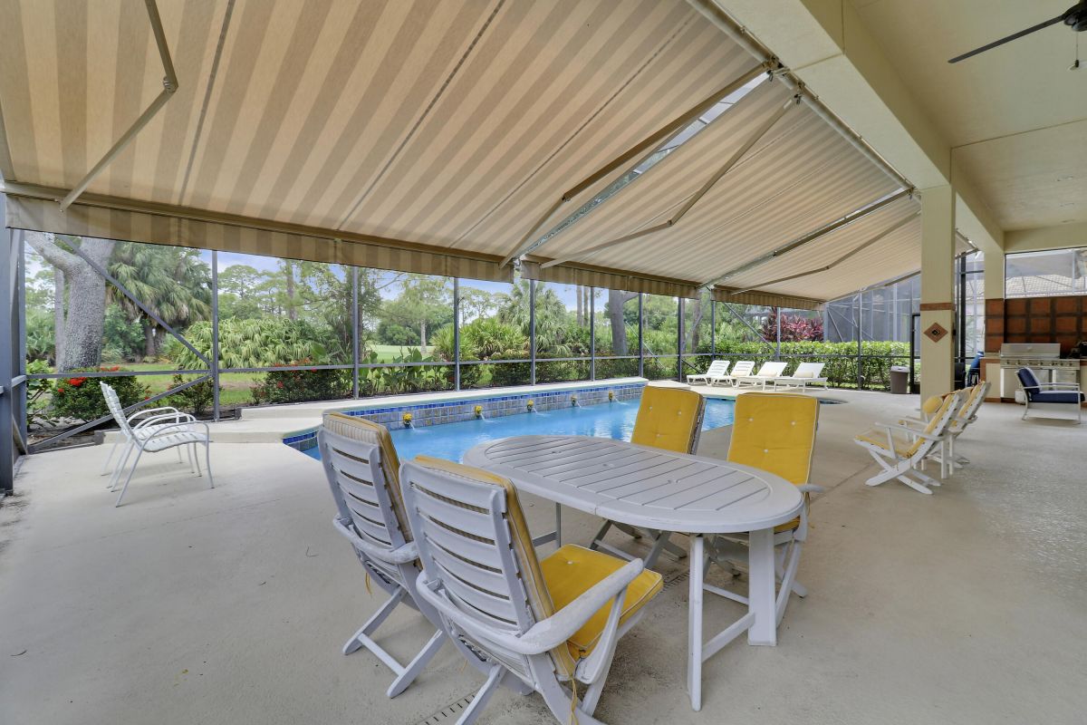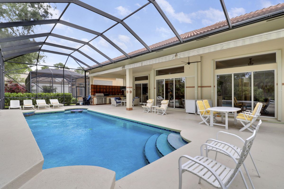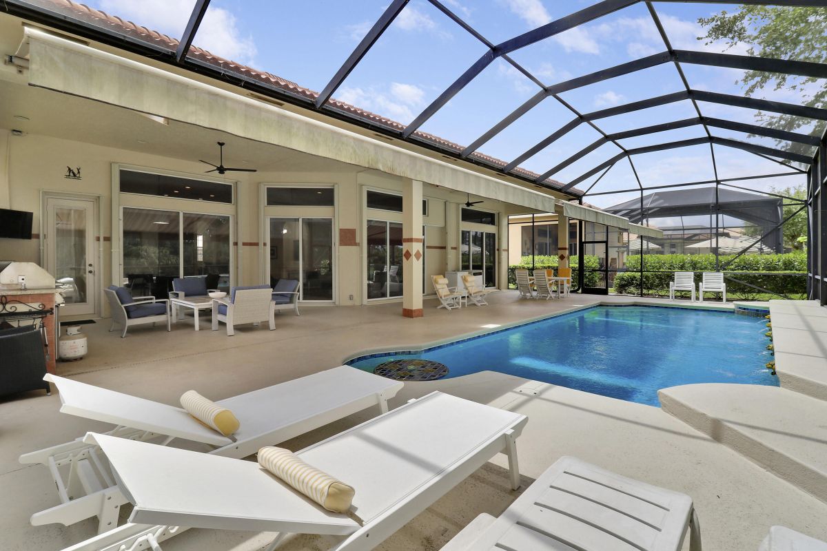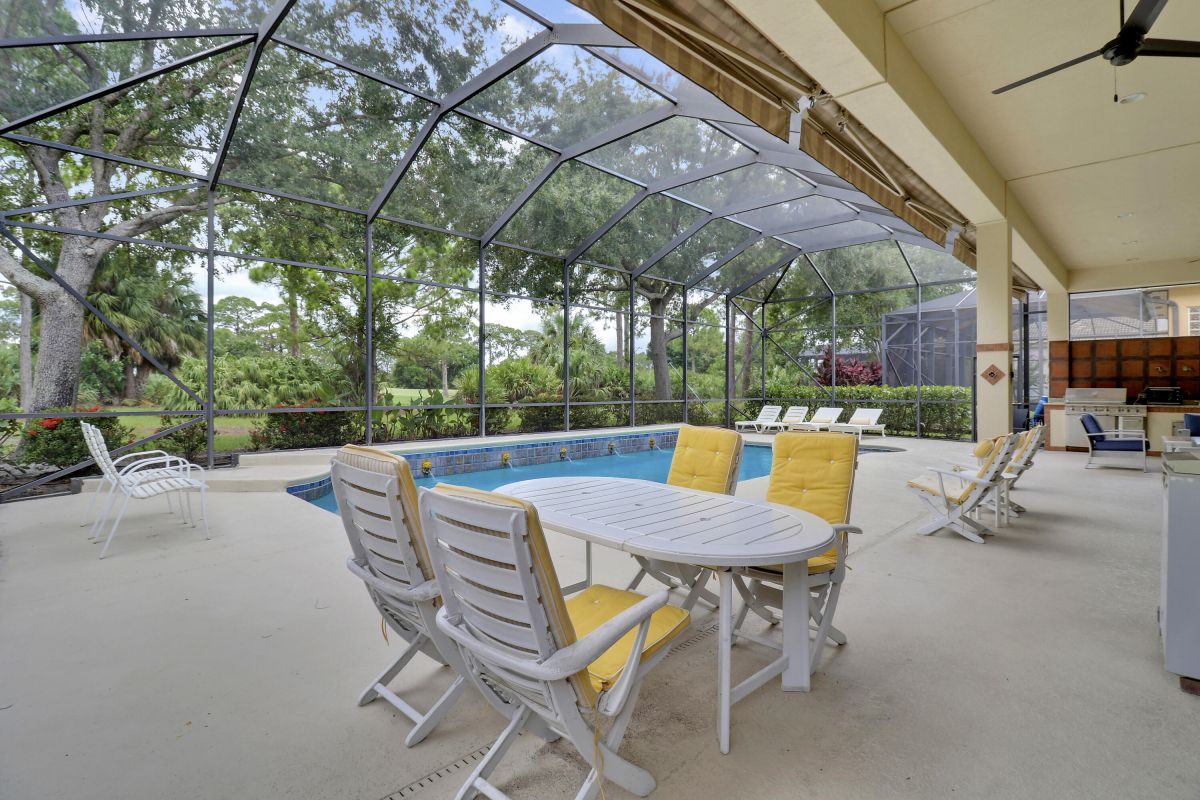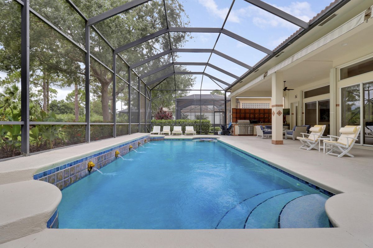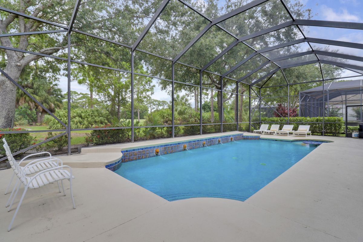 ELEGANT 3BR+DEN/3.5BA/2CG POOL HOME w/ golf course views and within close proximity to the PGA Golf Club makes this an EXCEPTIONAL PROPERTY! Located through the south gate of PGA Village, this Tompson Point beauty offers peaceful, quiet living complete with an expansive screened patio and large pool.The pool with water features and swim up table is just steps away from the built-in summer kitchen! As soon as you pull onto the circular paver driveway, you'll realize this is the one you've been looking for! Lush landscaping and double glass front entry doors lead you inside the foyer of this special property brimming with sophisticated style! Some of the many features include NEW ROOF 2021, hard surface flooring t/o, neutral interior paint, tray ceilings, decorative trim & crown molding.