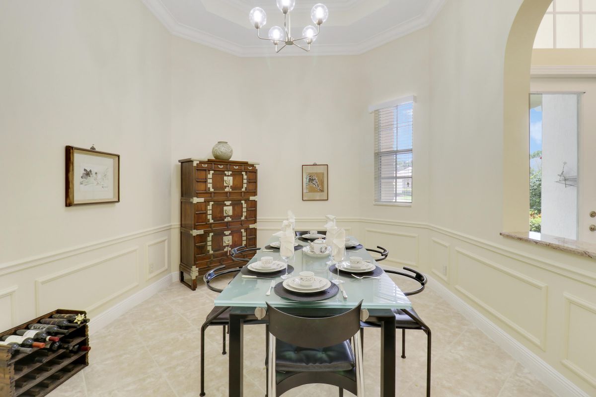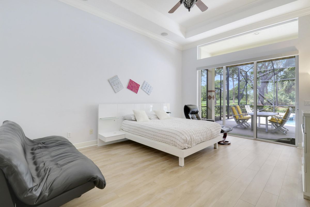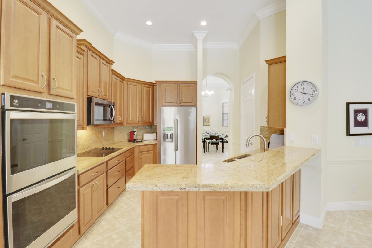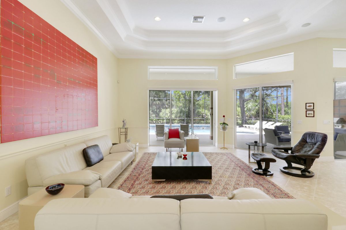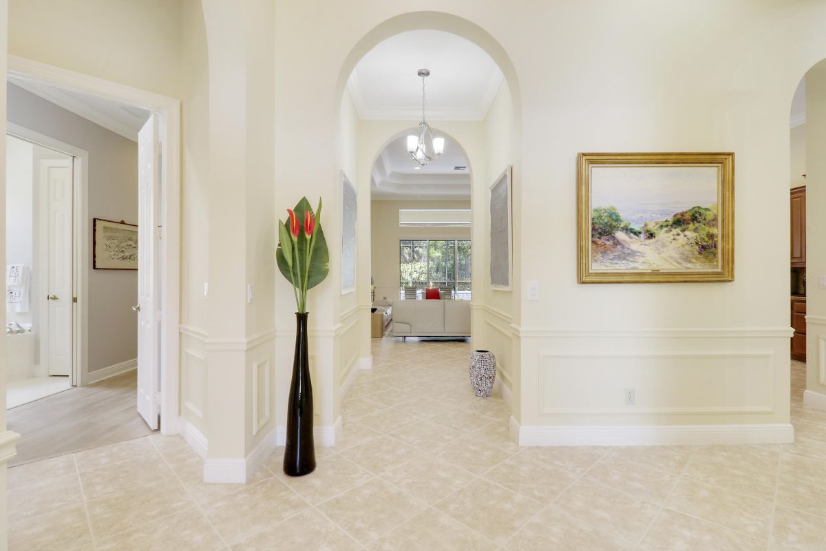 ELEGANT 3BR+DEN/3.5BA/2CG POOL HOME w/ golf course views and within close proximity to the PGA Golf Club makes this an EXCEPTIONAL PROPERTY! Located through the south gate of PGA Village, this Tompson Point beauty offers peaceful, quiet living complete with an expansive screened patio and large pool.The pool with water features and swim up table is just steps away from the built-in summer kitchen! As soon as you pull onto the circular paver driveway, you'll realize this is the one you've been looking for! Lush landscaping and double glass front entry doors lead you inside the foyer of this special property brimming with sophisticated style! Some of the many features include NEW ROOF 2021, hard surface flooring t/o, neutral interior paint, tray ceilings, decorative trim & crown molding.