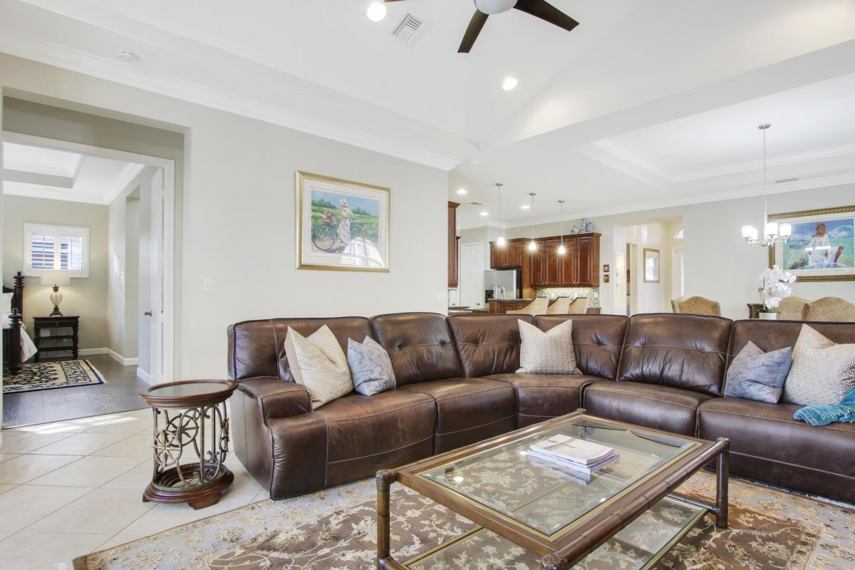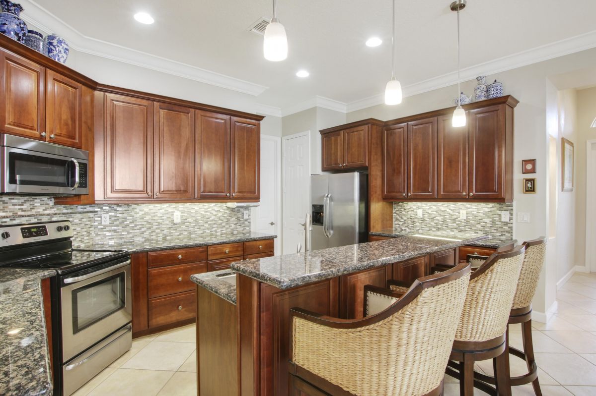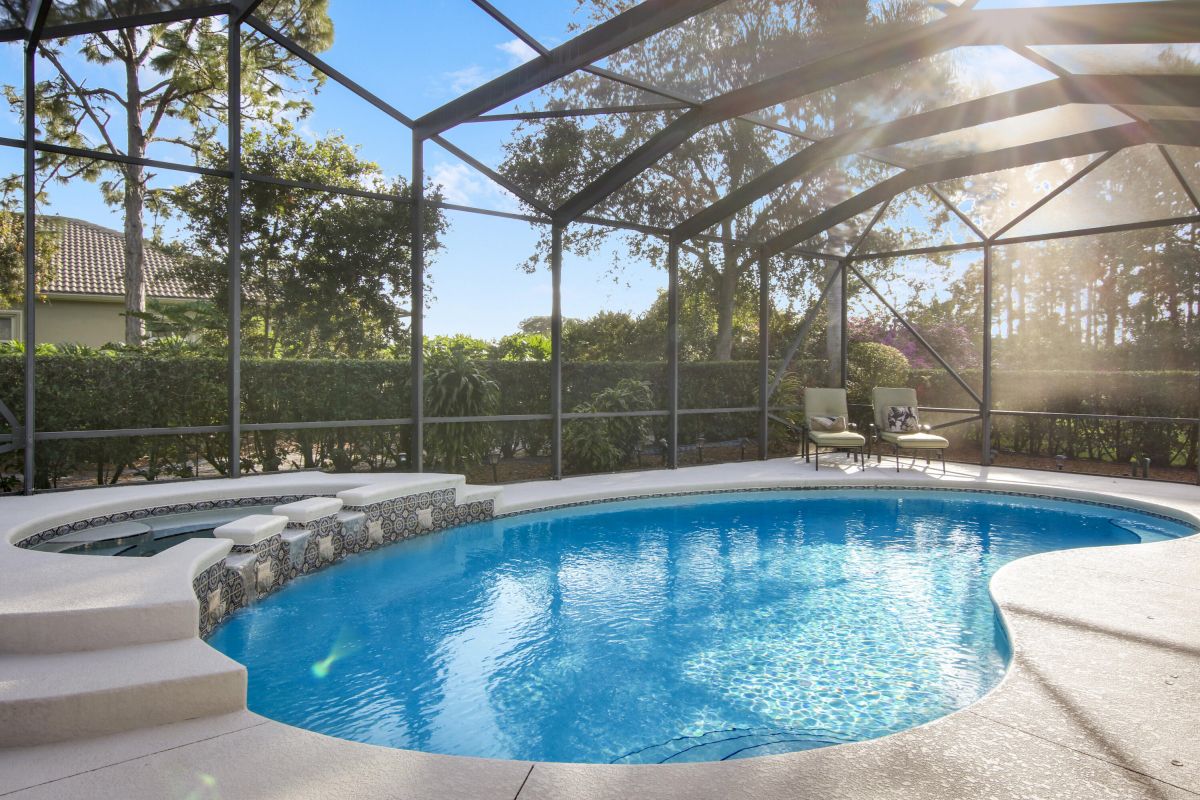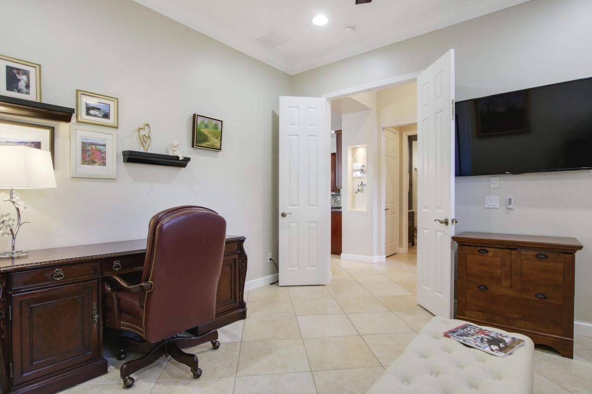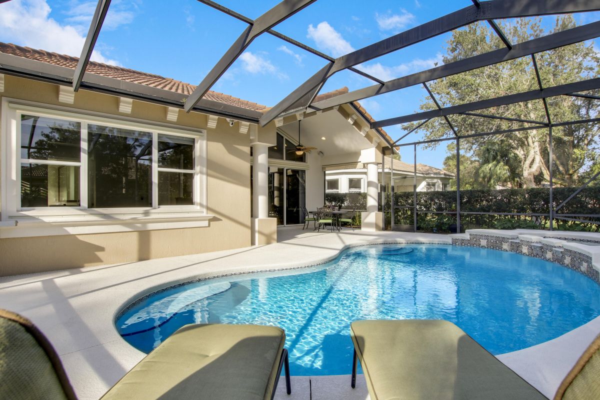 Look no further! Popular Fairview plan in PGA Village w/ heated pool & spa! This 2BR+Den/2BA/2CG home has space in all the right places! Special features include fresh interior paint t/o, vaulted ceiling, transom windows, spacious kitchen, hard surface flooring t/o, oversized master suite, plantation shutters, large laundry room and crown molding. PROPERTY TAX SAVINGS w/ county only taxes.Open floor plan ideal for entertaining & modern living. Kitchen w/ 42'' wood cabinetry, granite counters, tile backsplash, SS appliances, under cabinet lighting, pantry closet, breakfast bar and pendant lights. Master suite is the perfect spot to wind down w/ dual walk-in closets w/ custom shelving as well as spa-like ensuite w/ linen closet, soaking tub, walk in shower and large vanity w/ dual si