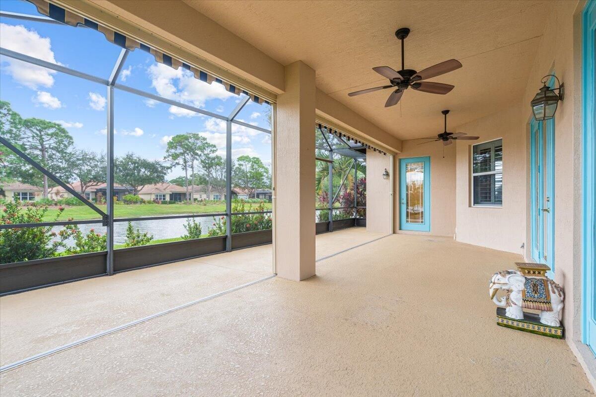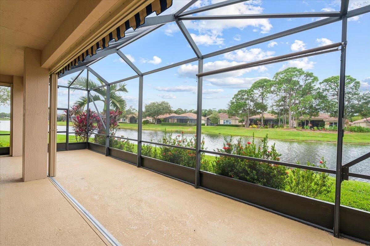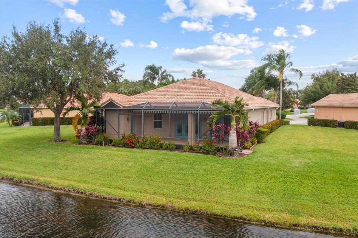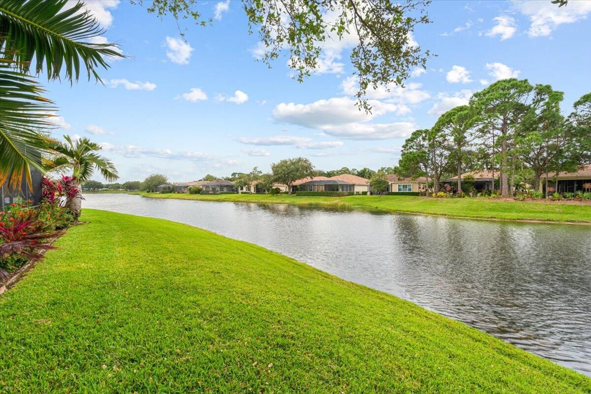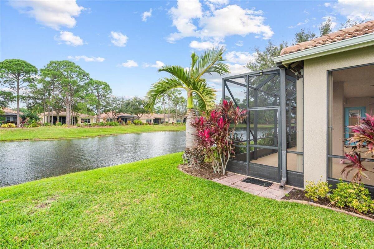 PGA VILLAGE, NESTLED ON A LARGE CUL-DE-SAC LOT offering Pirvacy & BEAUTIFUL WATER VIEWS! This well-maintained home features a spacious, open floor plan with 2 BRS + a generous den, complete with pocket dble French doors. The home boasts 3 full baths, including a cabana bath off the primary suite. The heart of the home is the kitchen, featuring granite, ample cabinetry & counter space, & a propane range, perfect for cooking & entertaining. Elegant wood moldings add charm throughout, while French doors line the back, opening up to an extended, covered & screened lanai overlooking the serene water view. The oversized garage provides plenty of space for storage & vehicles. Great golf available & access to a Clubhouse with pool, fitness, tennis, pickleball & a full calendar of activities.
