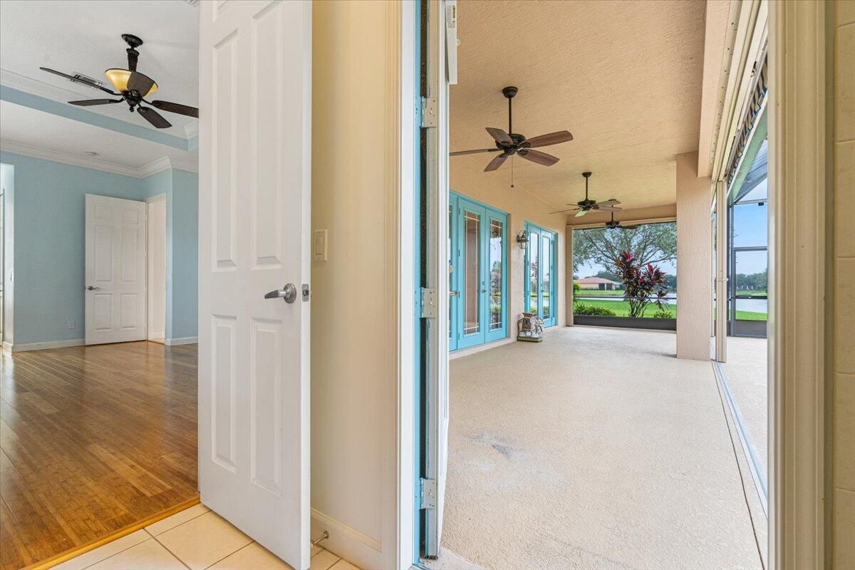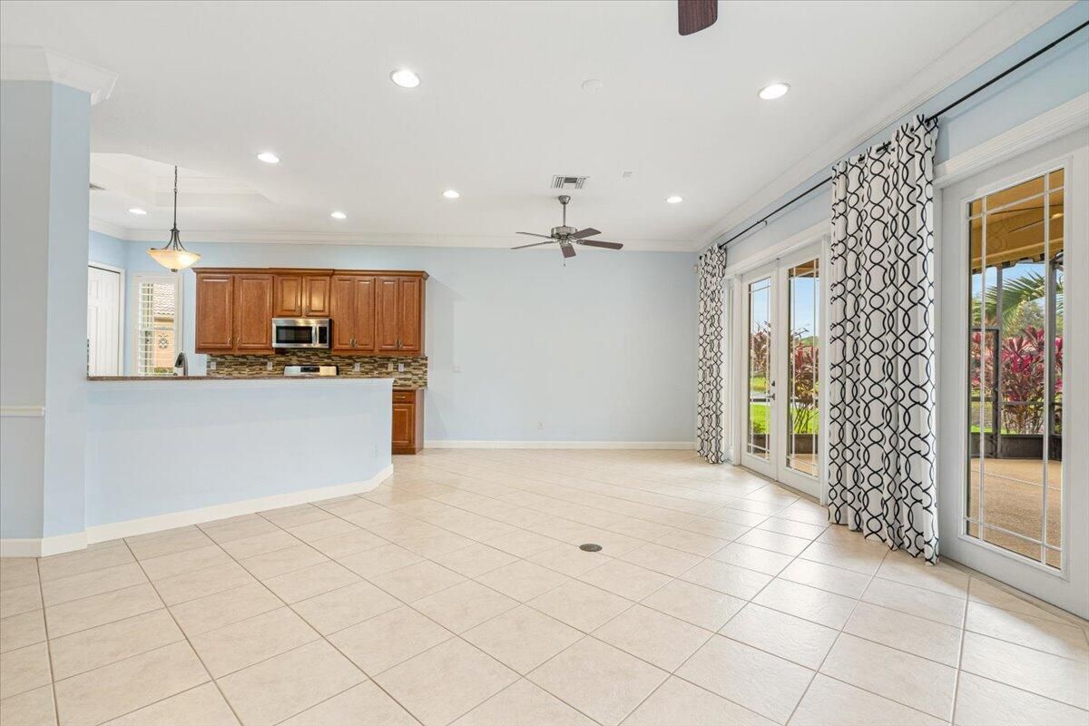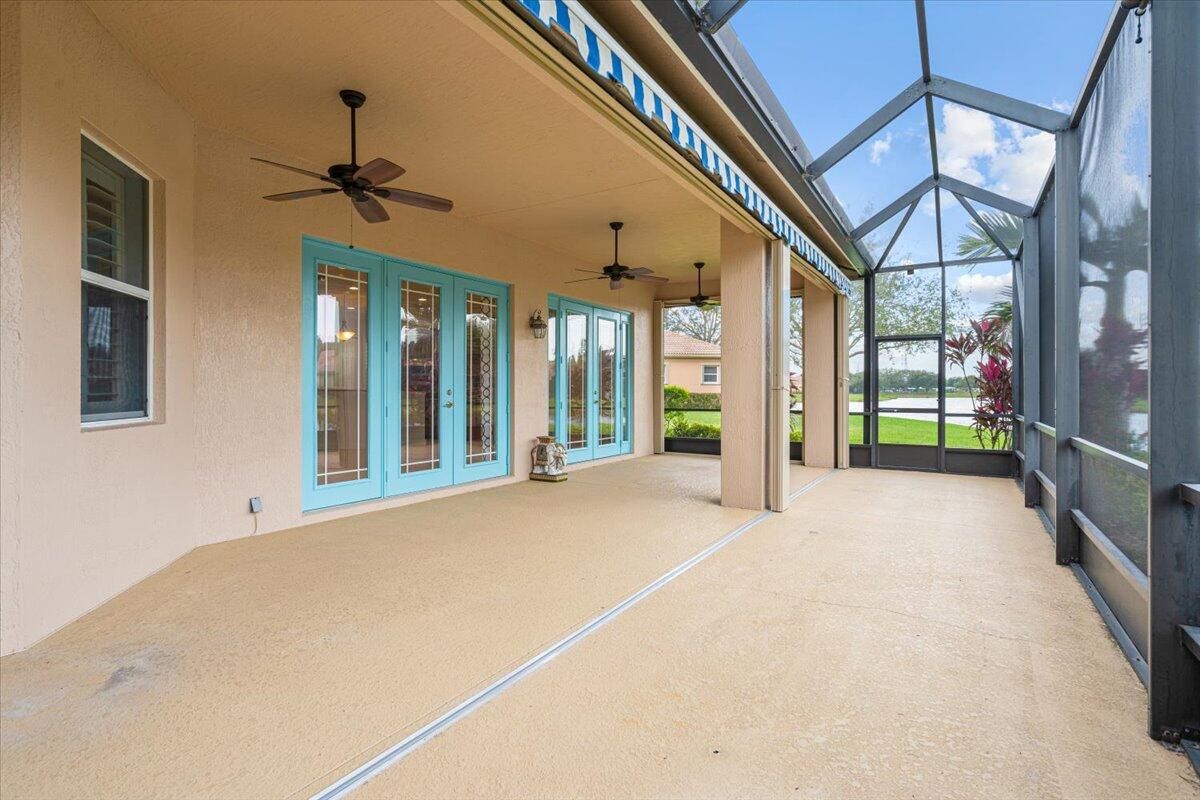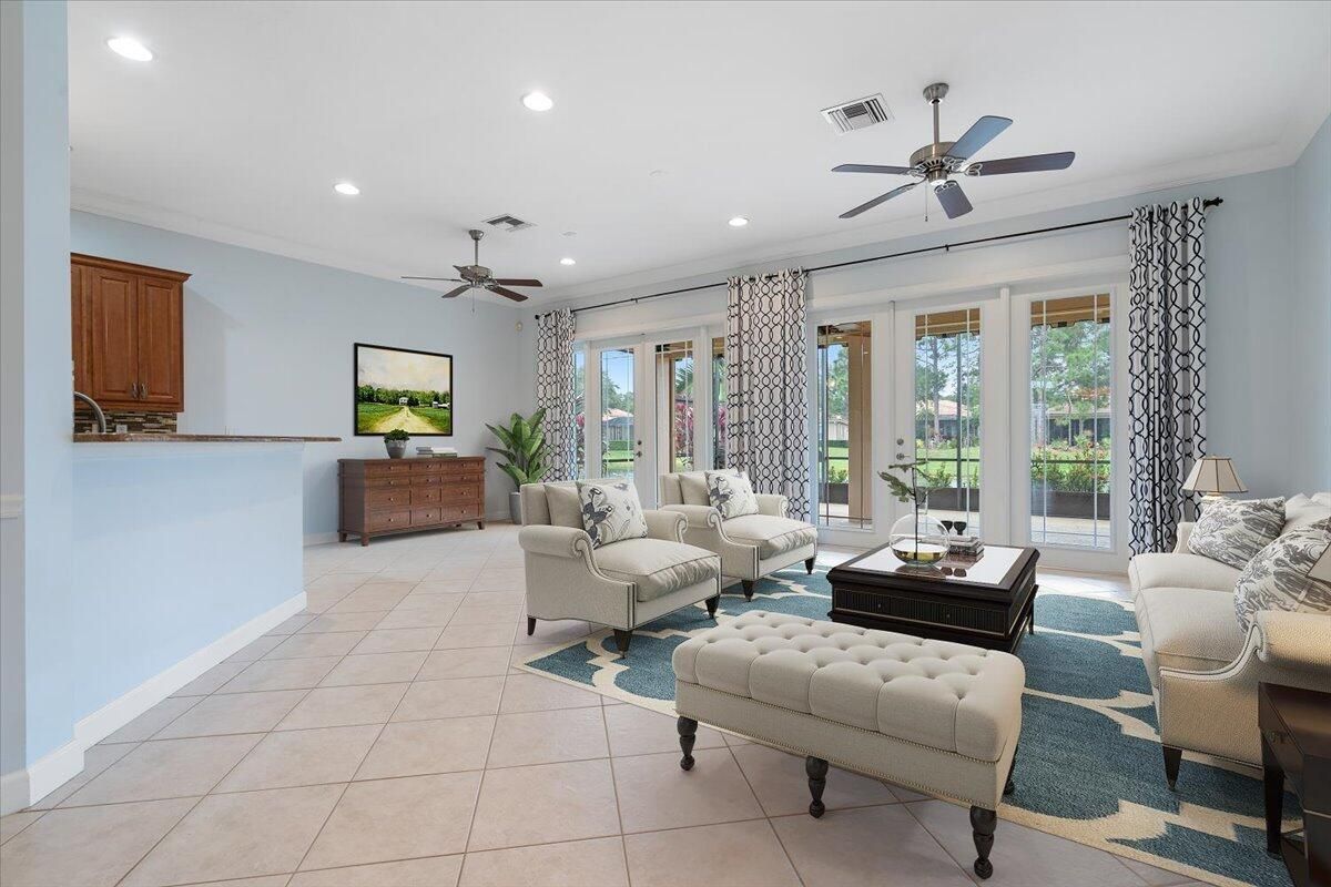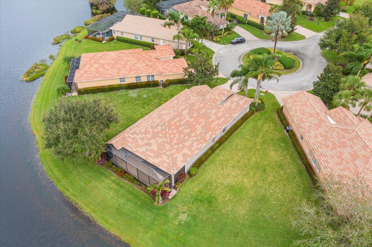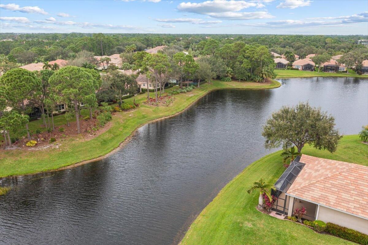 PGA VILLAGE, NESTLED ON A LARGE CUL-DE-SAC LOT offering Pirvacy & BEAUTIFUL WATER VIEWS! This well-maintained home features a spacious, open floor plan with 2 BRS + a generous den, complete with pocket dble French doors. The home boasts 3 full baths, including a cabana bath off the primary suite. The heart of the home is the kitchen, featuring granite, ample cabinetry & counter space, & a propane range, perfect for cooking & entertaining. Elegant wood moldings add charm throughout, while French doors line the back, opening up to an extended, covered & screened lanai overlooking the serene water view. The oversized garage provides plenty of space for storage & vehicles. Great golf available & access to a Clubhouse with pool, fitness, tennis, pickleball & a full calendar of activities.