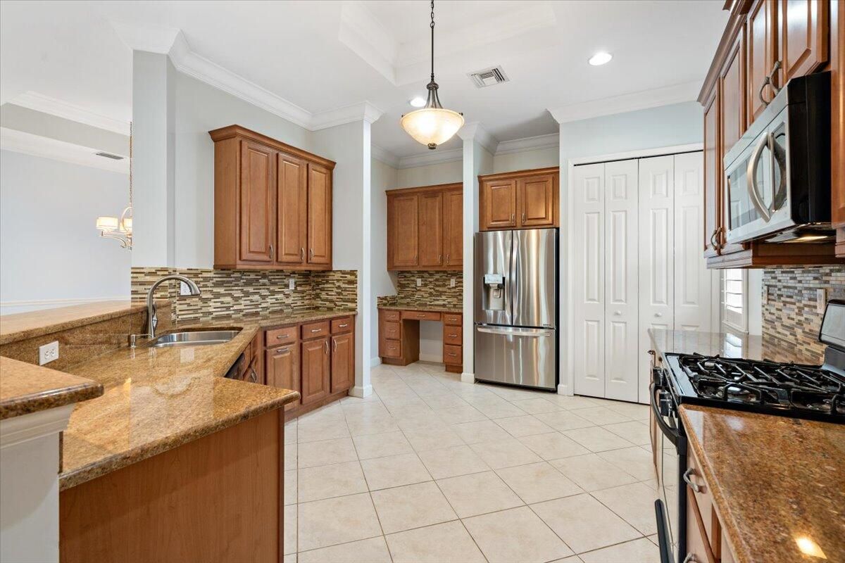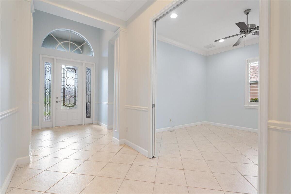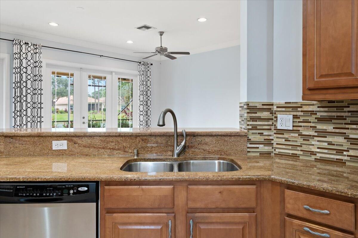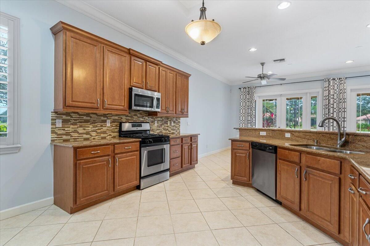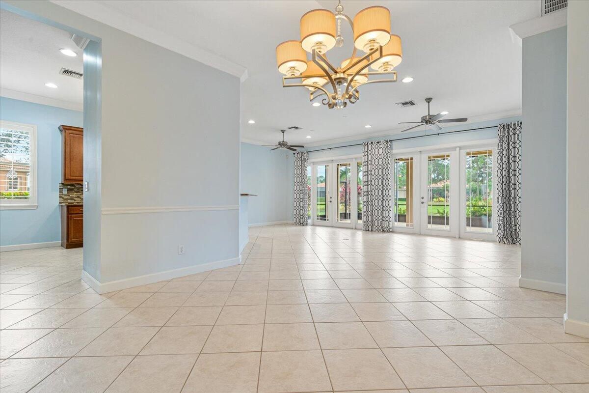 PGA VILLAGE, NESTLED ON A LARGE CUL-DE-SAC LOT offering Pirvacy & BEAUTIFUL WATER VIEWS! This well-maintained home features a spacious, open floor plan with 2 BRS + a generous den, complete with pocket dble French doors. The home boasts 3 full baths, including a cabana bath off the primary suite. The heart of the home is the kitchen, featuring granite, ample cabinetry & counter space, & a propane range, perfect for cooking & entertaining. Elegant wood moldings add charm throughout, while French doors line the back, opening up to an extended, covered & screened lanai overlooking the serene water view. The oversized garage provides plenty of space for storage & vehicles. Great golf available & access to a Clubhouse with pool, fitness, tennis, pickleball & a full calendar of activities.