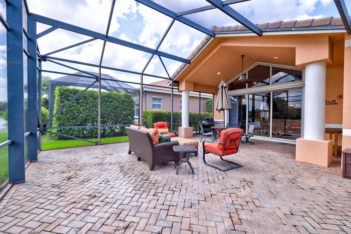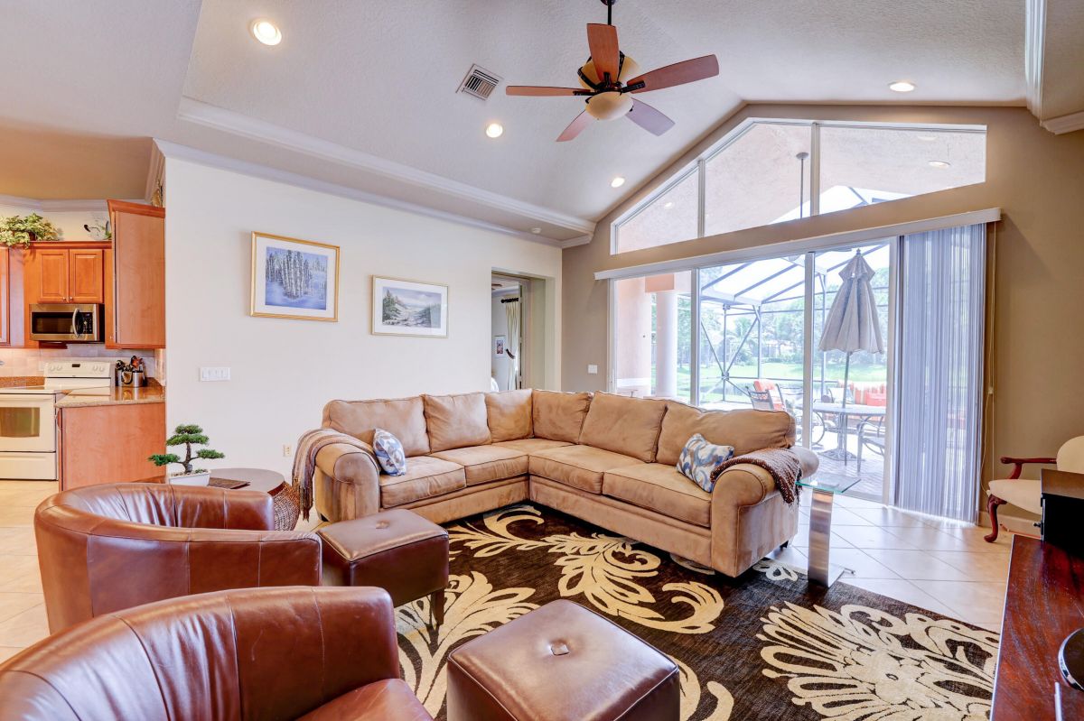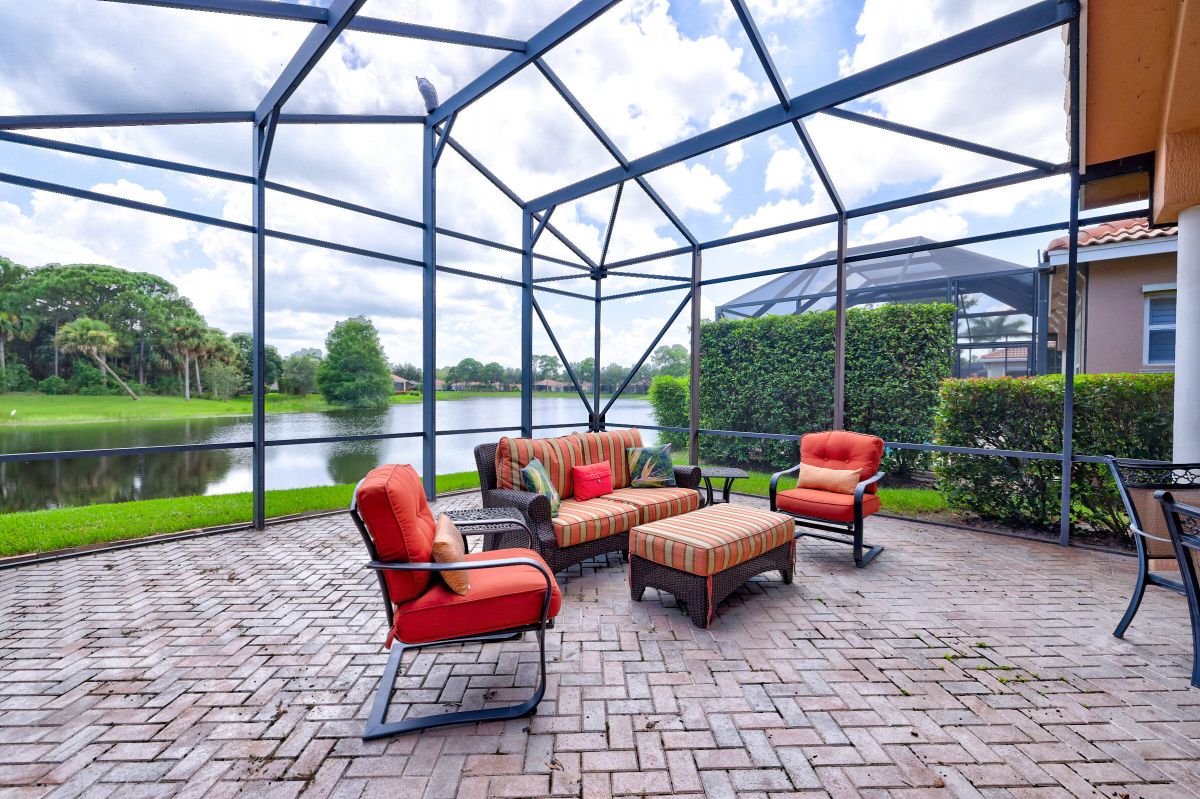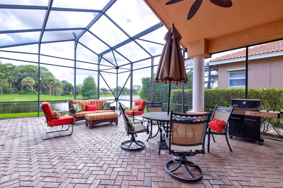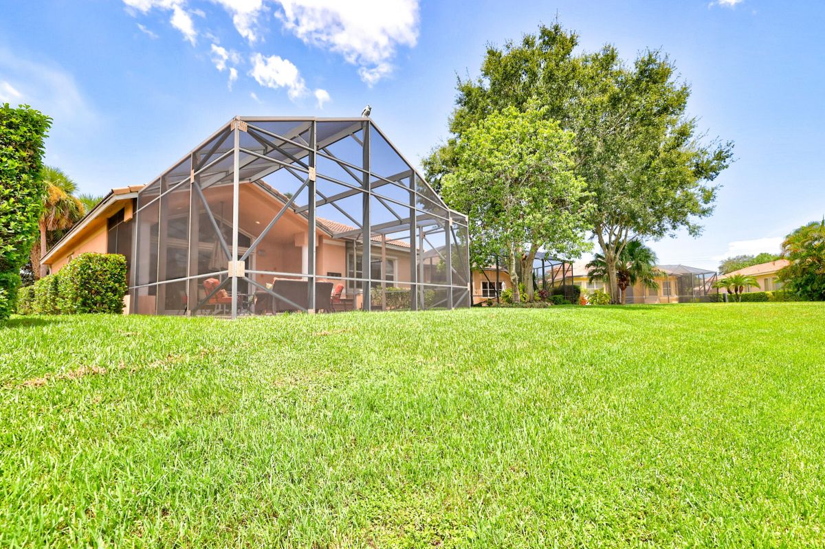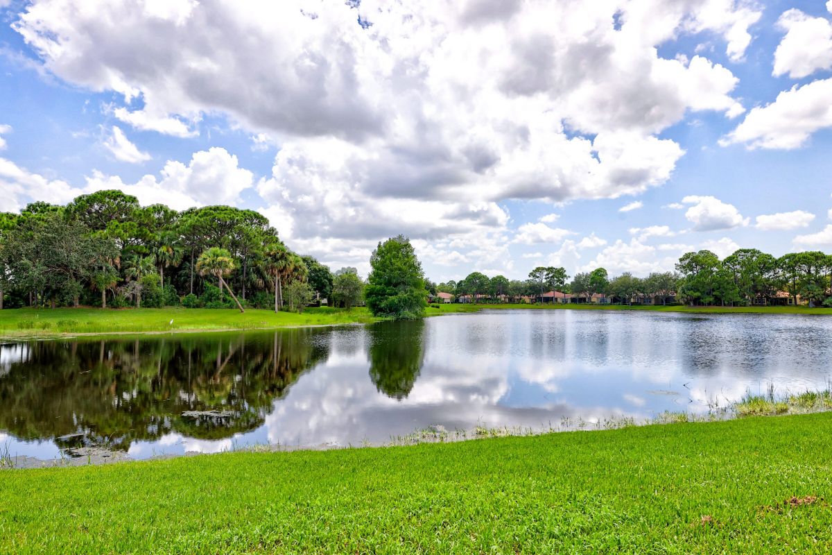 Lovely Home in PGA Village offers 2-BR + Den, 2-Bath, 2-car garage and a well-designed layout with ample space. Open Floorplan features vaulted ceiling with transom windows adding a touch of elegance. Enjoy Entertaining Family & Friends in the Spacious Kitchen: ample cabinets, granite, tile backsplash, pantry. closet. Oversized Primary Suite features Luxurious Bath - soaking tub, walk-in shower, large vanity, dual sinks, linen closet & dual walk-in closets, custom shelving. Enjoy Florida Living with your morning coffee on the extended, screened lanai overlooking the serene lake. Overall, this PGA Village home offers combination of functional living, desirable features, & PGA Golf Club membership available but not required thus attractive for the Florida lifestyle.