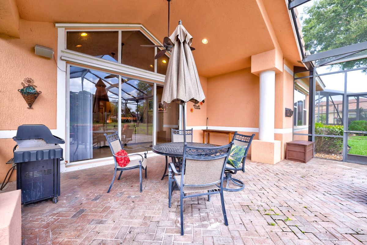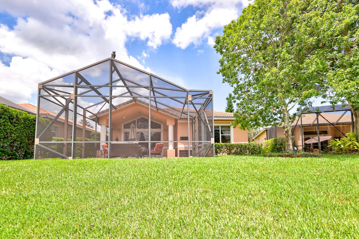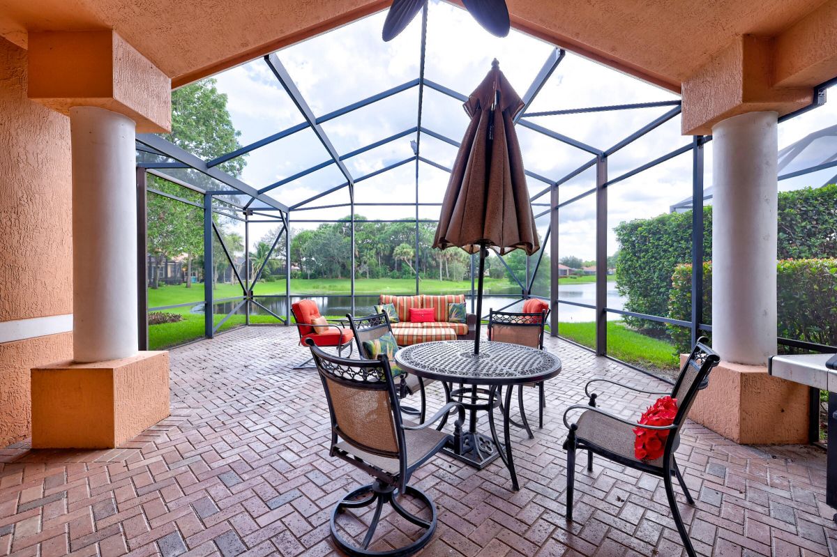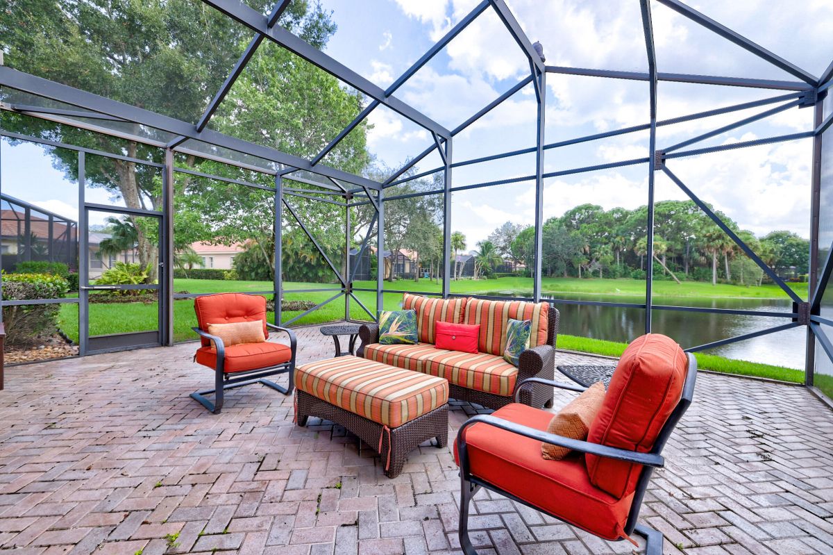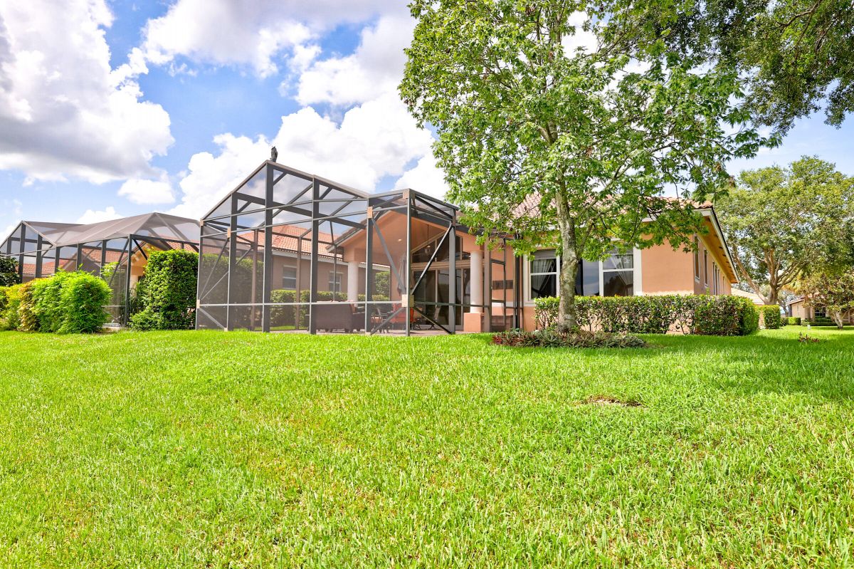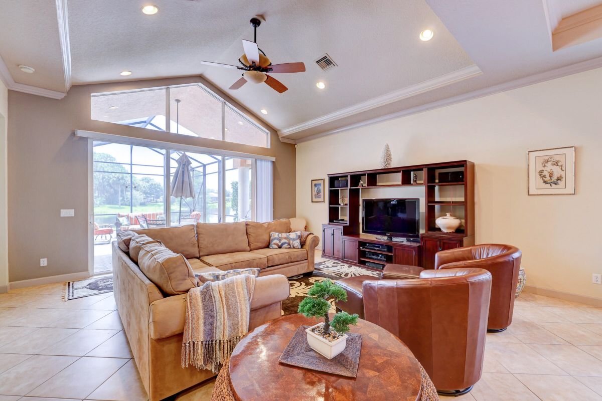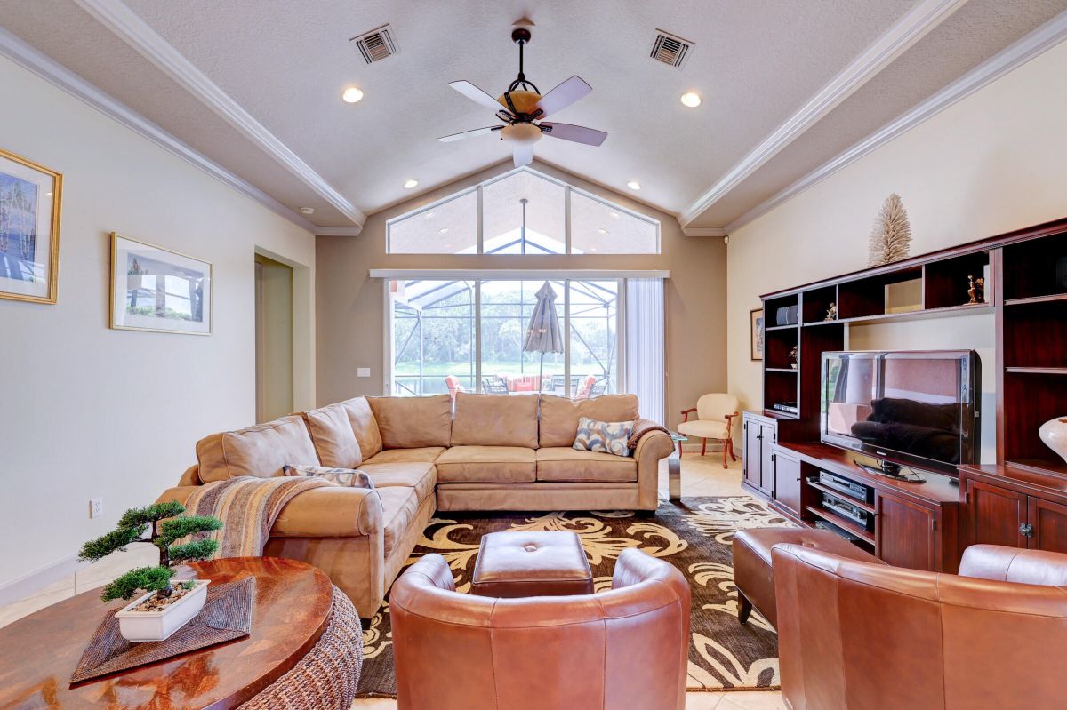 Lovely Home in PGA Village offers 2-BR + Den, 2-Bath, 2-car garage and a well-designed layout with ample space. Open Floorplan features vaulted ceiling with transom windows adding a touch of elegance. Enjoy Entertaining Family & Friends in the Spacious Kitchen: ample cabinets, granite, tile backsplash, pantry. closet. Oversized Primary Suite features Luxurious Bath - soaking tub, walk-in shower, large vanity, dual sinks, linen closet & dual walk-in closets, custom shelving. Enjoy Florida Living with your morning coffee on the extended, screened lanai overlooking the serene lake. Overall, this PGA Village home offers combination of functional living, desirable features, & PGA Golf Club membership available but not required thus attractive for the Florida lifestyle.