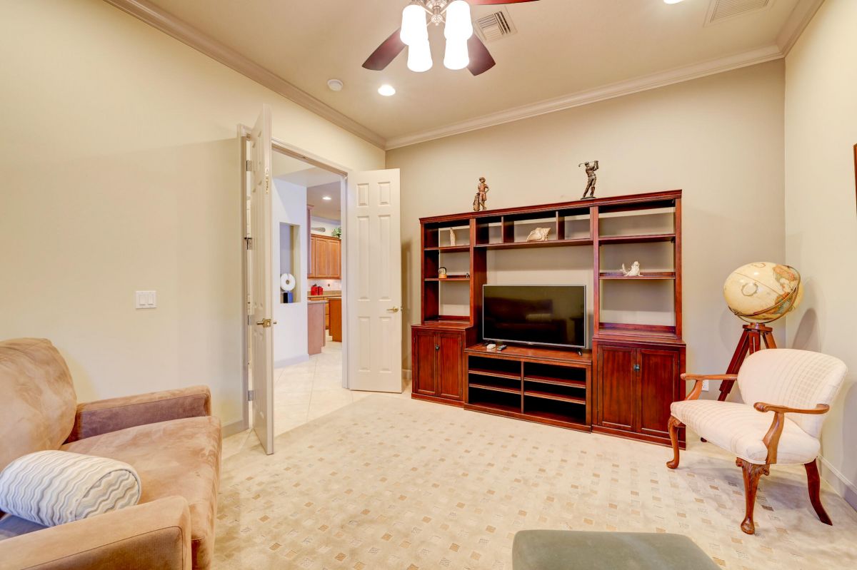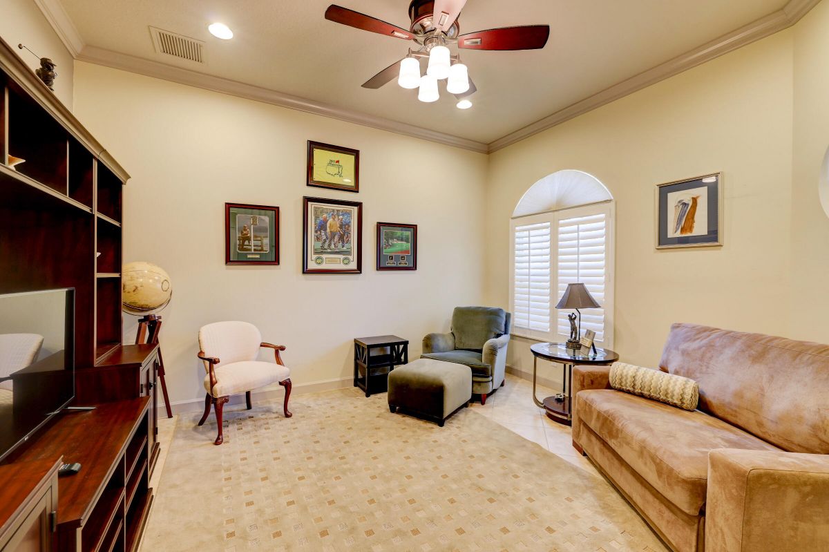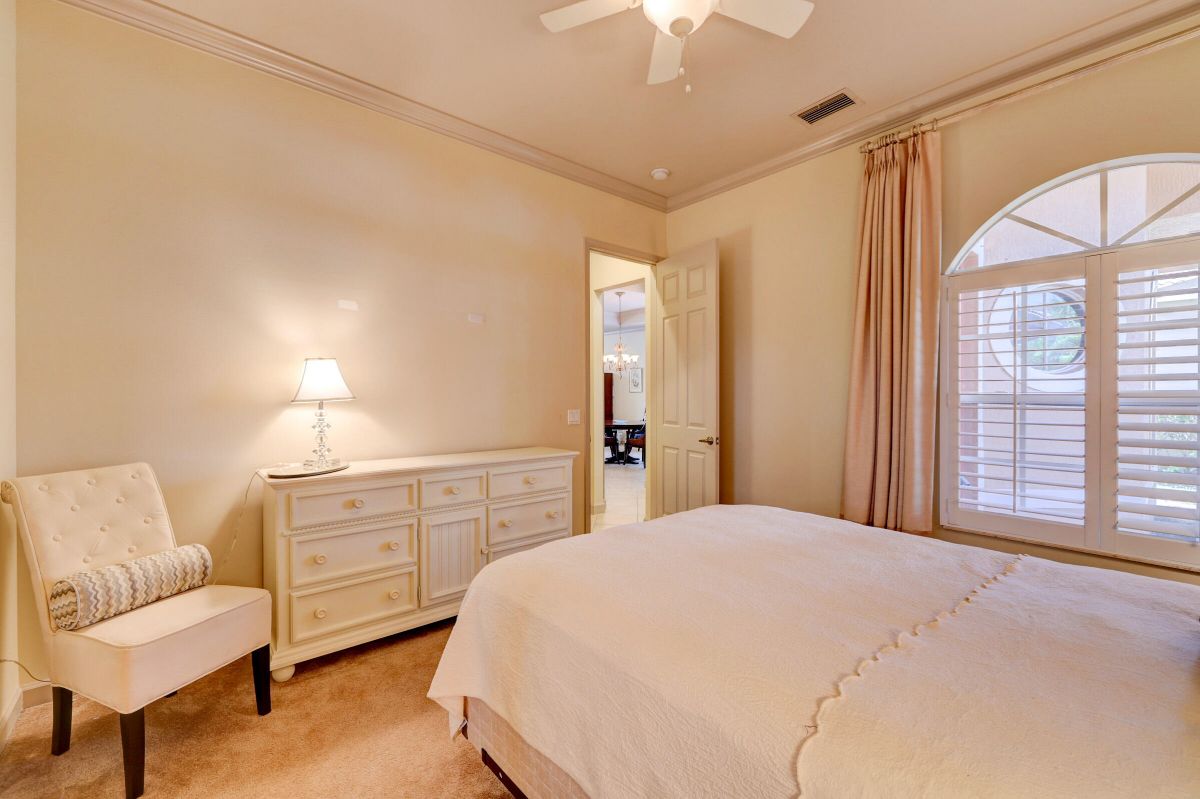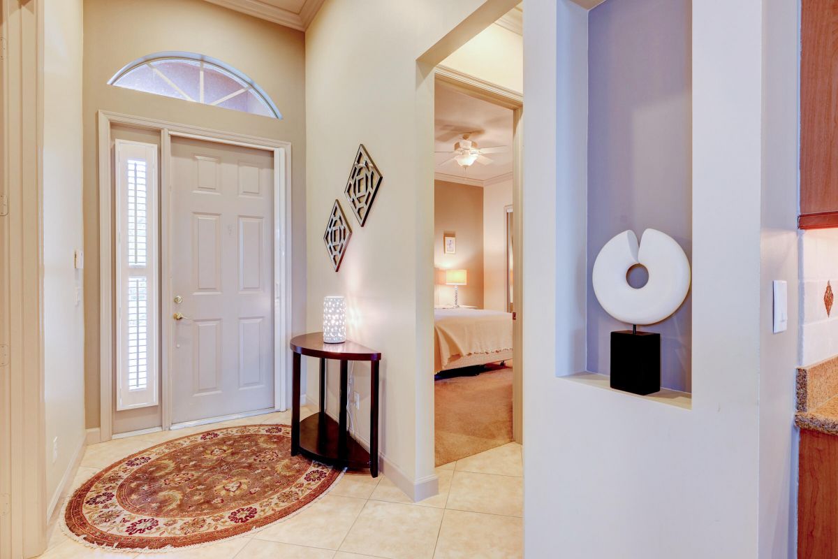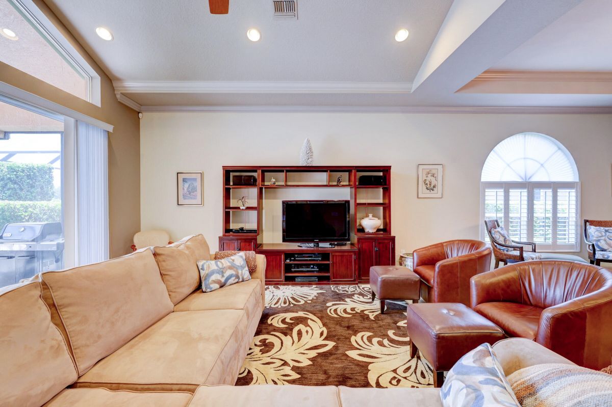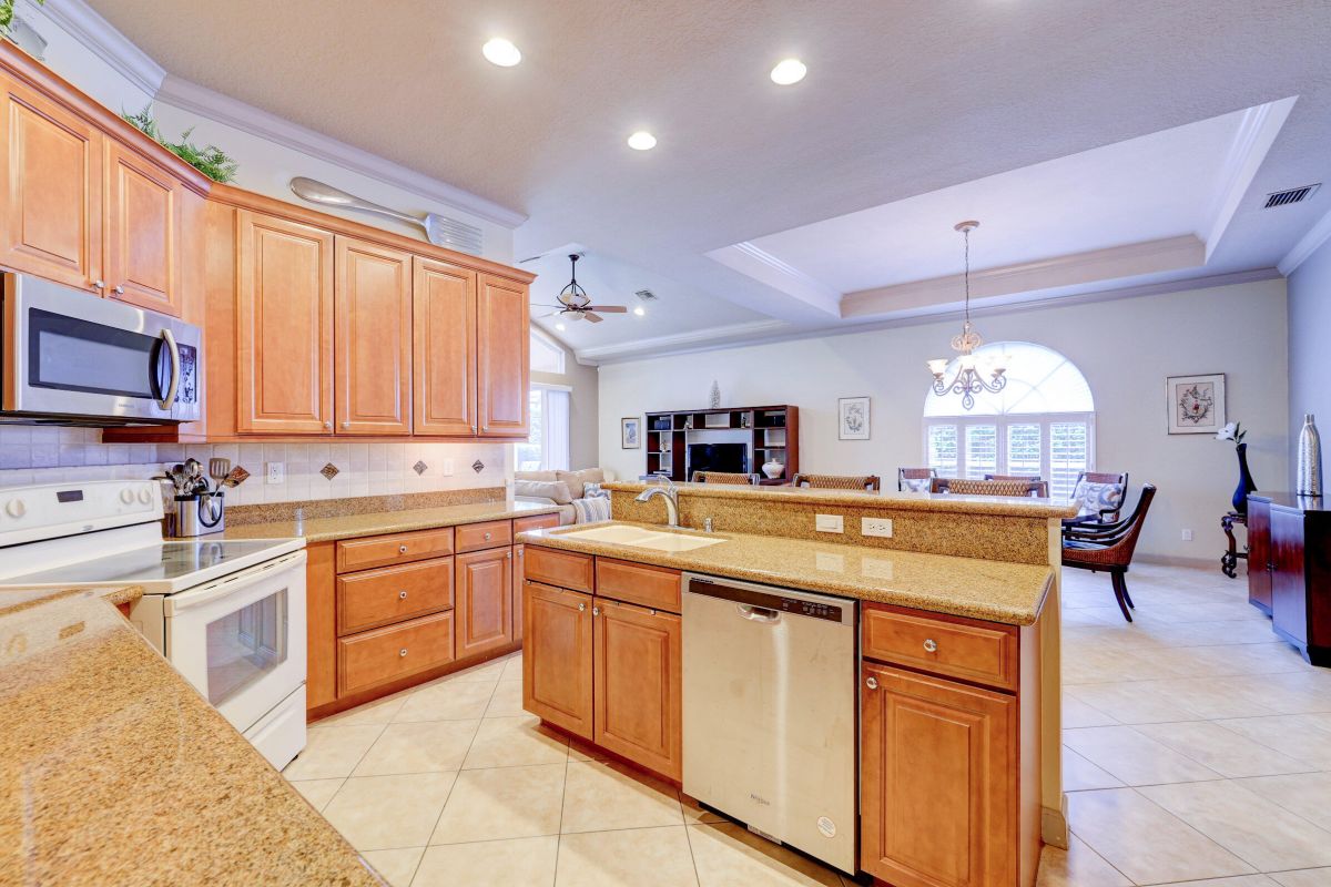 Lovely Home in PGA Village offers 2-BR + Den, 2-Bath, 2-car garage and a well-designed layout with ample space. Open Floorplan features vaulted ceiling with transom windows adding a touch of elegance. Enjoy Entertaining Family & Friends in the Spacious Kitchen: ample cabinets, granite, tile backsplash, pantry. closet. Oversized Primary Suite features Luxurious Bath - soaking tub, walk-in shower, large vanity, dual sinks, linen closet & dual walk-in closets, custom shelving. Enjoy Florida Living with your morning coffee on the extended, screened lanai overlooking the serene lake. Overall, this PGA Village home offers combination of functional living, desirable features, & PGA Golf Club membership available but not required thus attractive for the Florida lifestyle.