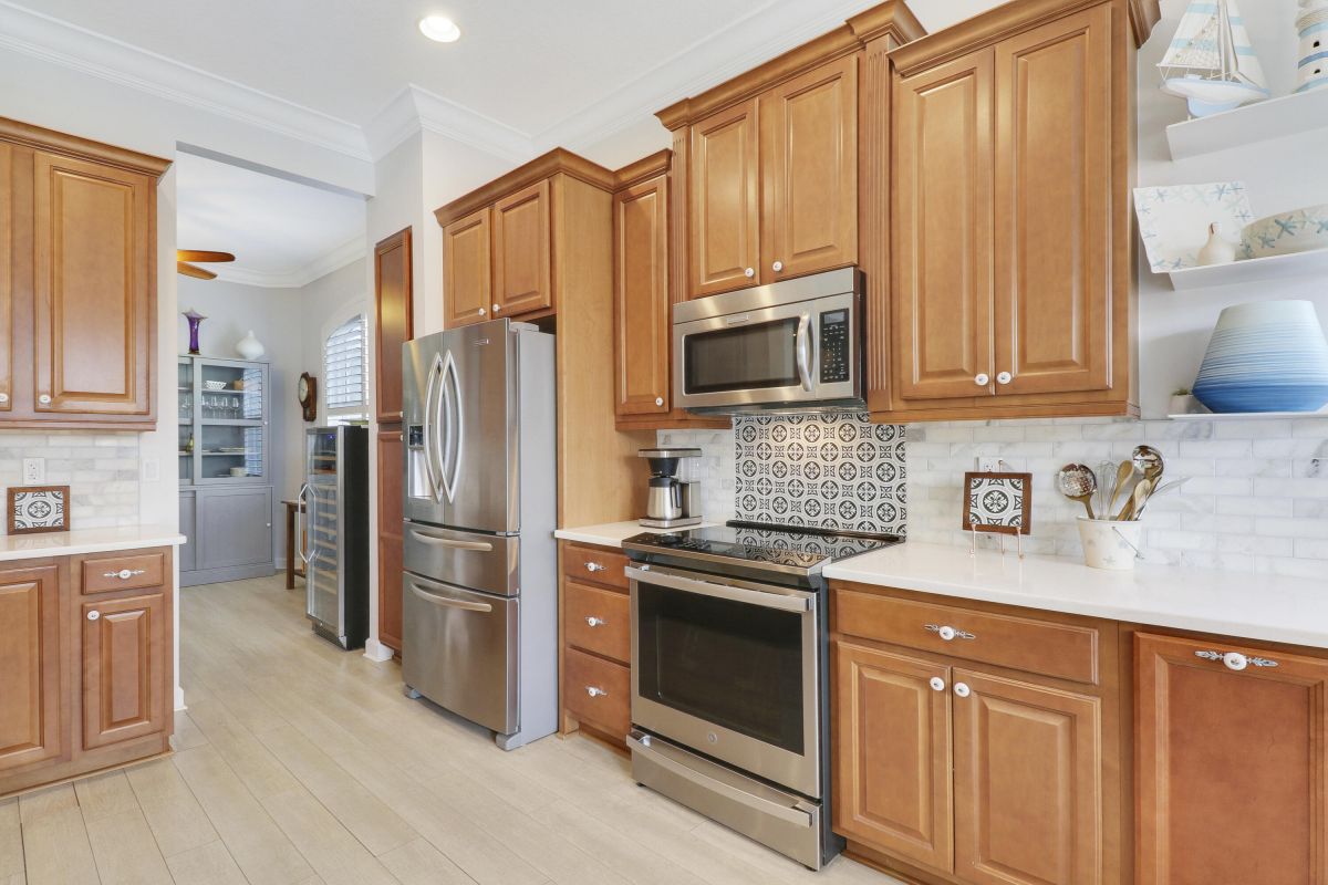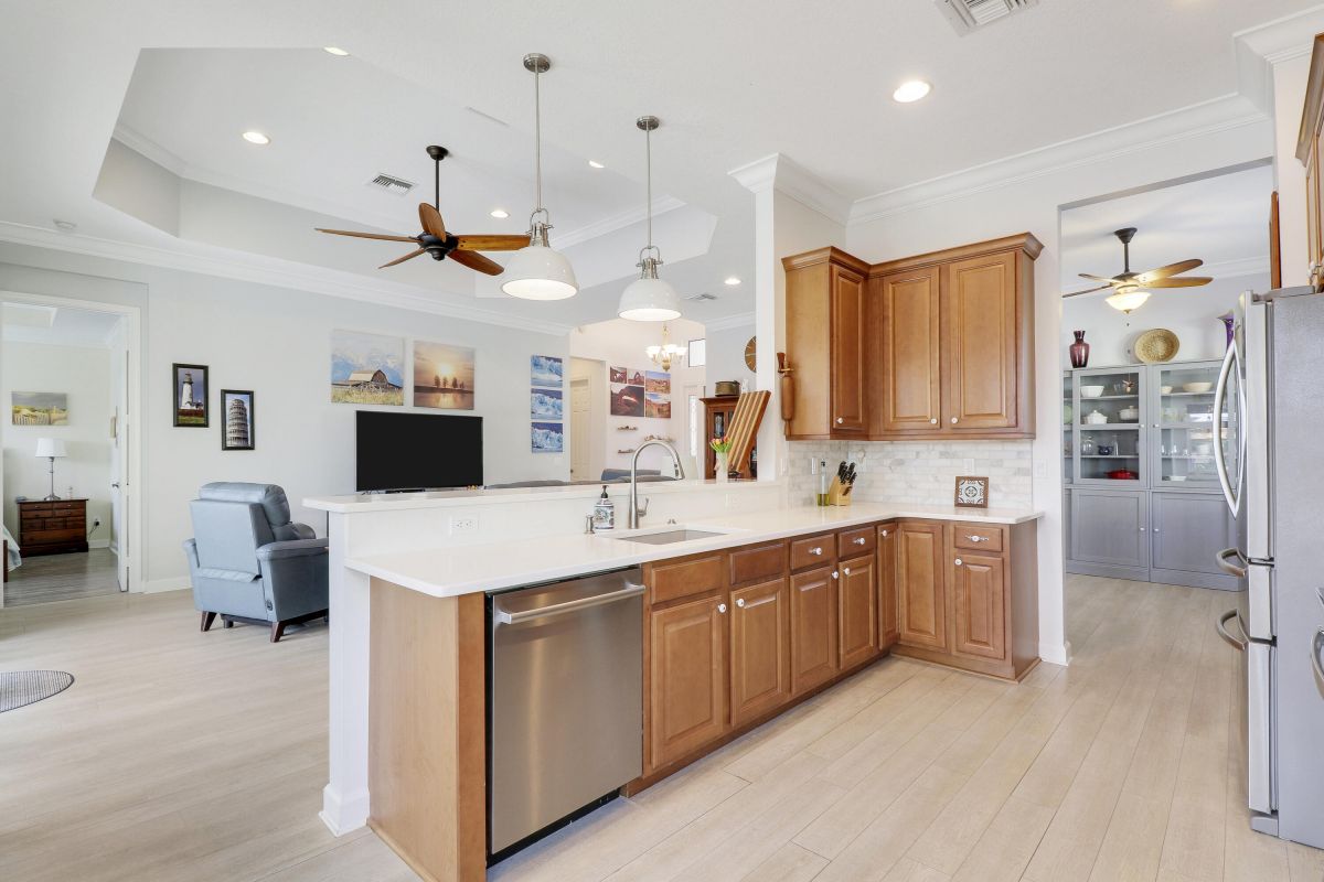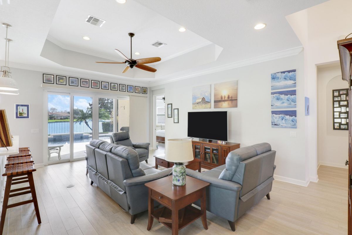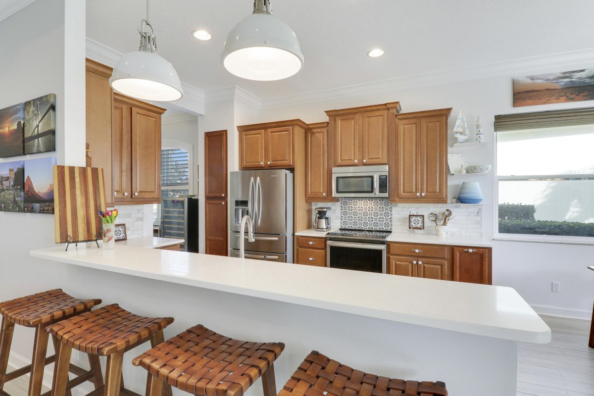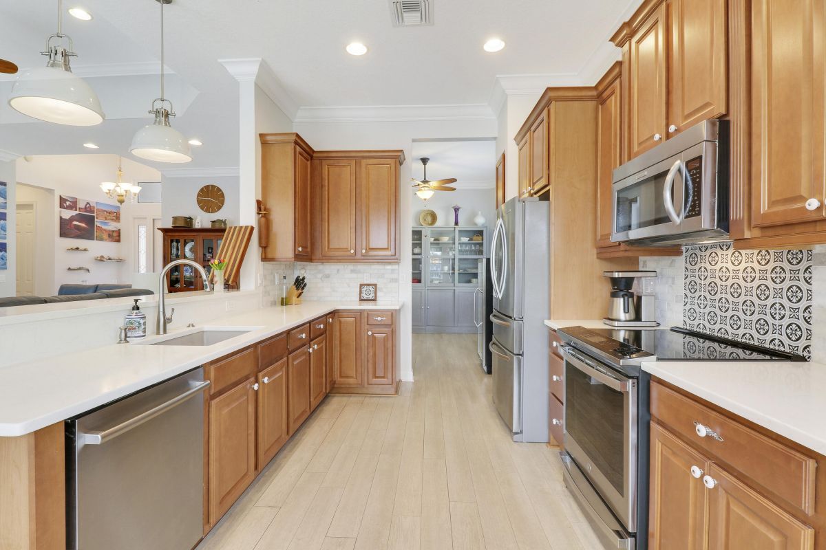 RARE OPPORTUNITY! POOL HOME WITH IMPACT GLASS WINDOWS & DOORS IN PGA VILLAGE! This 3BR/2BA/2CG home has the perfect combination! Long lake views will catch your eye as soon as you come through the door. Hard surface flooring runs t/o most of the home. Recently updated kitchen overlooks the lake and features quartz counters, single basin sink, breakfast bar with extended counter space, pendant lighting, induction stove, tile backsplash, pullouts in the pantry, dining nook and SS appliances. The master suite overlooks the back yard and features charming bay window, crown molding, dual closets, tray ceiling and ensuite w/ dual vanities, soaking tub and frameless glass shower. Two guest bedrooms share an updated hall bathroom and the laundry room has front loading machines and utility sink.